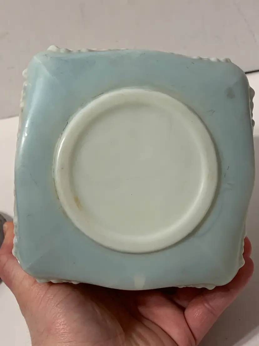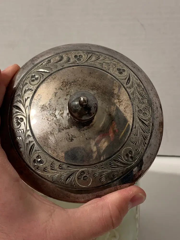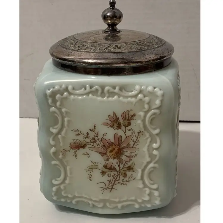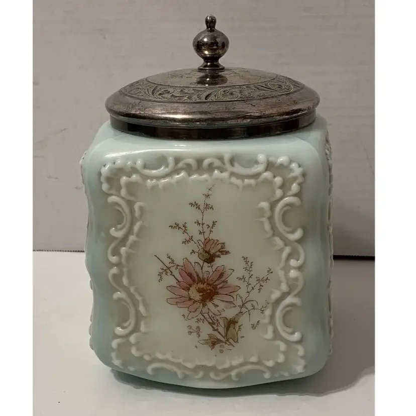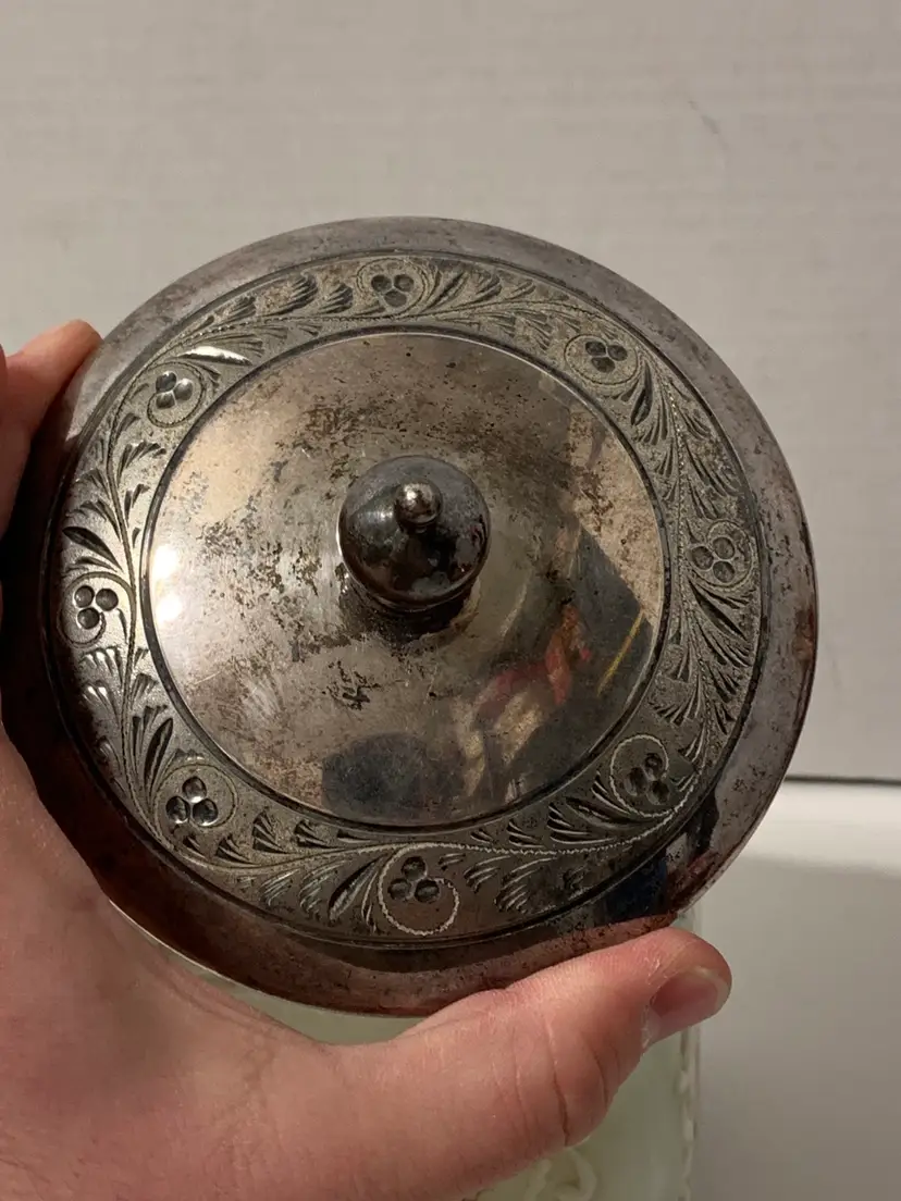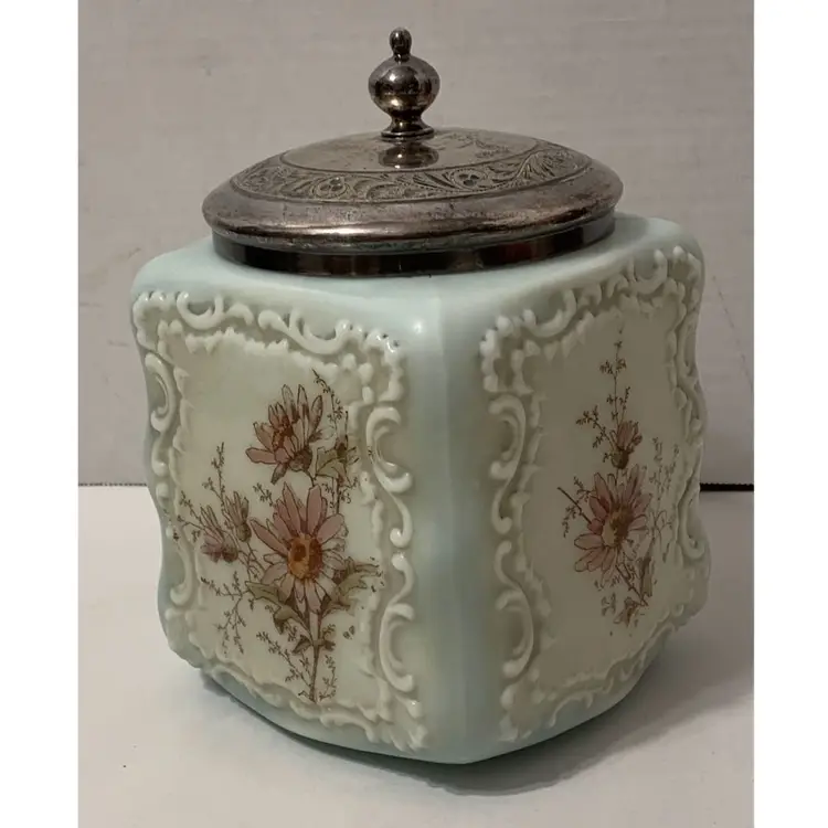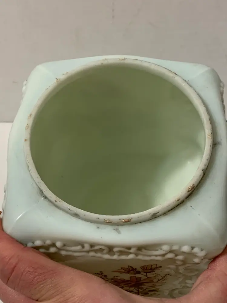 Nice piece. Original rim and lid are missing. Current lid is a replacement that just fits over the rim, not a snug fit. Measures 6” tall by 5” wide. Free from major chips or cracks. There are some flea bites along the rim. Sold as is.