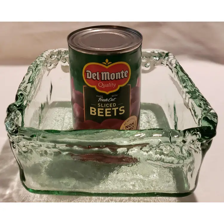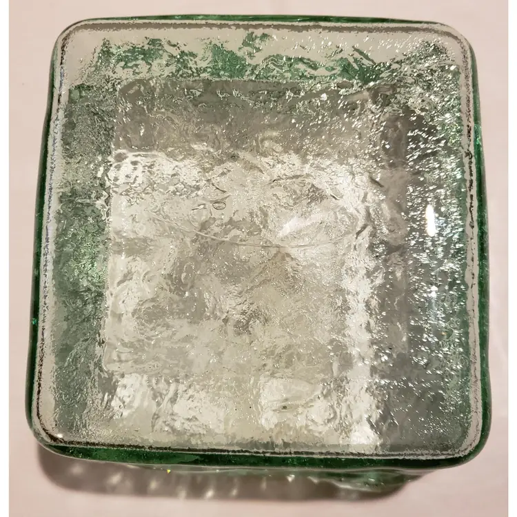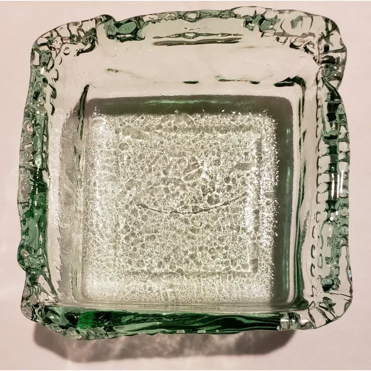 This is a heavy, thick recycled glass dish measuring 7" x 7" and is 3" deep. Textured inside and smooth outside. No chips. There is a mark on the inside bottom that feels to me like a mold indention. See last photo. Beautiful dish. Not signed.