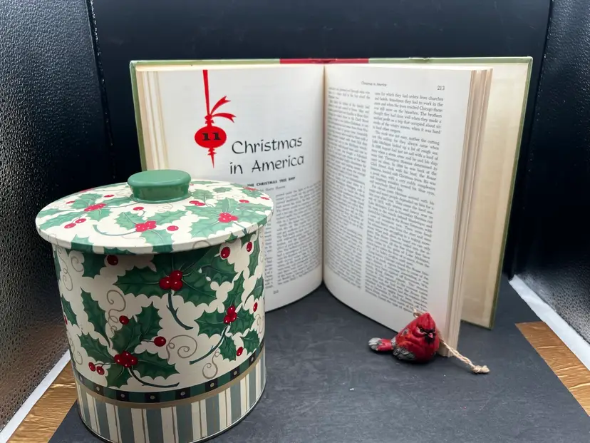 Vignette #5 Includes A Vintage Hard Cover ‘The Complete Christmas Book’ Published By Franklin Watts, Illustrated By William Ronin A Vintage Christmas Tin. Santa’s Workbench Holly And Berry Pattern 1999 Jo-Ann Stores, Inc. And An Adorable Cardinal Figurine.