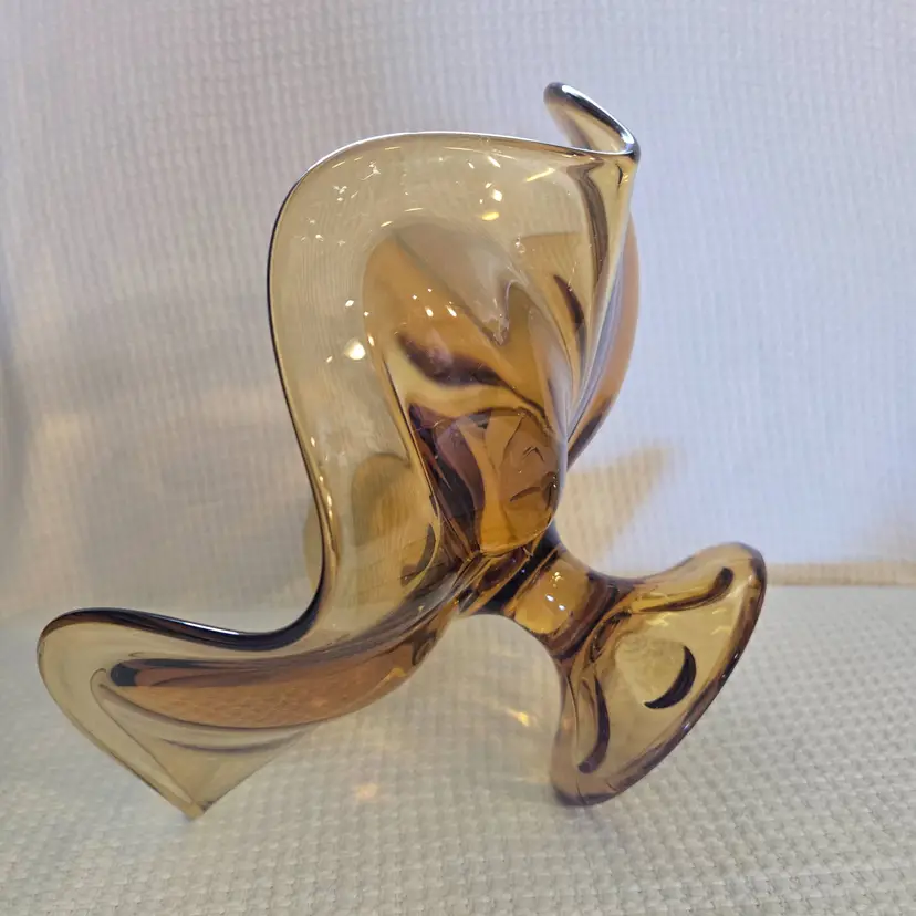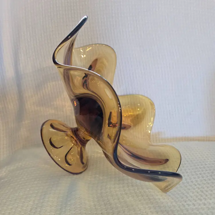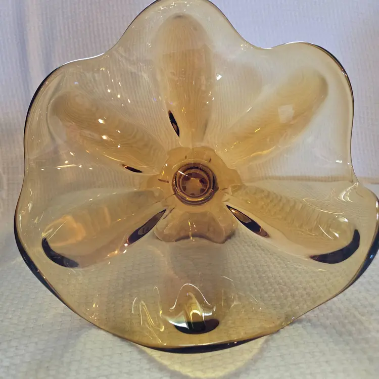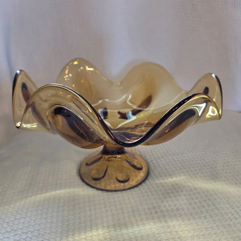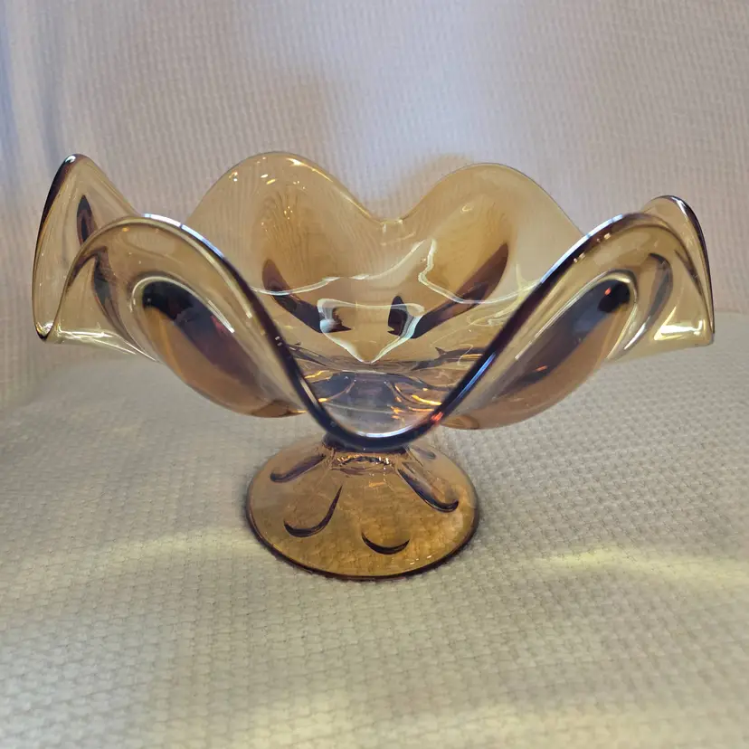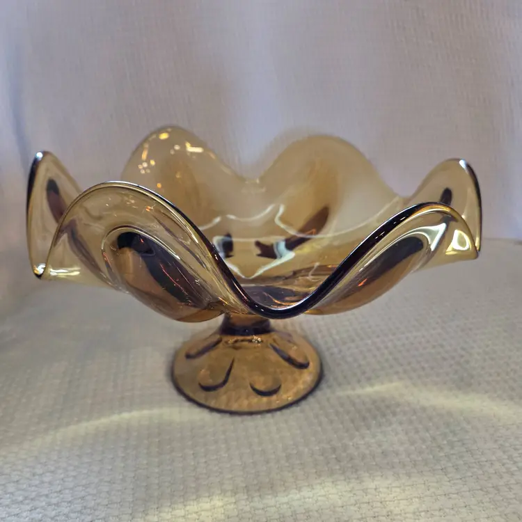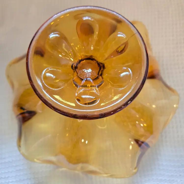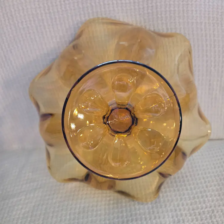 MCM Amber round shape ruffled and all over pattern is perfect for any decor. Part of the Epic 6 line by Viking Glass. Original- Unmarked. Probably had a sticker that is no longer there.perfect for candy or storing any kind of goodies. 6" tall, and 9 1/4" wide across the top, and 4" at the base. No chips , cracks, or repairs.