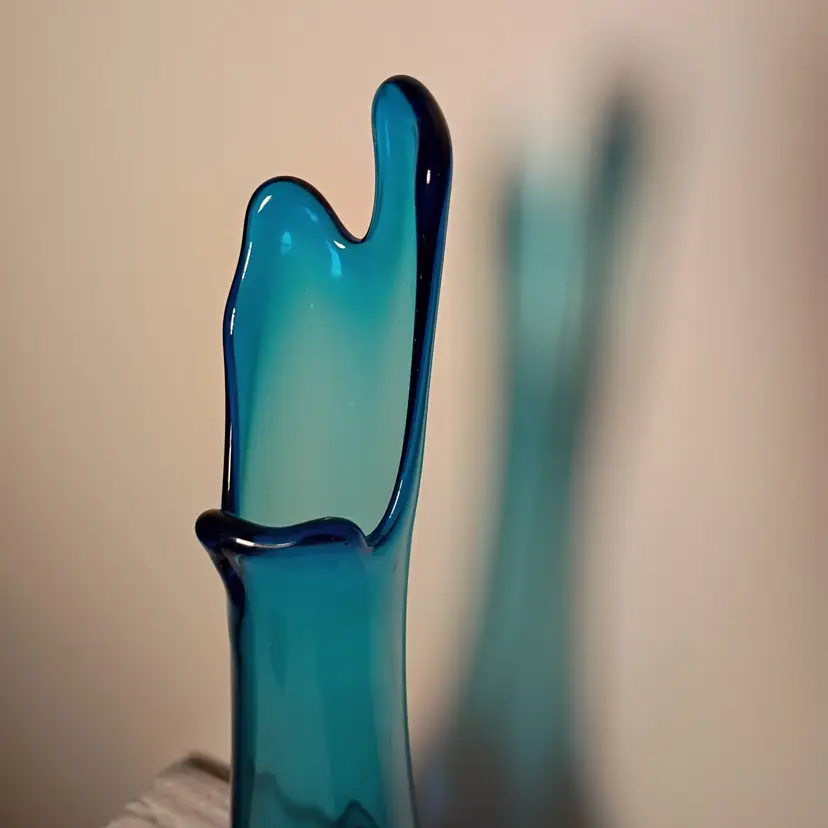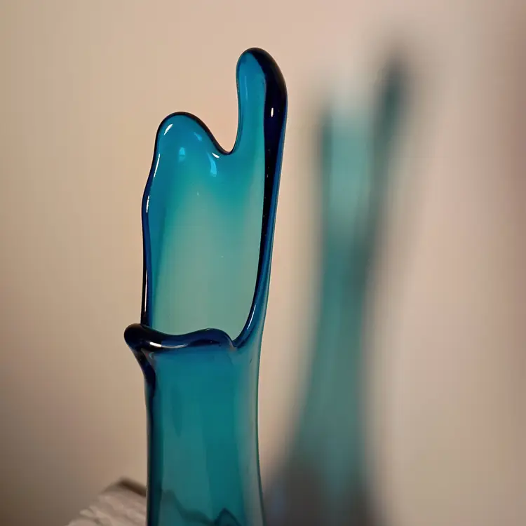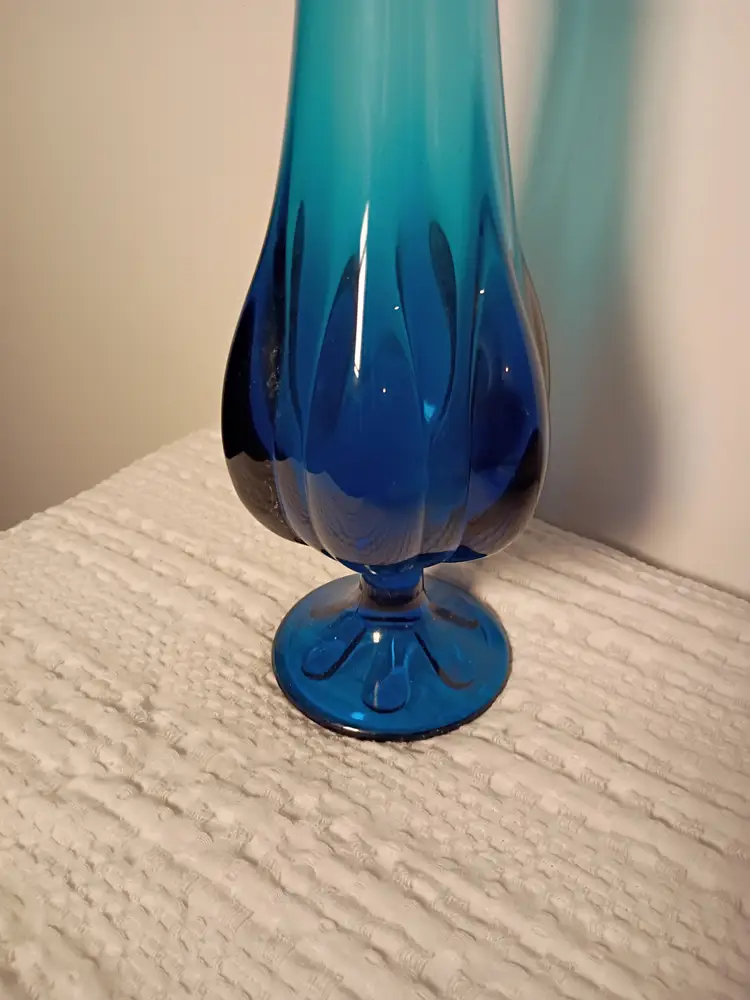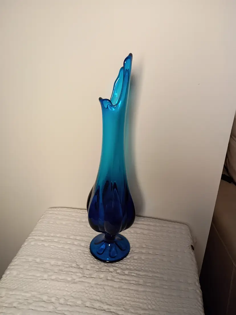 It's a fantastic 18" MCM Viking bluenique 6 petal swung vase with 3 fingers and a 4.5" mouth. It's in excellent vintage condition with no chips or cracks.
