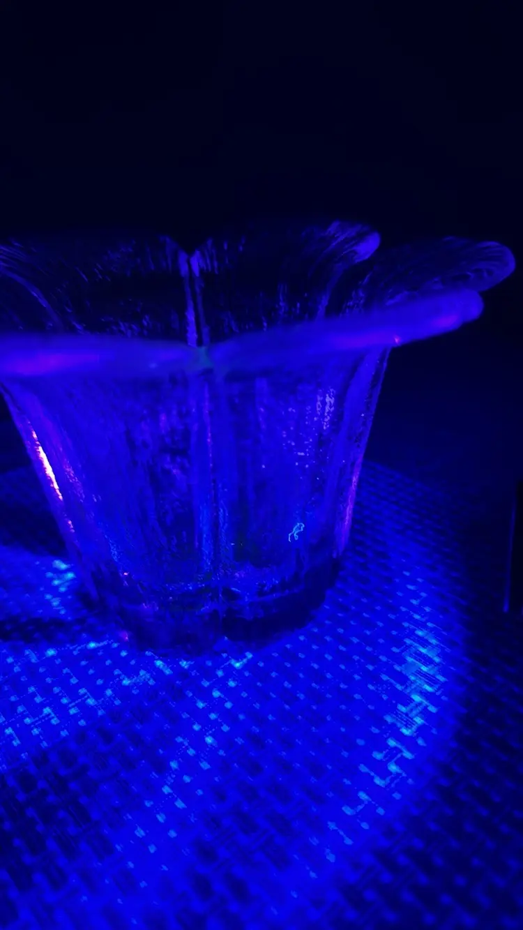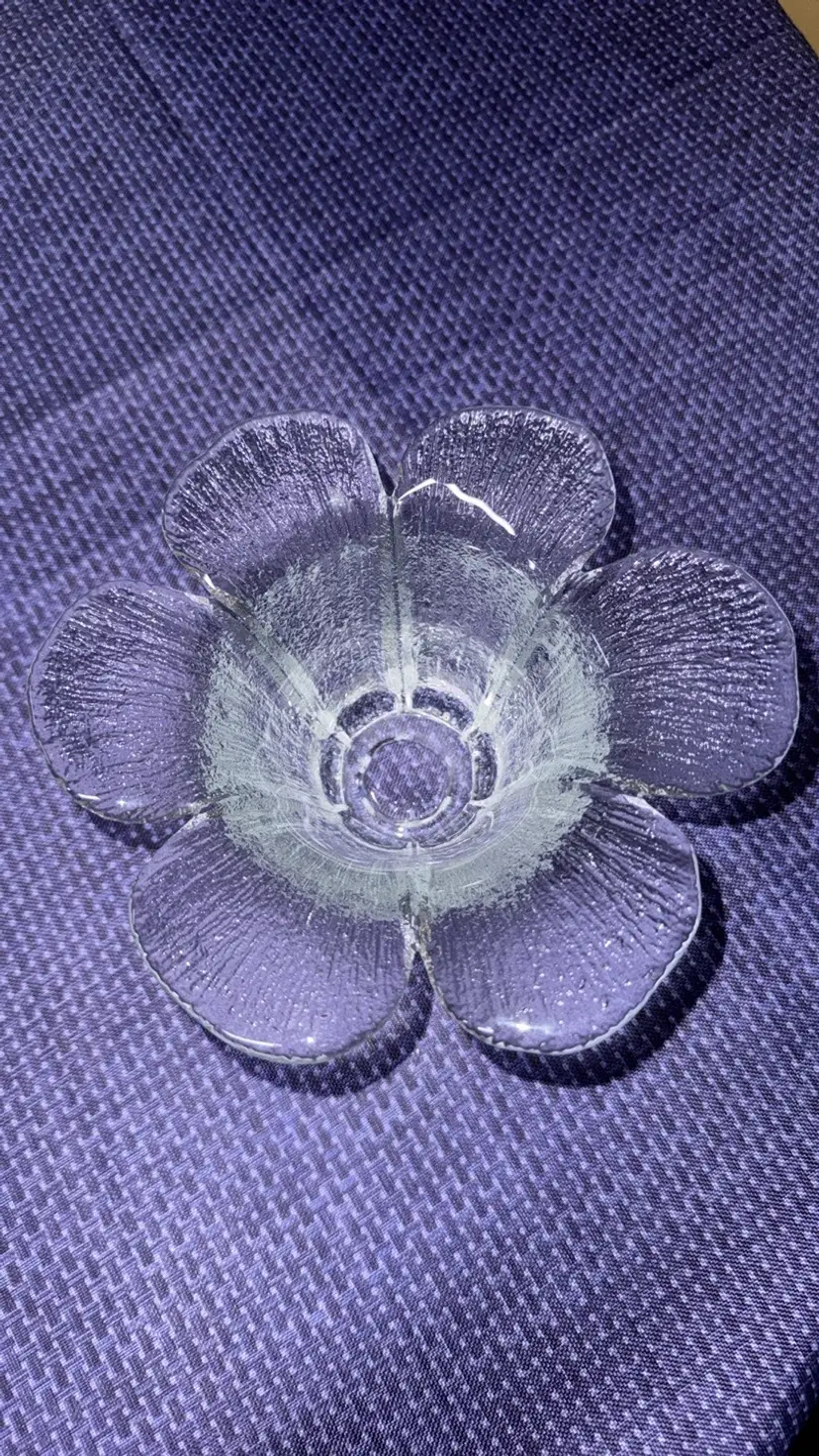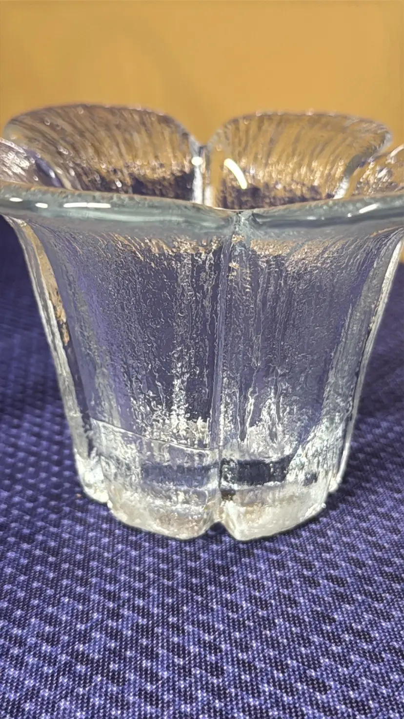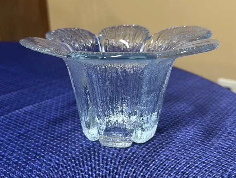 Elegant clear glass vase with a flower petal design. Perfect for home decor. Viking Clear Glass Vase Petal Flower Textured Green uranium glow under black light 3.75” tall, 6.75” diameter 3” diameter on the bottom Excellent like new condition with no breaks or chips (75279254)