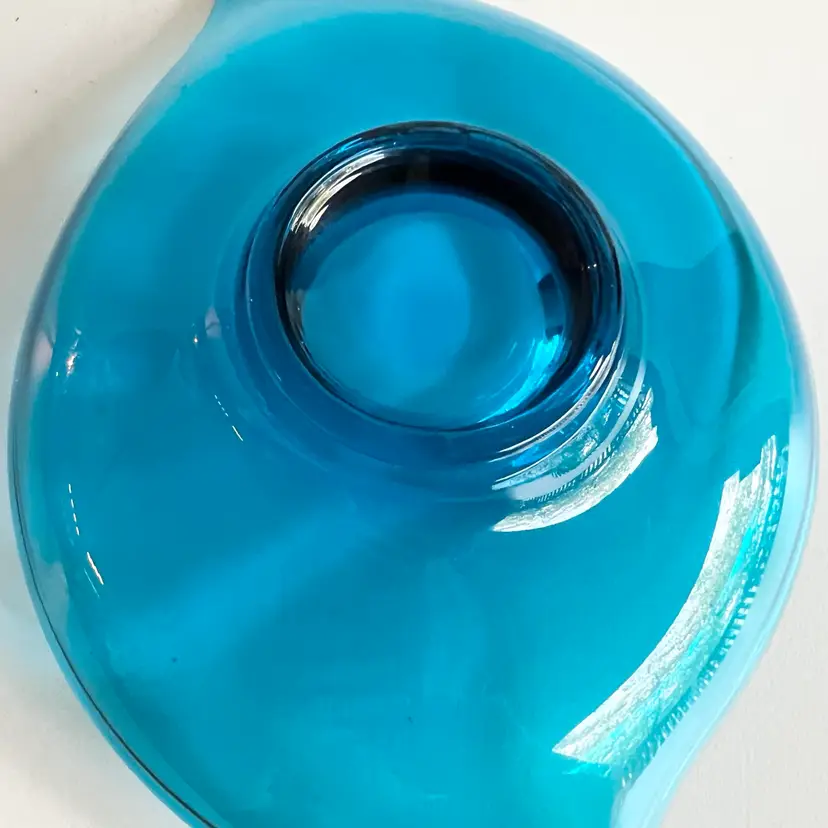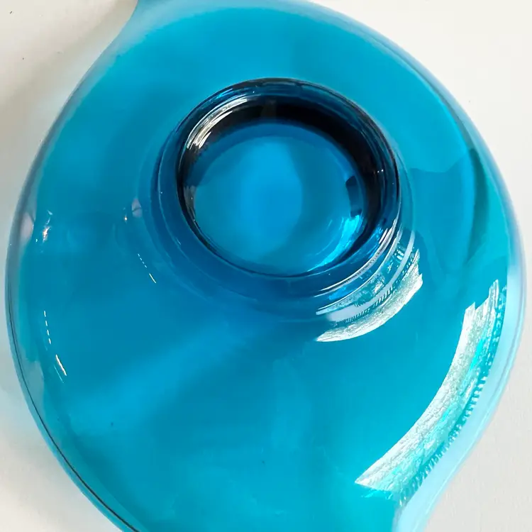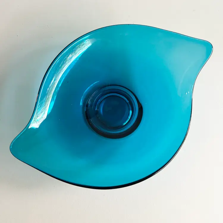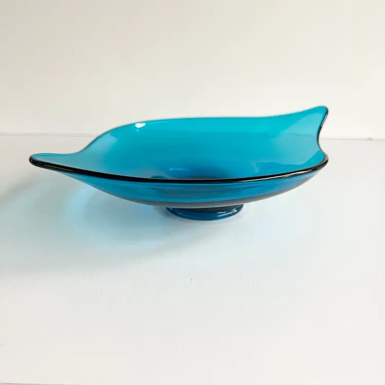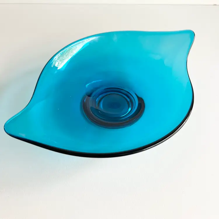 This awesome little bonbon dish in Viking Glass Bluenique is a rich turquoise teal blue. It’s curvy and very mid century, modern. It would make a great soap dish too! 8 1/2“ x 6“ x 2“ high. Ships from Canada.