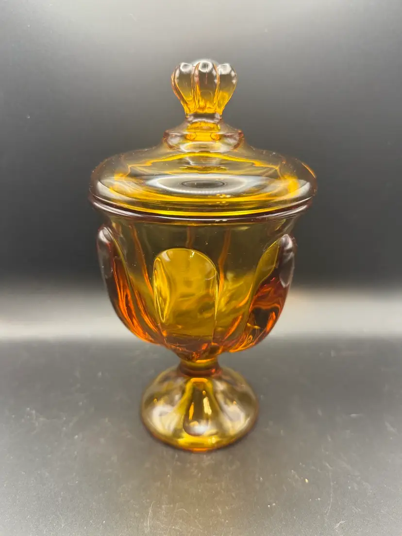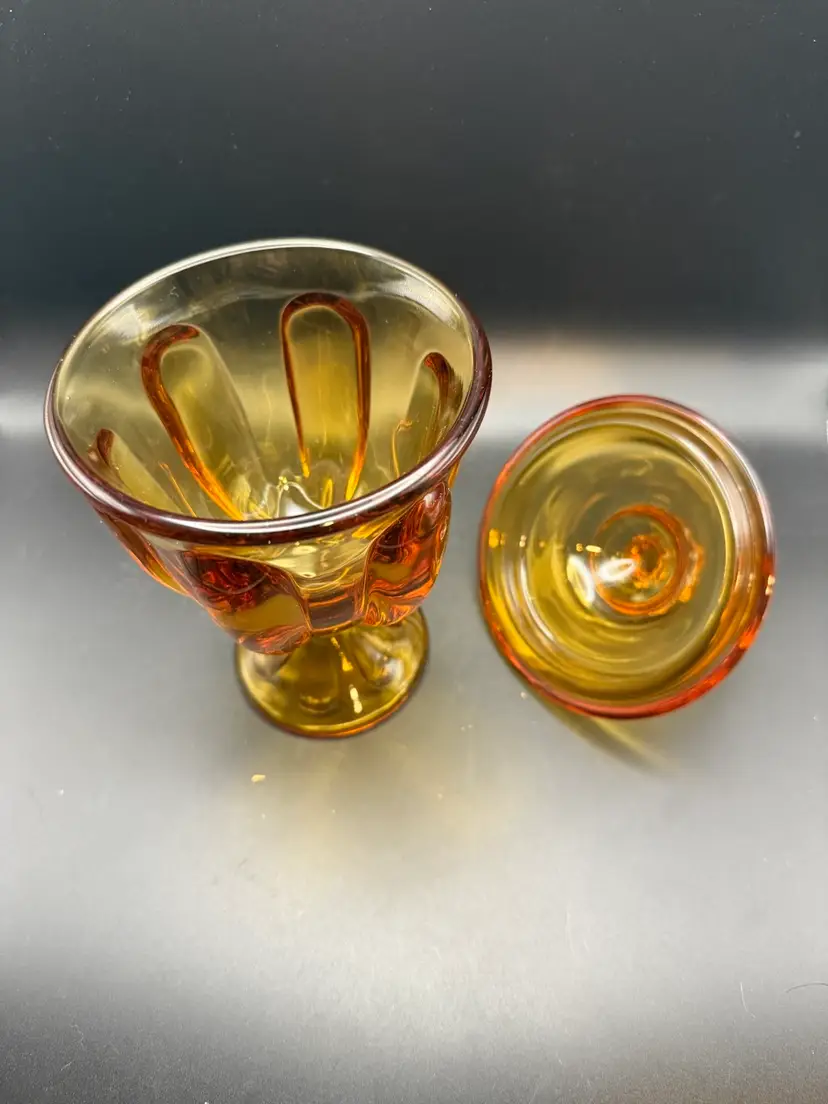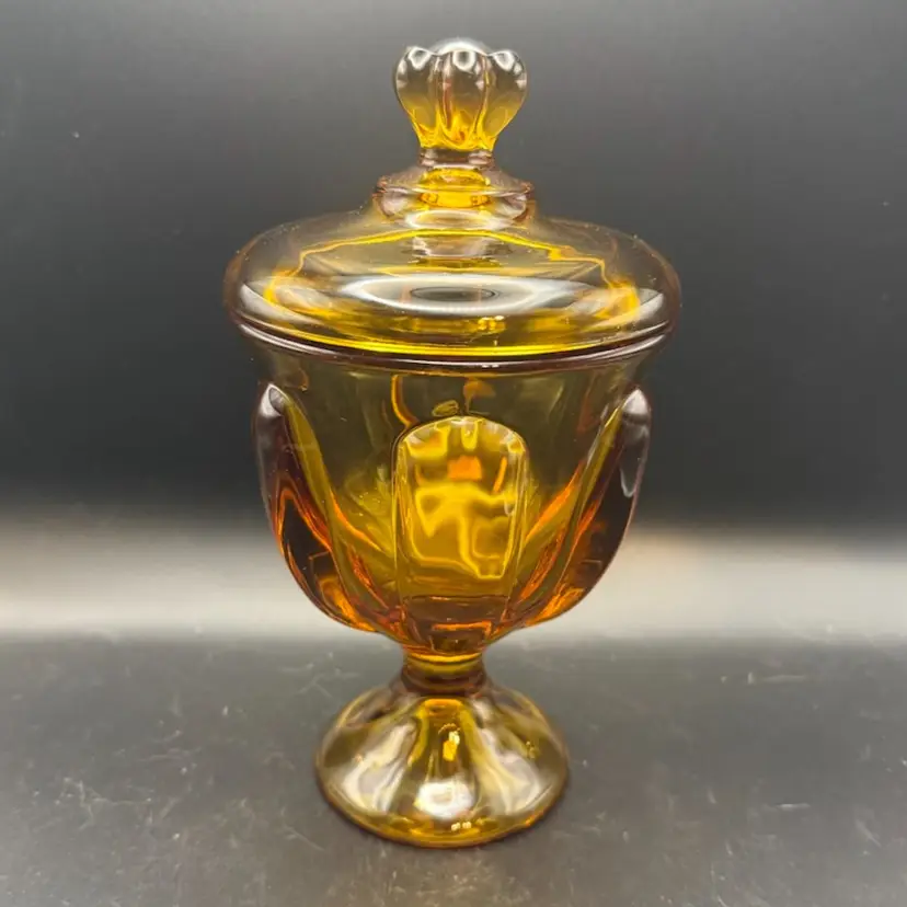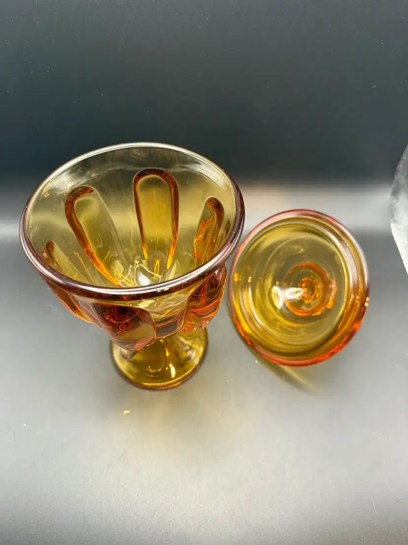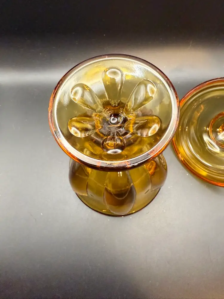 It is part of the Mid-Century Modern (MCM) Viking Epic line, featuring a distinctive 6-petal design on the lid. Made of amber art glass, it's suitable for storing candy, sugar, spices, or other small items. Introduced around 1967