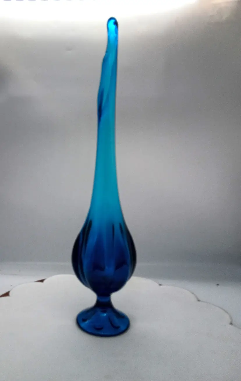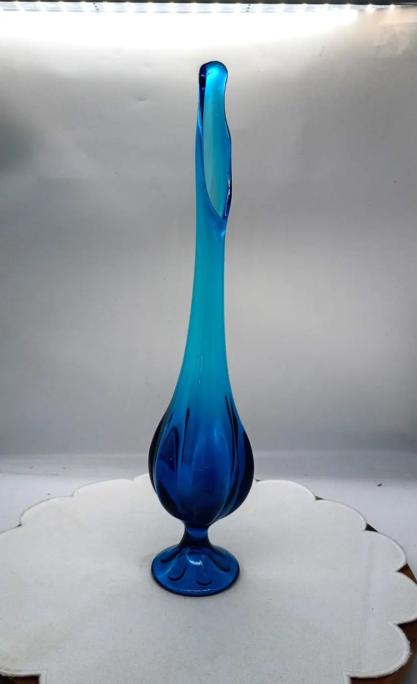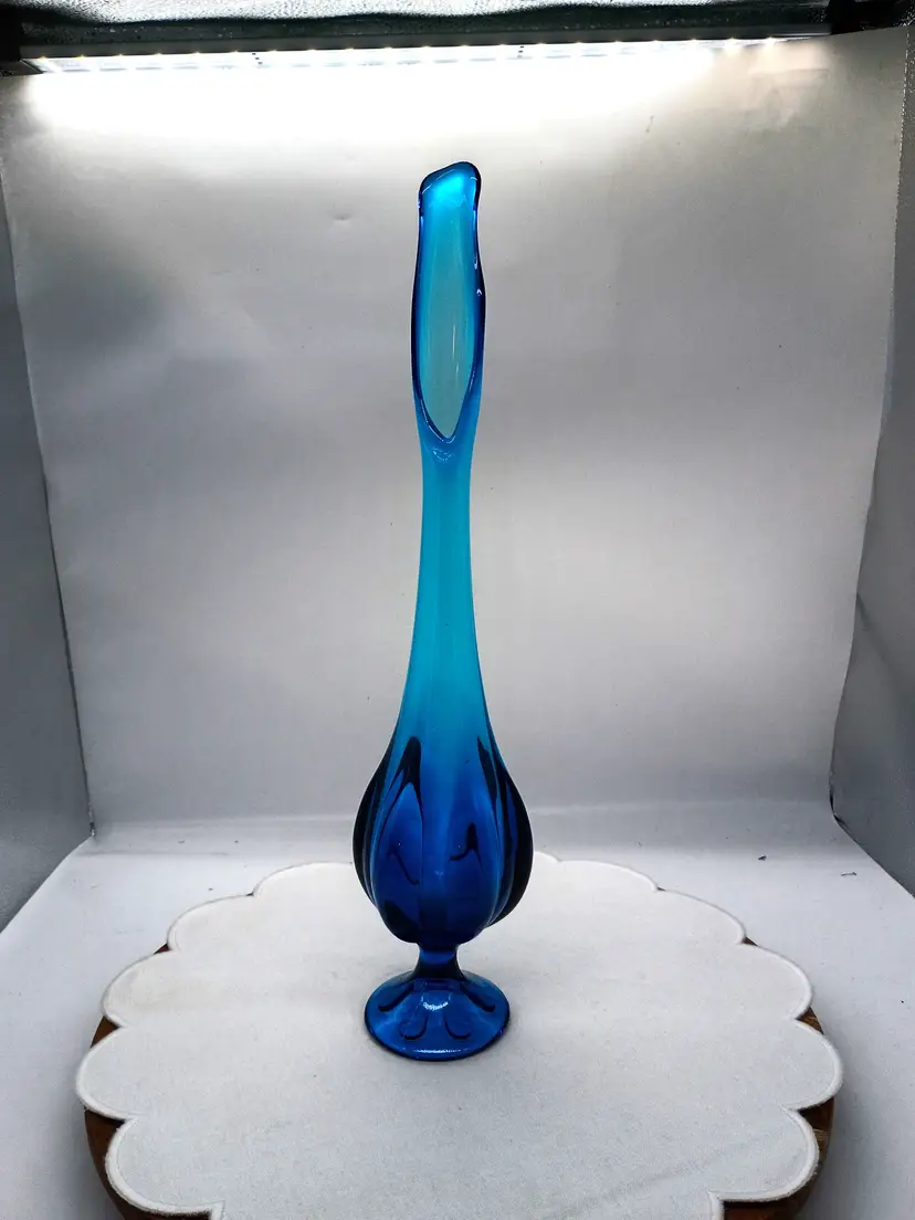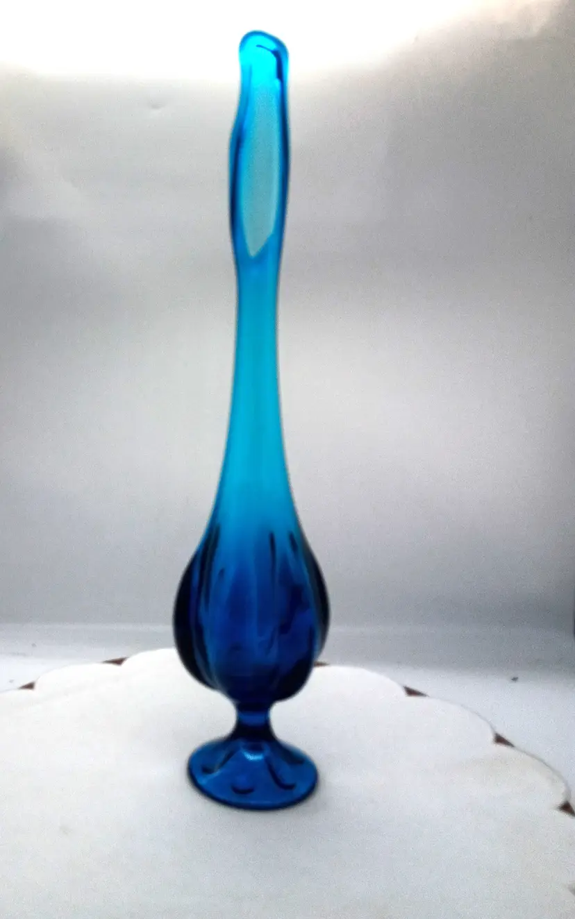 Viking Glass Epic Footed Bluenique 6 Petal Swung Blue Vase 17.5" Tall. This is 17.5 inches tall and 3 inches in diameter. Circa 1960's This is Preowned, No chips cracks or flea bites, No fractures or bruises, No water marks . Perfectly clean. Near Mint condition. Ships USPS domestically and UPS/ USPS International Shipping globally