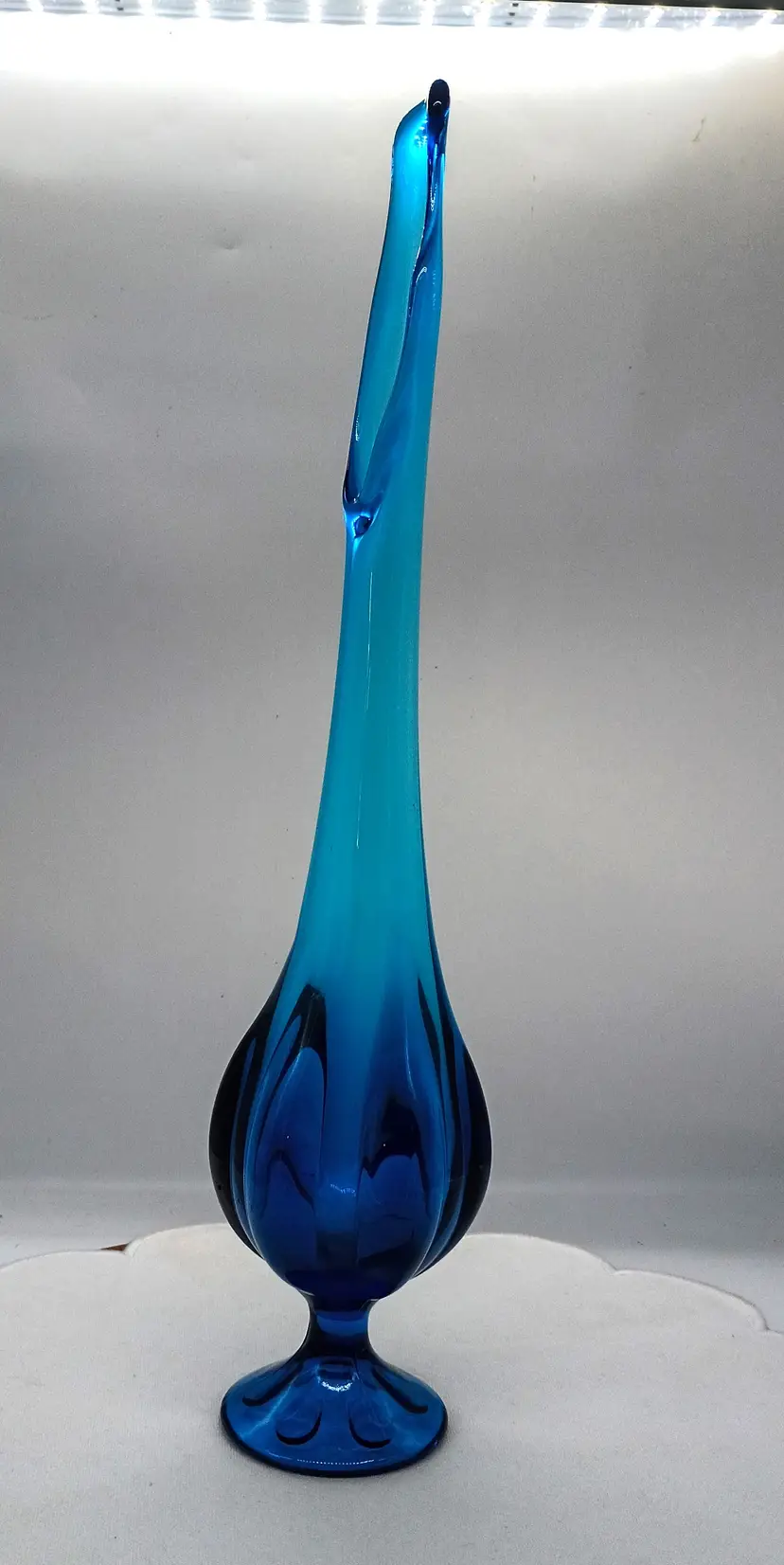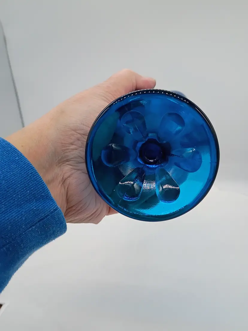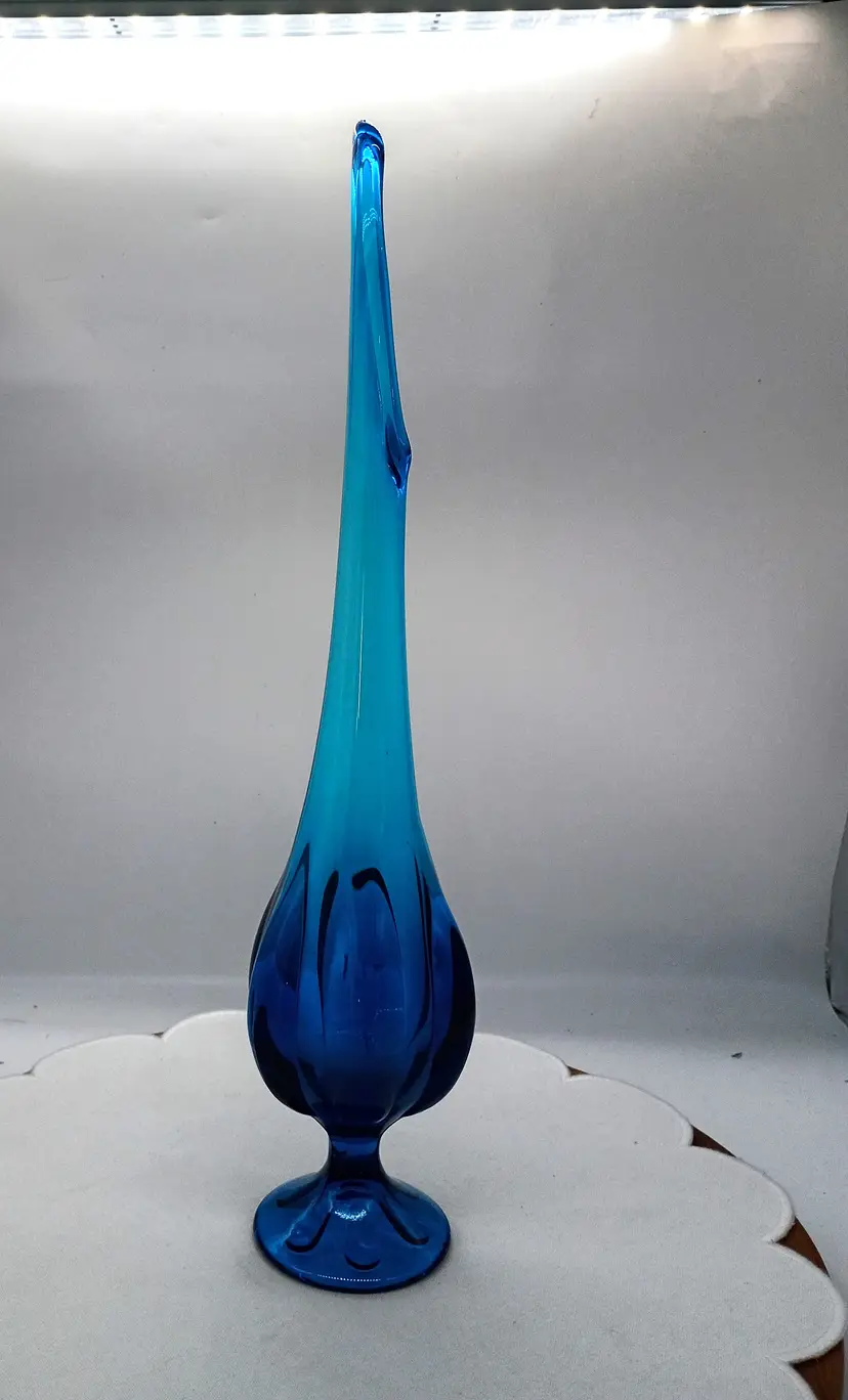 Viking Glass Epic Footed Bluenique 6 Petal Swung Blue Vase 17.5" Tall. This is 17.5 inches tall and 3 inches in diameter. Circa 1960's This is Preowned, No chips cracks or flea bites, No fractures or bruises, No water marks . Perfectly clean. Near Mint condition. Ships USPS domestically and UPS/ USPS International Shipping globally