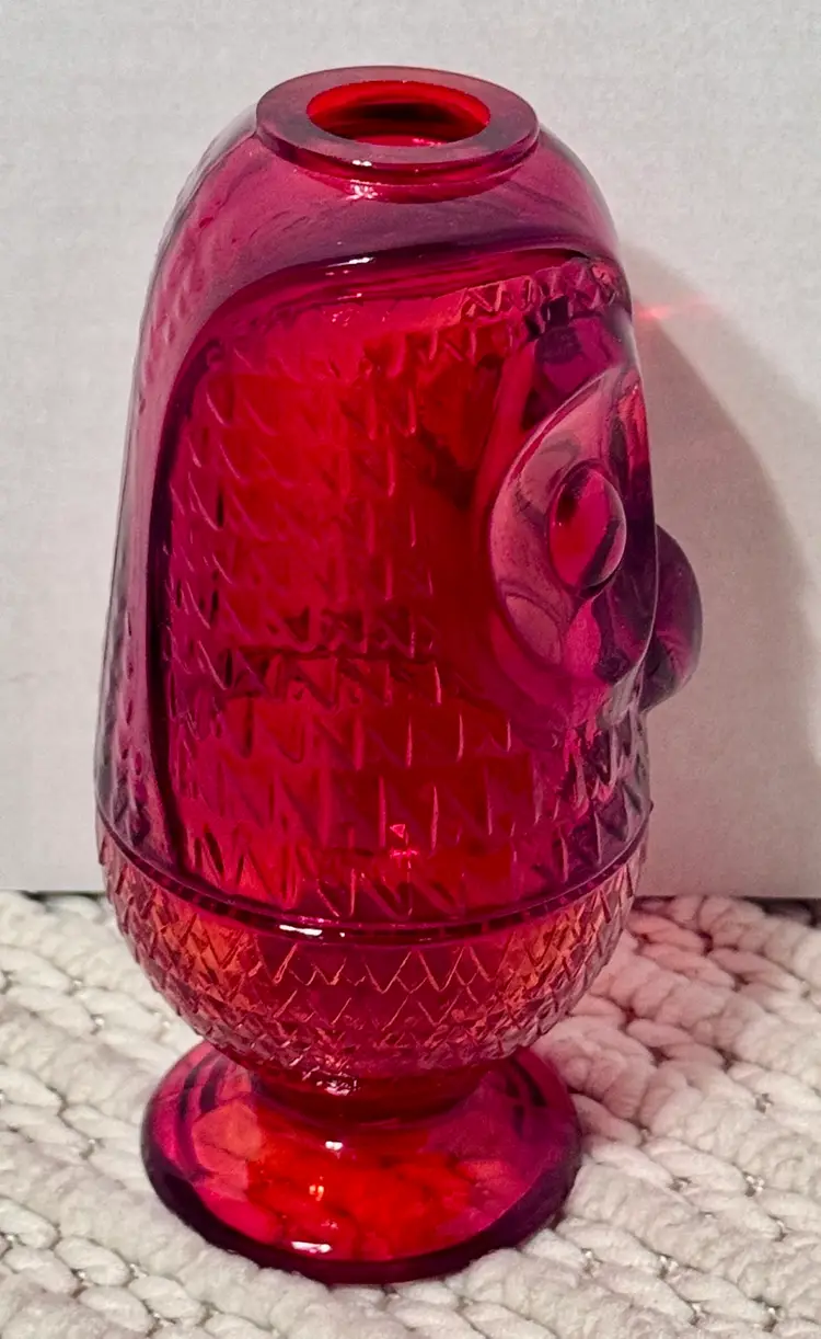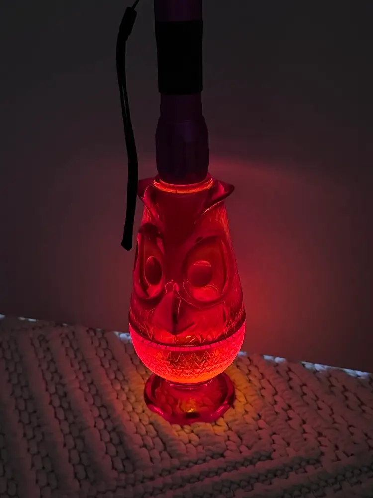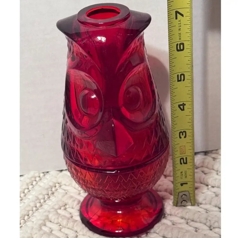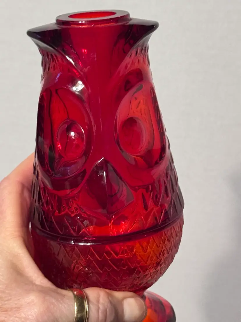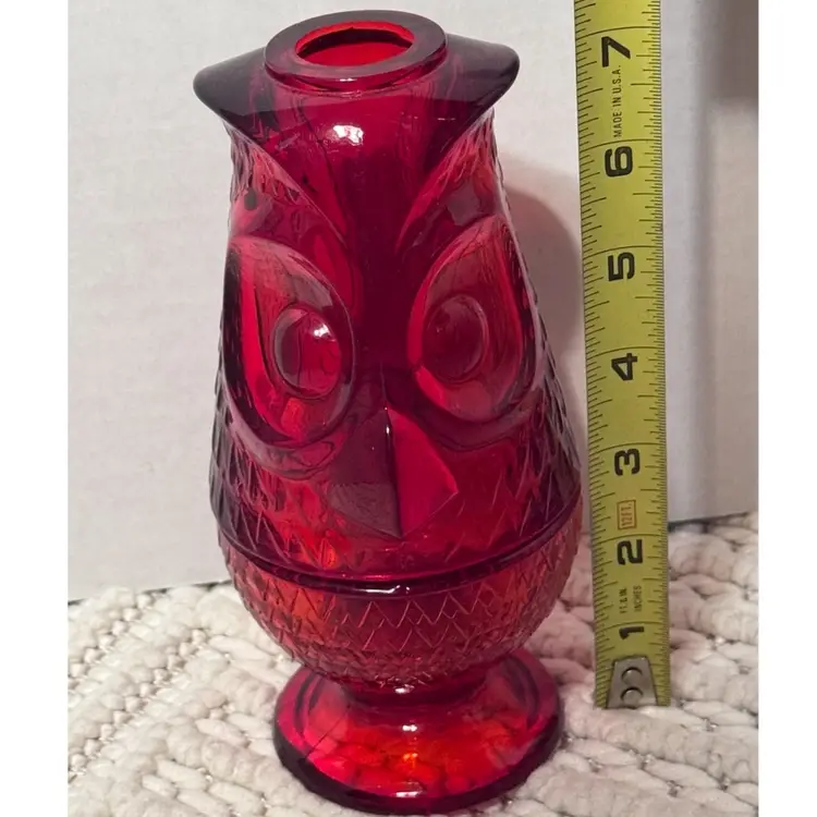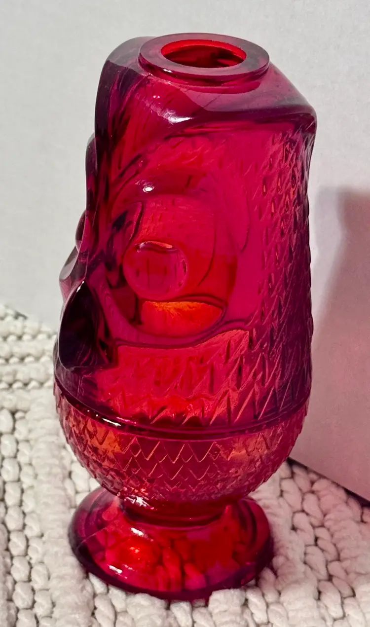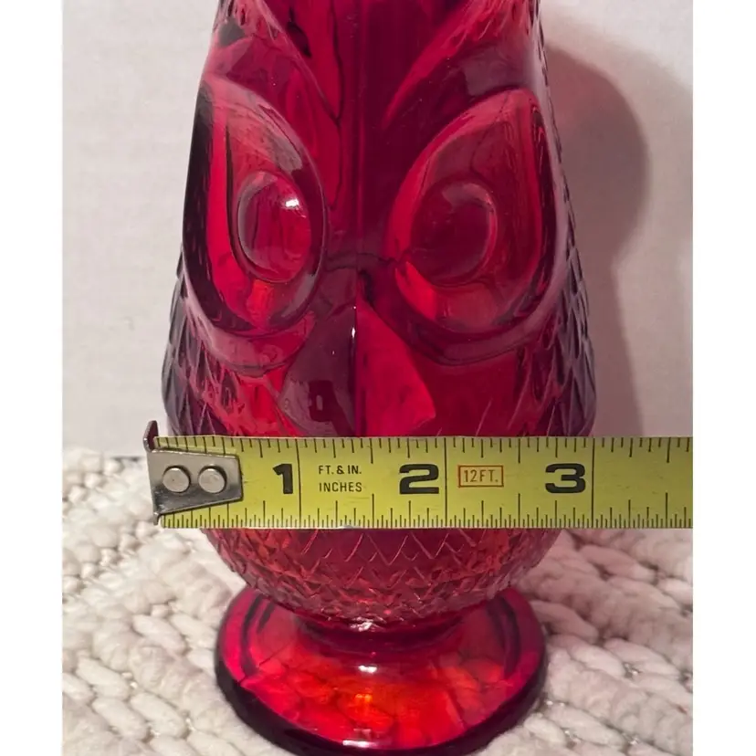 The Viking glass ruby red owl fairy lamp is a stunner from the mid-century era. The lamp features a diamond pattern and a glossy finish and glows with a standard blue light. Measures 7" x 3 3/8". Amazingly good condition with not even a nick to the glass. Crafted in the United States in the 1960s-1979.