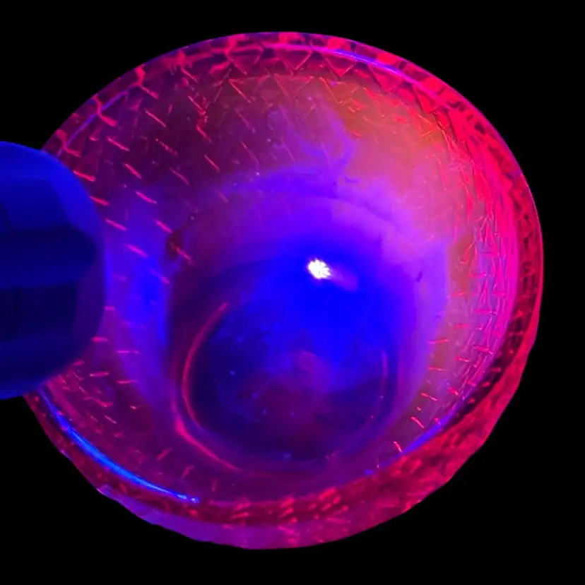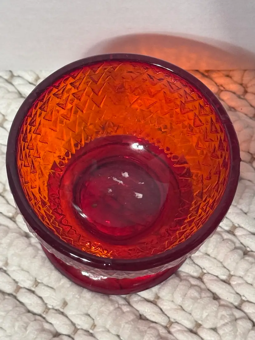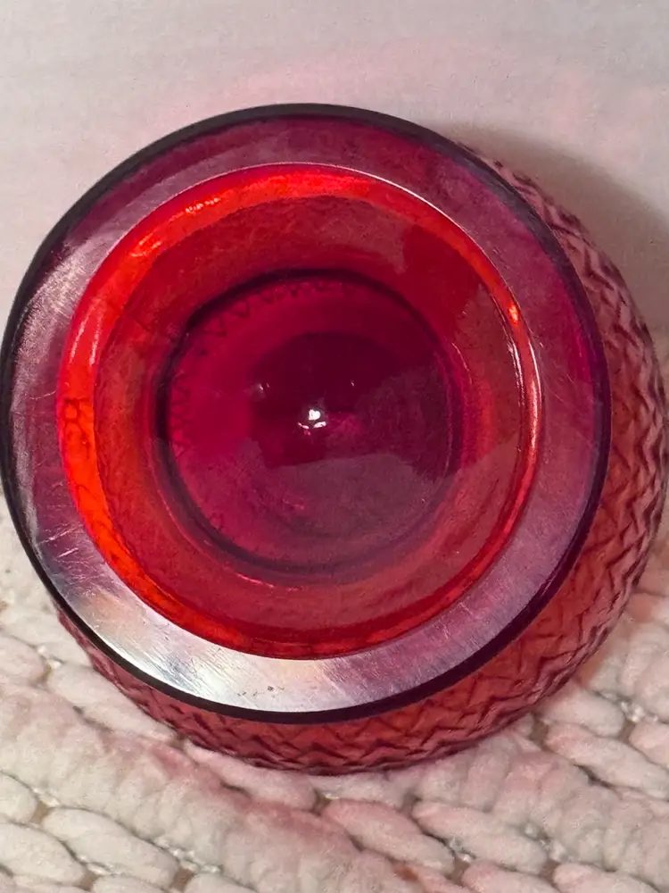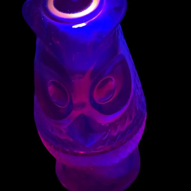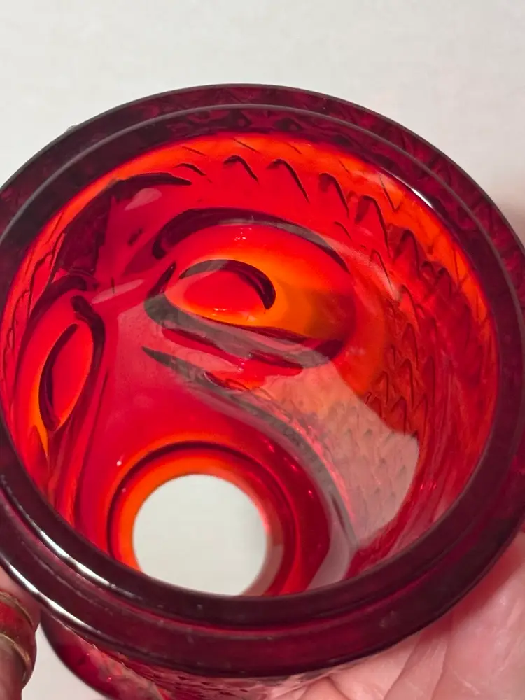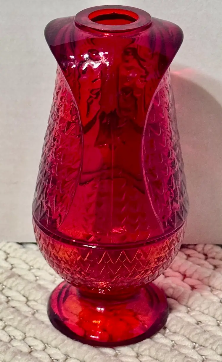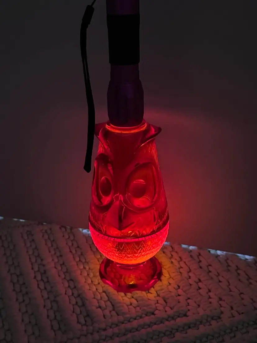 The Viking glass ruby red owl fairy lamp is a stunner from the mid-century era. The lamp features a diamond pattern and a glossy finish and glows with a standard blue light. Measures 7" x 3 3/8". Amazingly good condition with not even a nick to the glass. Crafted in the United States in the 1960s-1979.