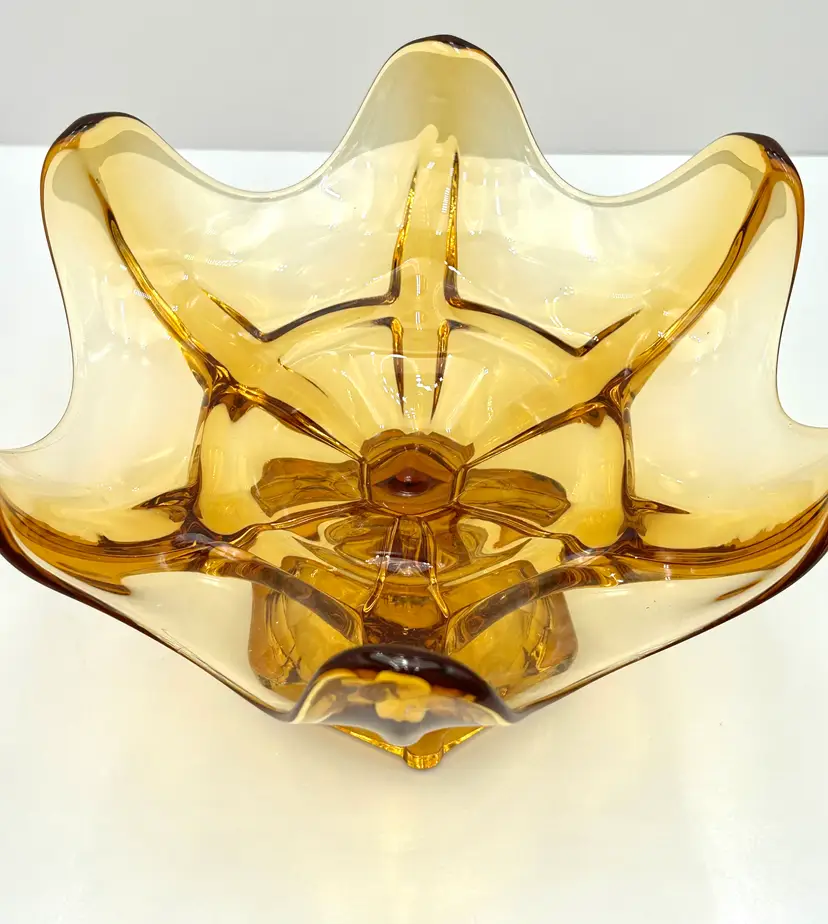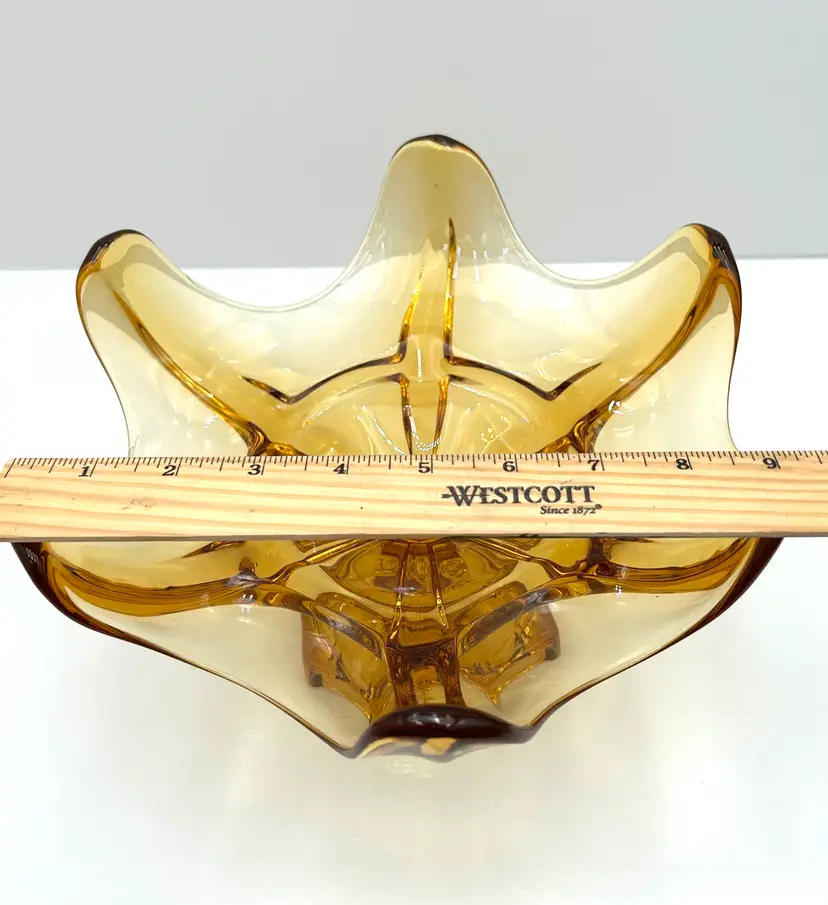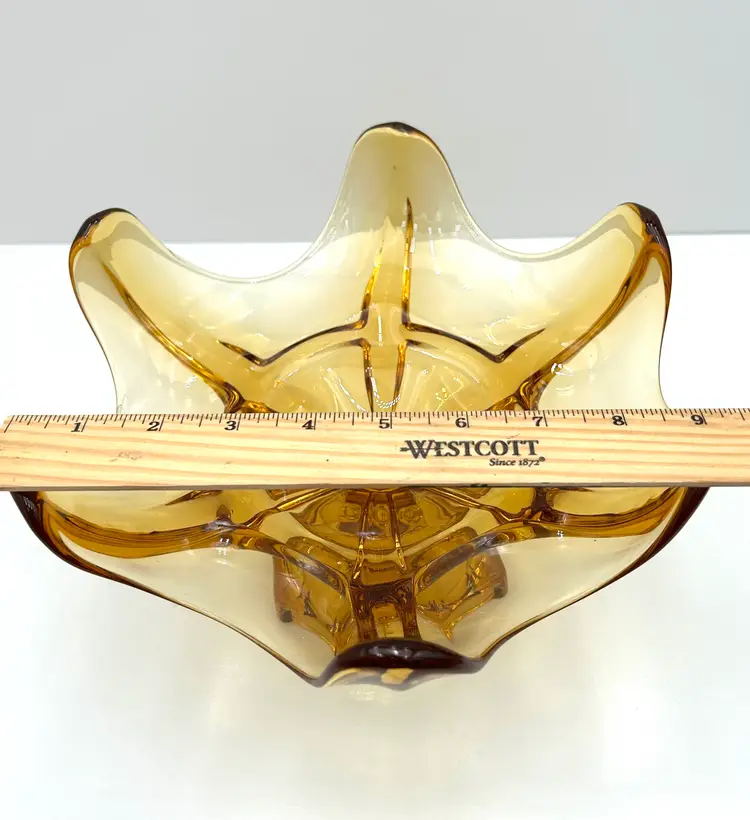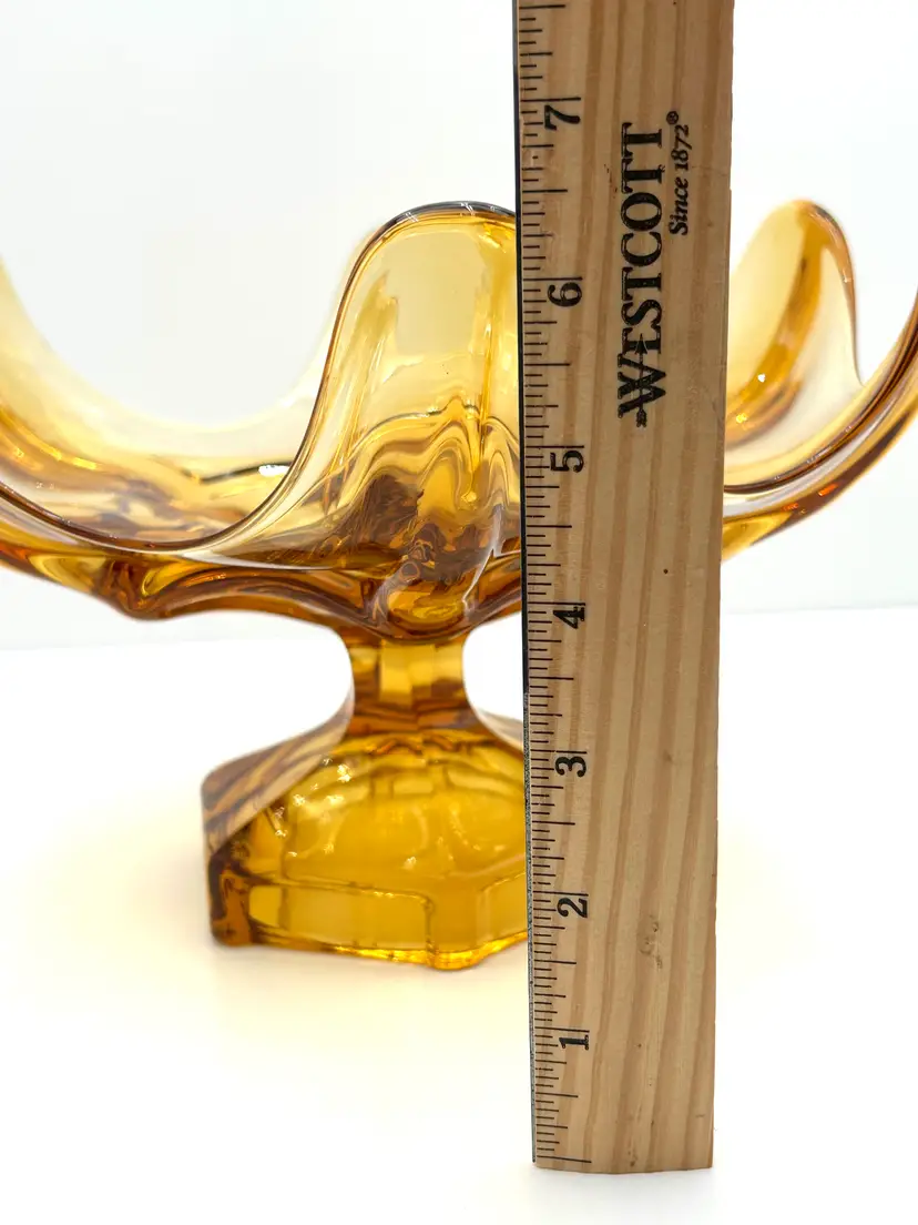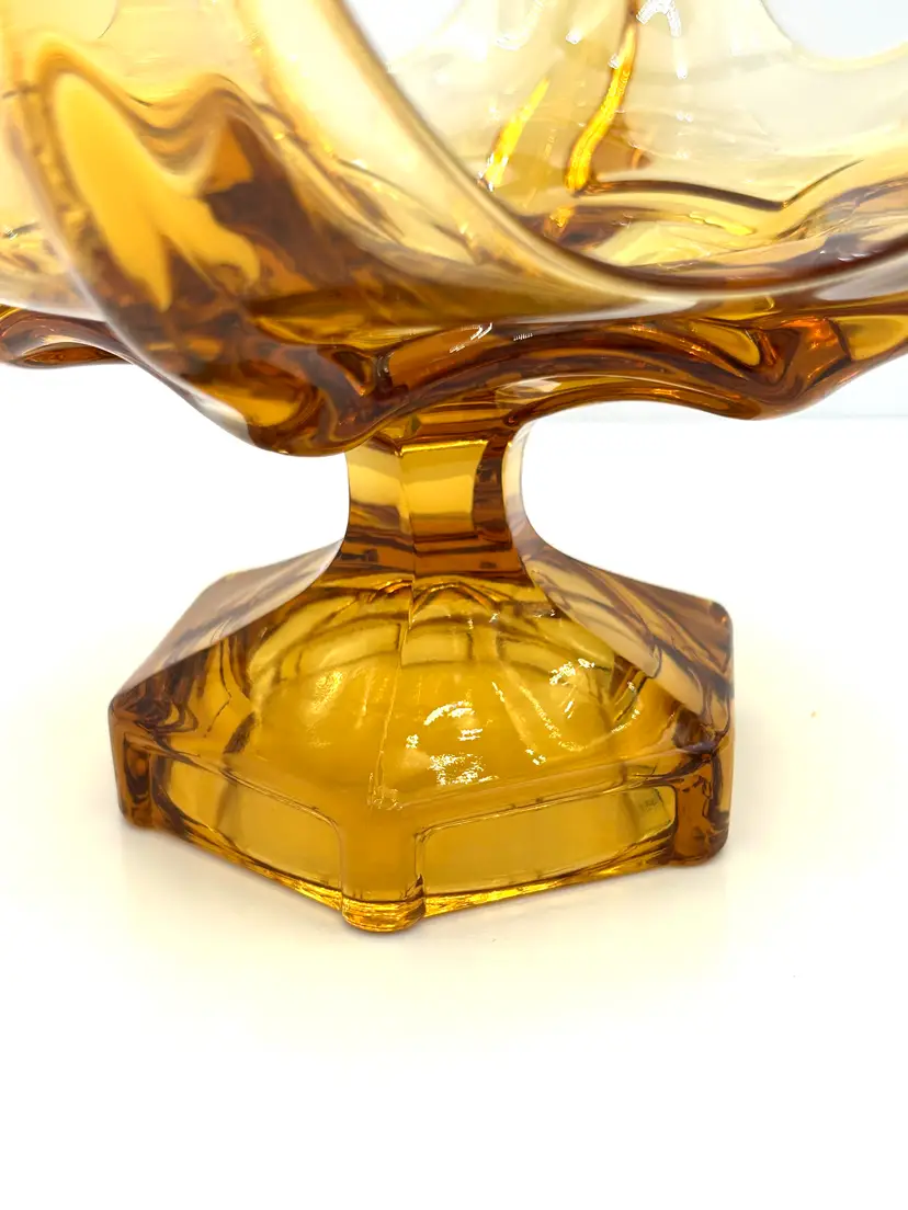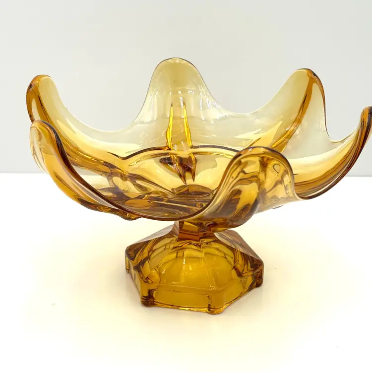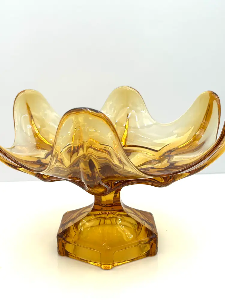 This is a very pretty large glass bowl that is a Viking piece and perfect for mid century decor. The compote is an amber color with a hexagon pedestal base and six individual petals around the top. It is a large bowl at 9 inches in diameter at the top and about 6 ½ inches tall. The piece is also very heavy with all of that vintage glass. There are no chips or cracks.