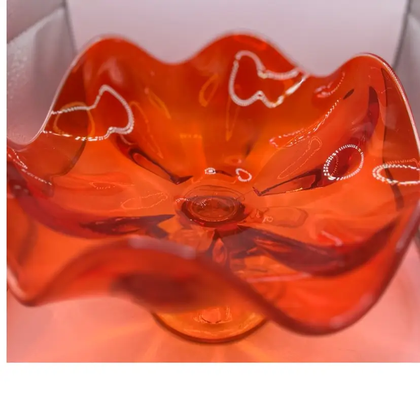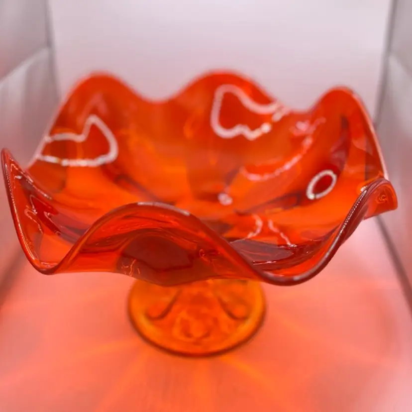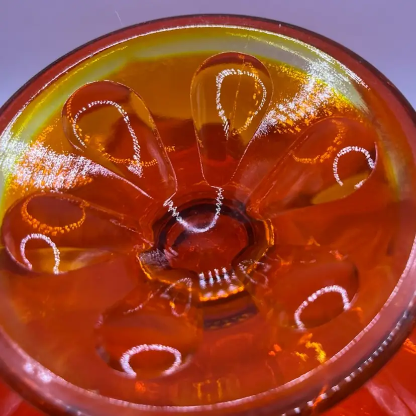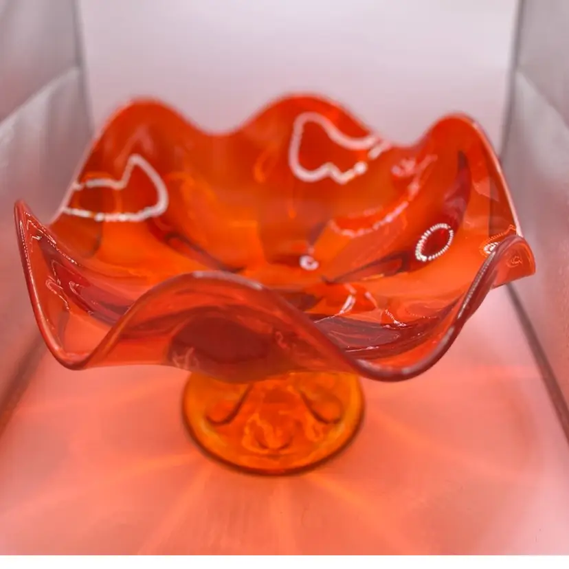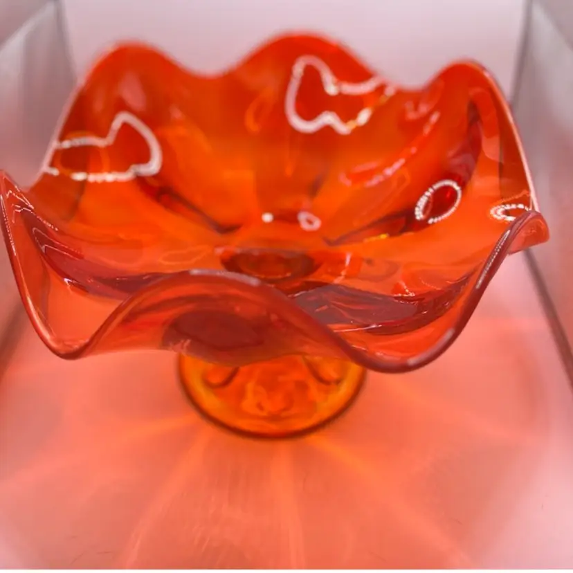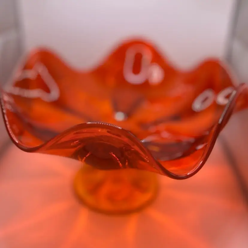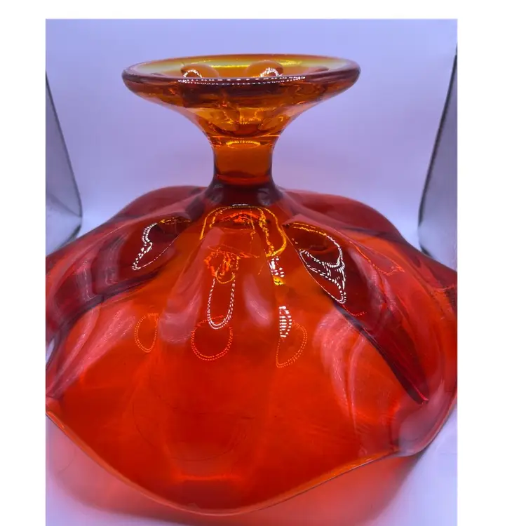 This vintage Viking Amberina candy dish is a beautiful addition to any collection. The 6 petal design and footed pedestal make it a unique and sturdy piece. The dish is made of high-quality glass and has a stunning orange-red amberina color that glows beautifully. Measuring 6 inches in height and 9.5 inches in width, this vase is perfect for displaying candy or other small items. The brand is VIKING and the type is a vase, making it a great choice for those who appreciate Viking style. This item is ideal for collectors and enthusiasts of decorative collectibles.