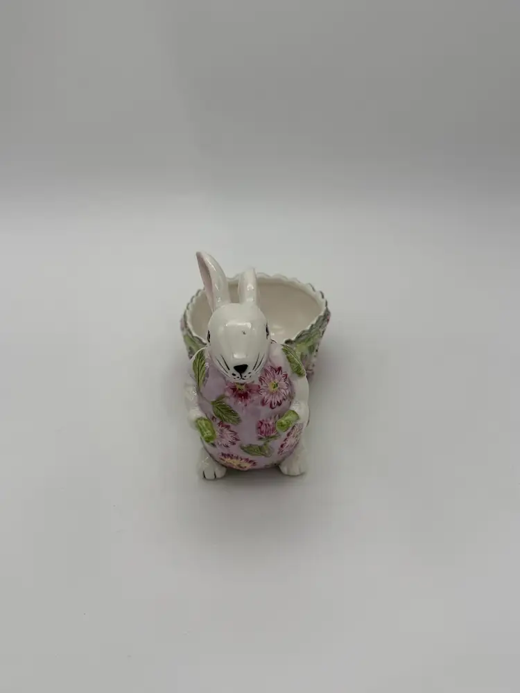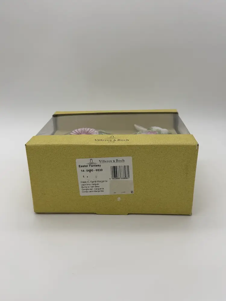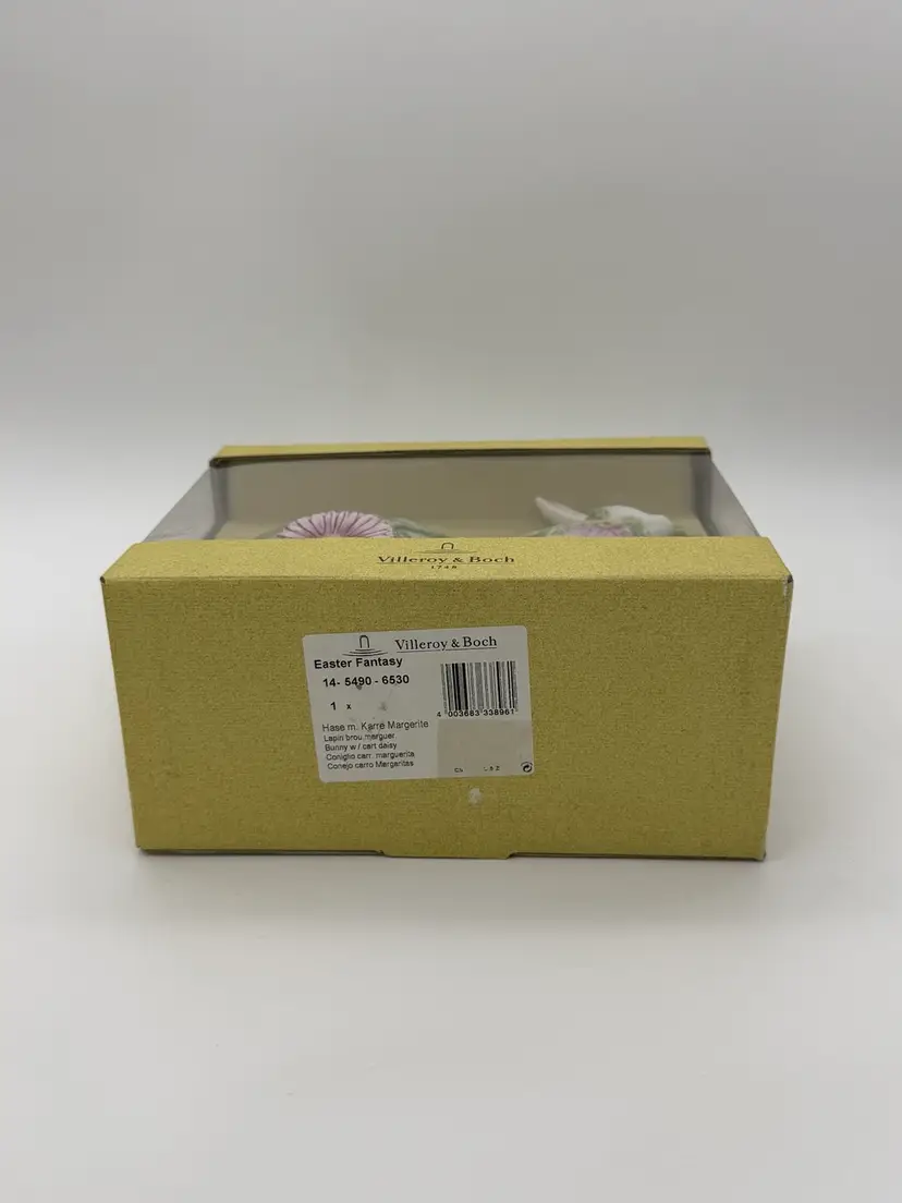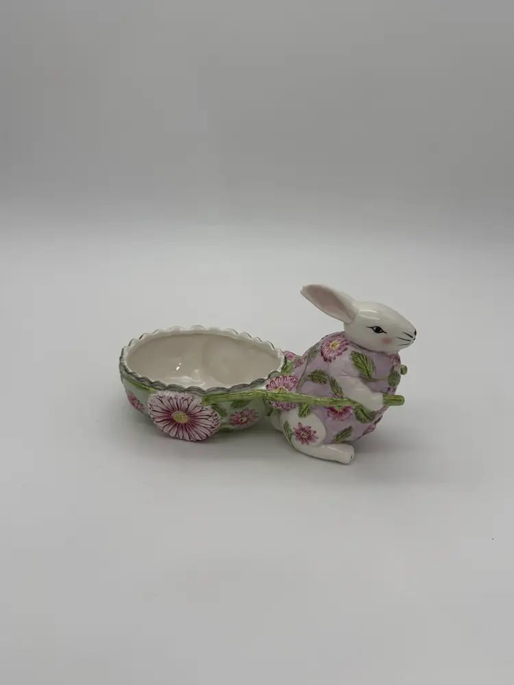 The Villeroy & Boch 1748 Easter Fantasy Bunny With Daisy Cart Wagon Candy Bowl is a contemporary-style, hand-painted ceramic and porcelain piece in a glossy finish. The small bunny rabbit with an egg-shaped wagon features a colorful daisy pattern, making it a charming table centerpiece or decorative item for any room in your home. This retired collectible from the late 20th century comes in a box and is suitable for use in the office, study, bathroom, sunroom, bedroom, living room, or dining room, adding a touch of fantasy and Easter spirit to your space. Measures to be approximately 7.5” long, 4” wide, 1.5” deep, 4” diameter, 4.5” high, and weighs approximately 1 lbs & 1.2 ounces.