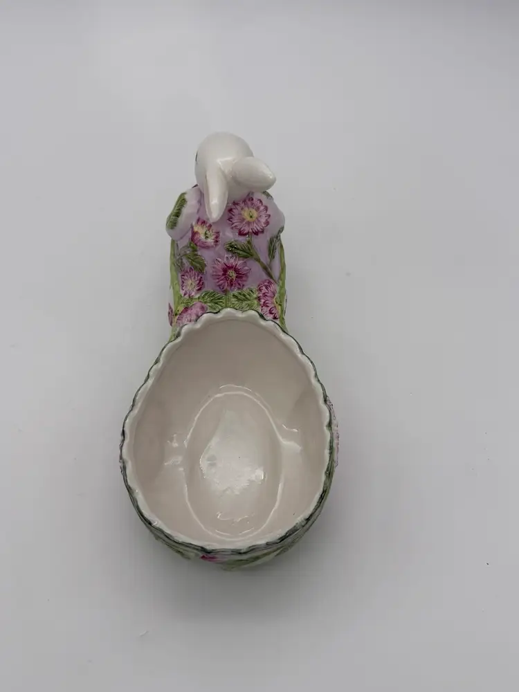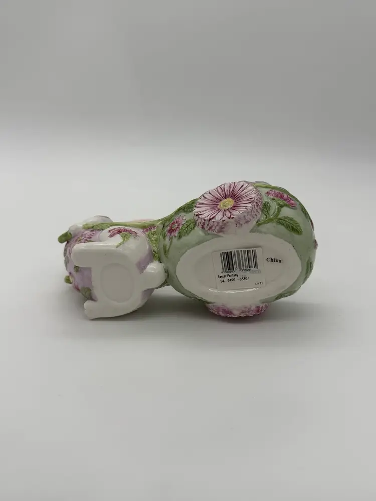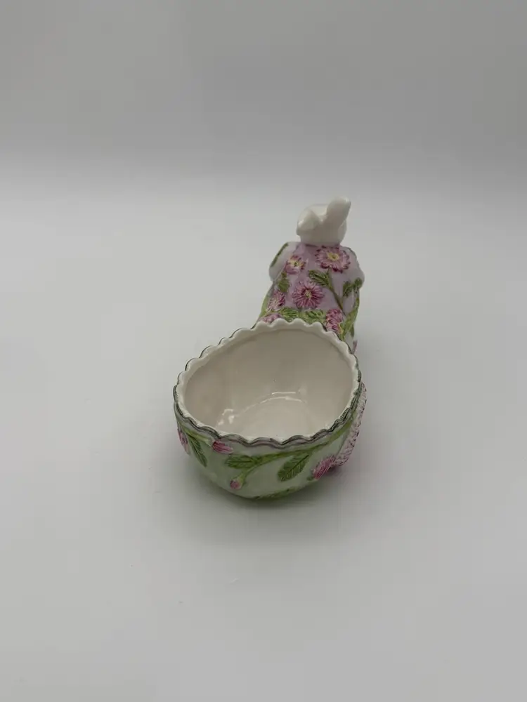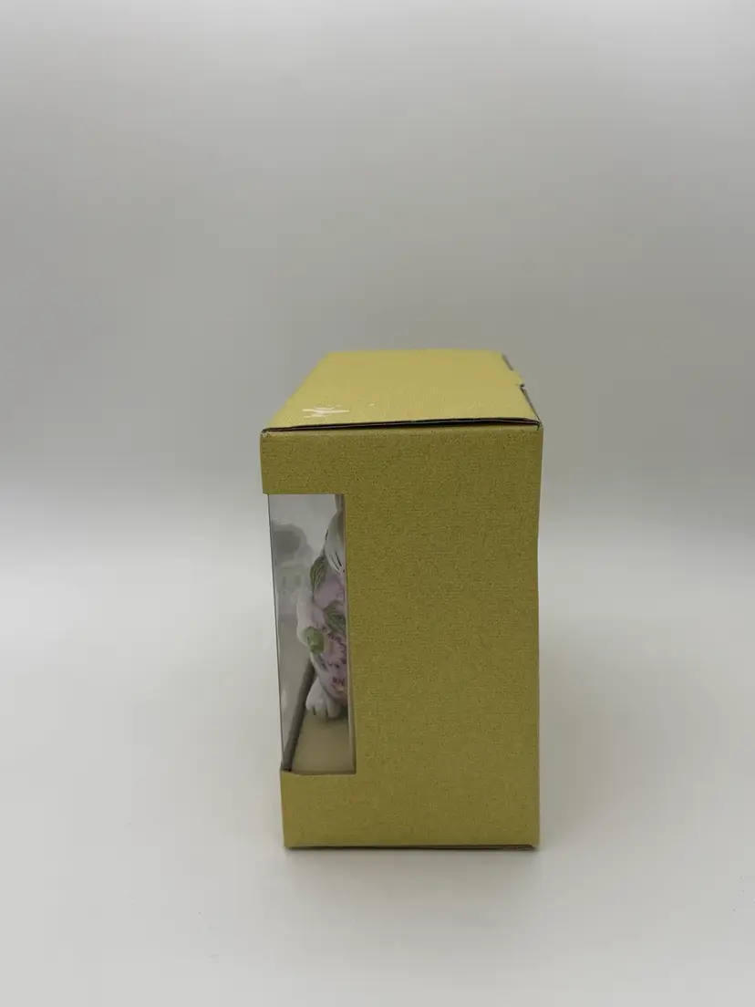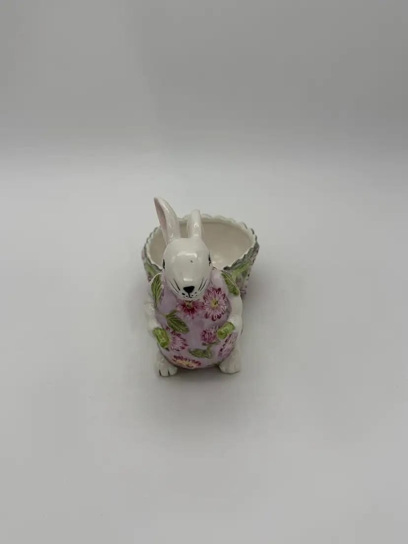 The Villeroy & Boch 1748 Easter Fantasy Bunny With Daisy Cart Wagon Candy Bowl is a contemporary-style, hand-painted ceramic and porcelain piece in a glossy finish. The small bunny rabbit with an egg-shaped wagon features a colorful daisy pattern, making it a charming table centerpiece or decorative item for any room in your home. This retired collectible from the late 20th century comes in a box and is suitable for use in the office, study, bathroom, sunroom, bedroom, living room, or dining room, adding a touch of fantasy and Easter spirit to your space. Measures to be approximately 7.5” long, 4” wide, 1.5” deep, 4” diameter, 4.5” high, and weighs approximately 1 lbs & 1.2 ounces.
