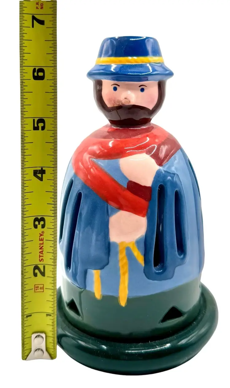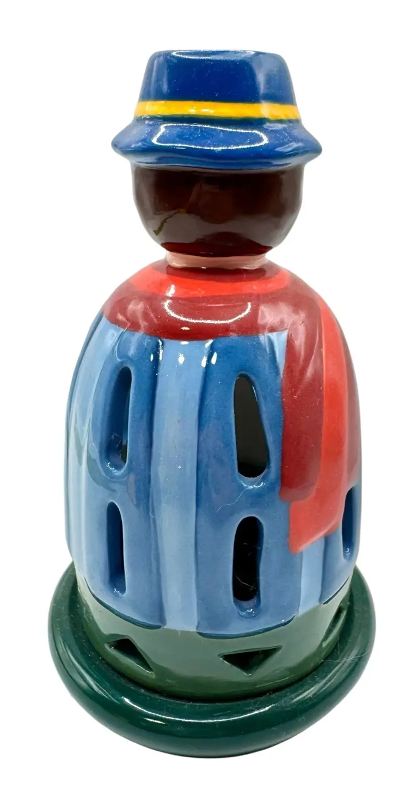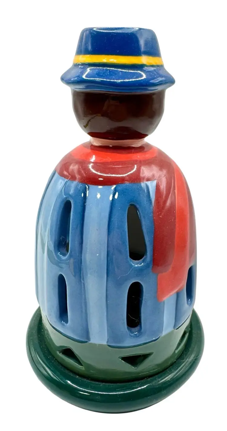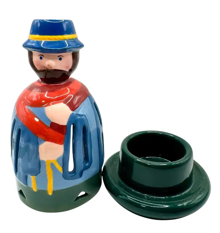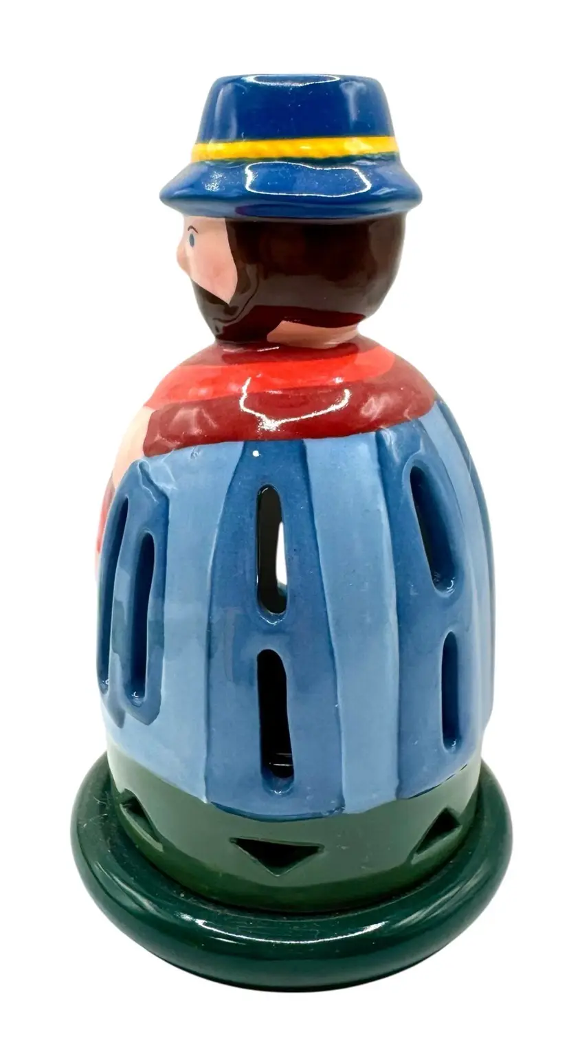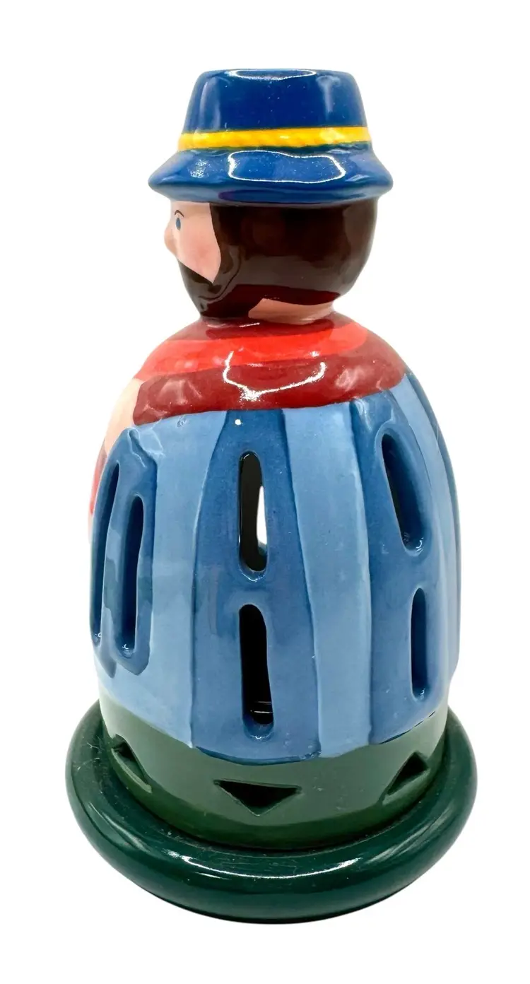 Candle holder shaped like Joseph; it is part of a series of nativity themed candles. It can hold a taper candle on top, and a tea light candle inside.