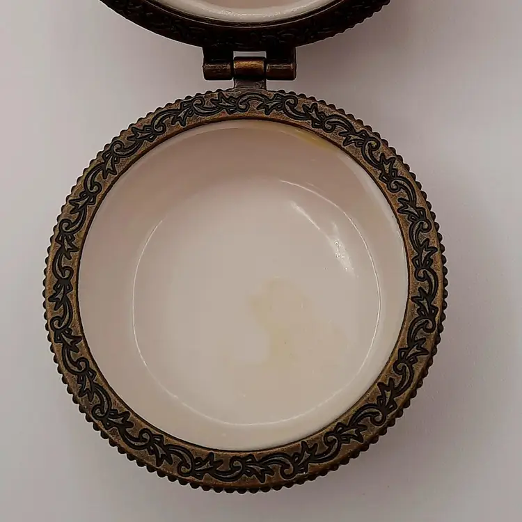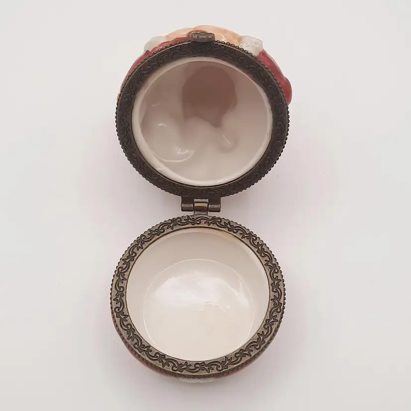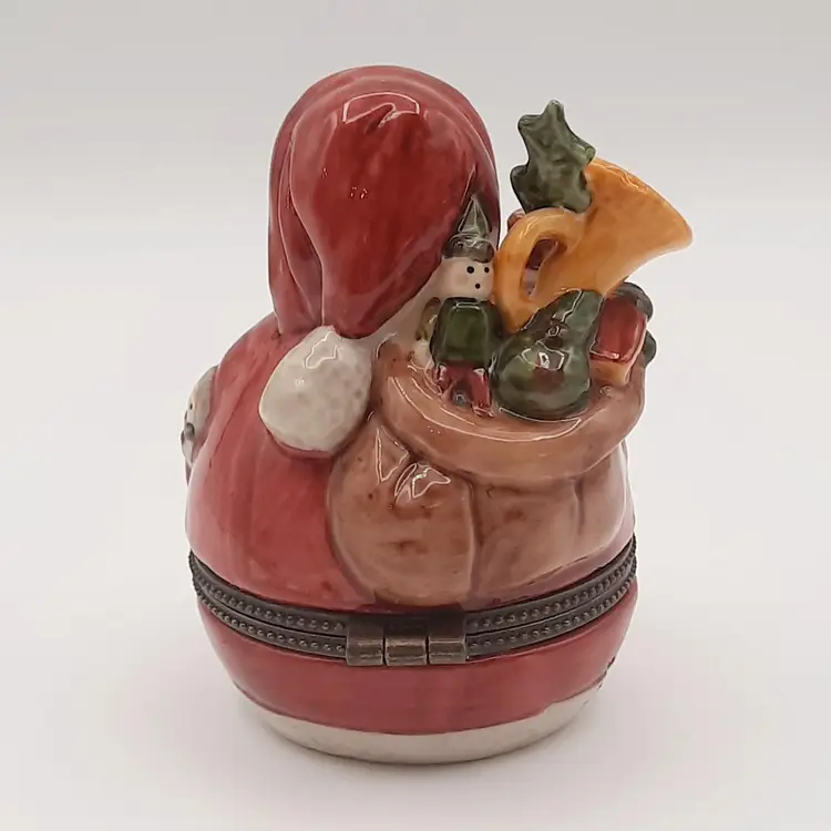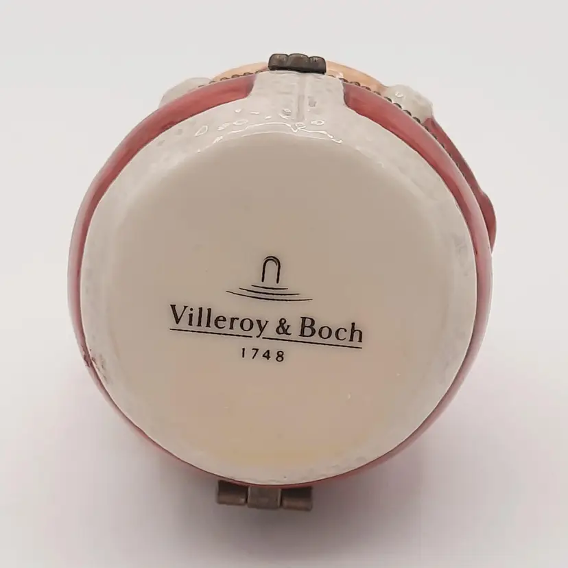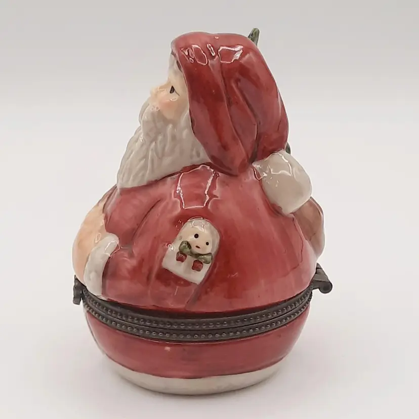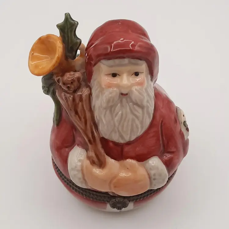 3 1/2", light wear including tiny scuff on top of his head, some excess glue or glaze inside box, and light discoloration on bottom