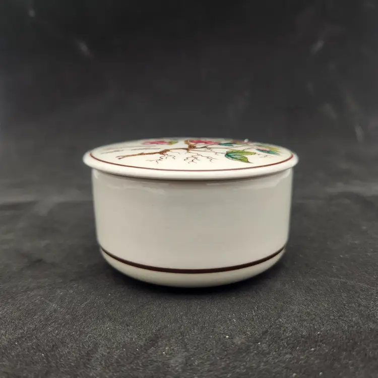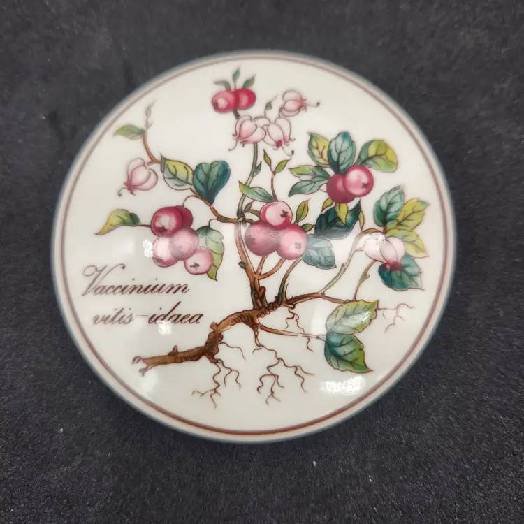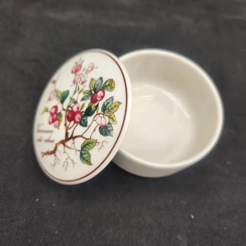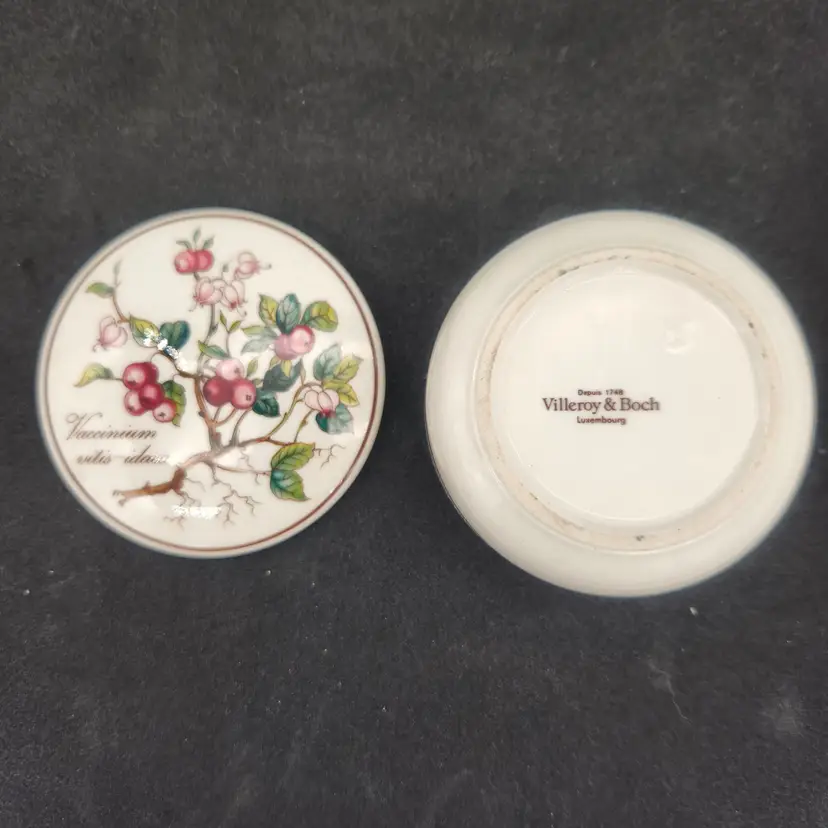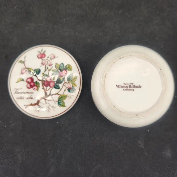 Villeroy & Boch Luxembourg Botanical Vaccinium Vitis-idaea Trinket Box w/Lid Translated from its Latin name, in English, this beautifully designed box features a Lingonberry on its cover. In addition to the rich colors of the botanical, the dish features a delicate golden brown banding around the lid and around the dish. Measurements: 3" in diameter, 1 1/2" tall For over 275 years, Villeroy & Boch has been synonymous with exquisite design, unparalleled craftsmanship, and timeless elegance. Excellent condition: no chips, cracks, crazing or signs of wear From a Smoke Free Environment. Item shown is the exact item you will receive. Ships from Northeast Ohio.