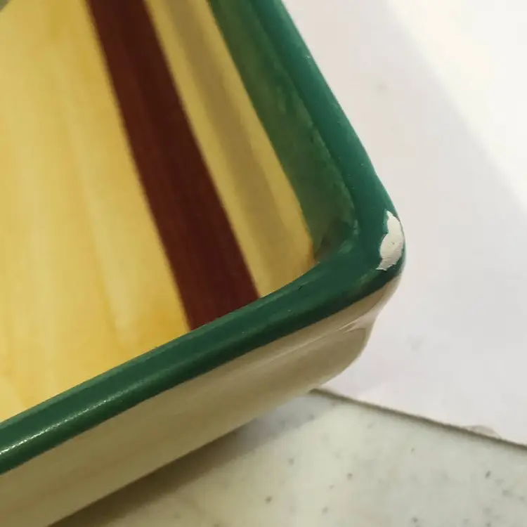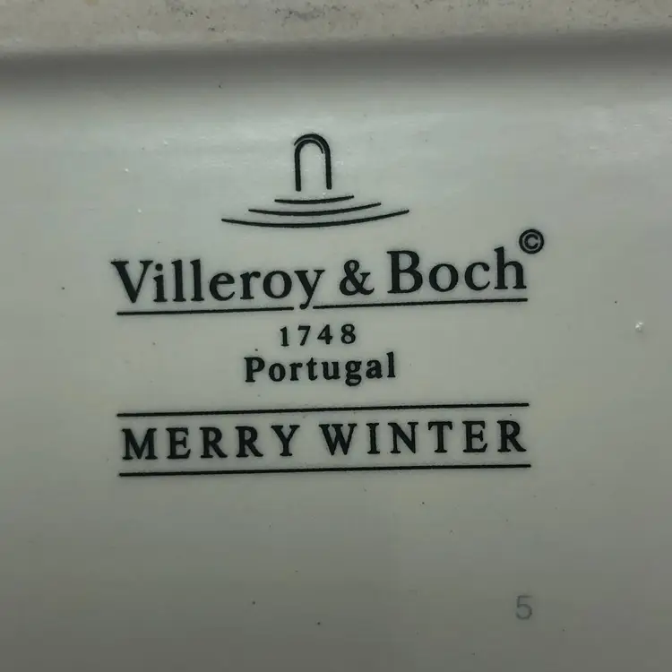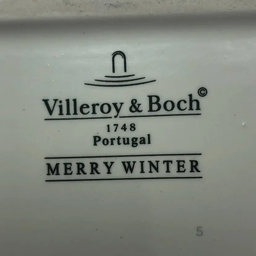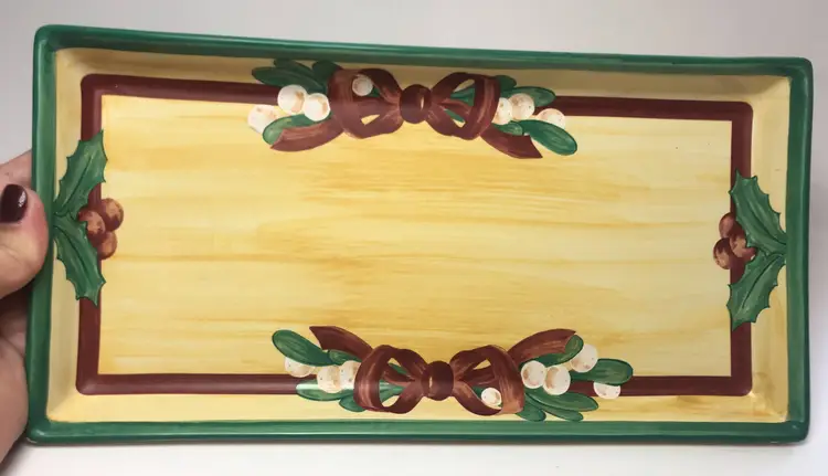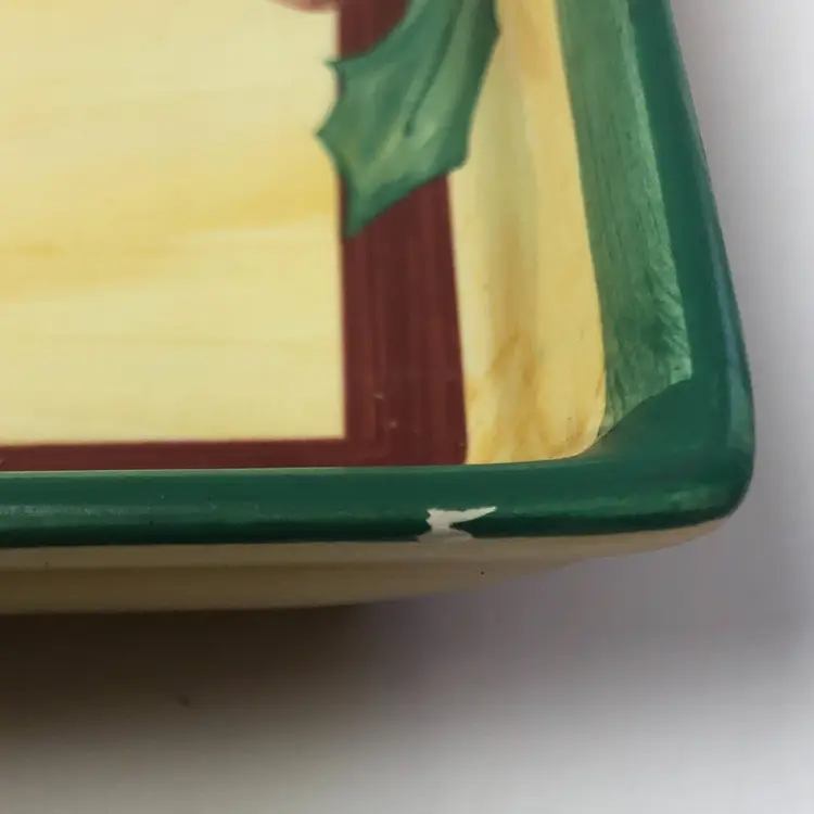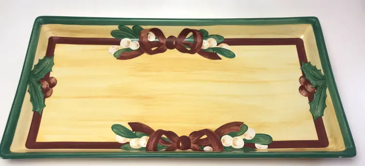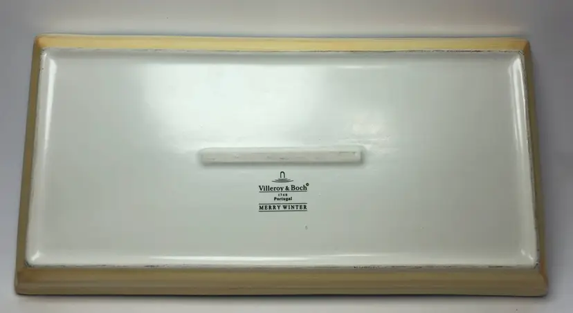 Villeroy & Boch Merry Winter Large Rectangle Sandwich Serving Tray Holly Red Ribbon Mistletoe. 13 1/4 in long x 6.5". Two small paint flakes or chips on rim as shown. No other chips, no other cracks. Christmas pattern.