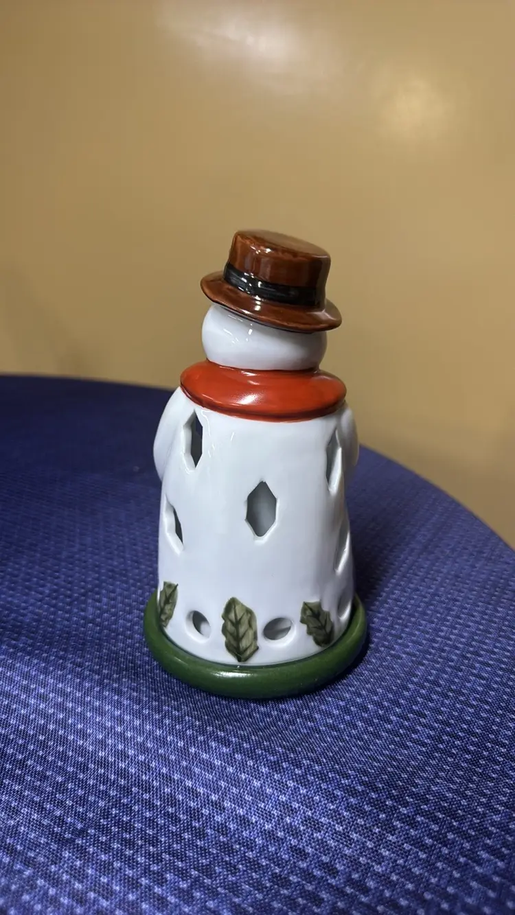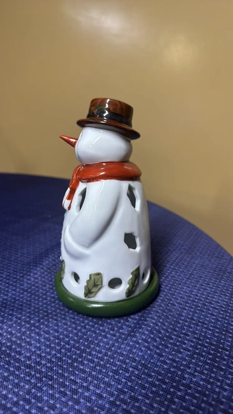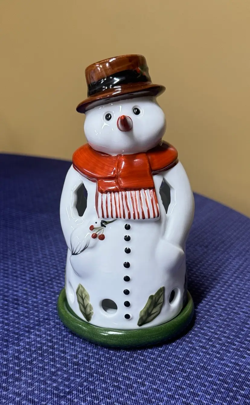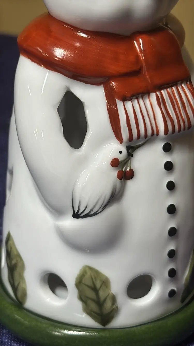 Villeroy & Boch Christmas Snowman Tealight Holder, 18cm 7”- Very Good Condition! Charming snowman figurine with a red scarf and brown hat and bird. Perfect for holiday decor. Really nice and adorable with no breaks or chips (98095253)