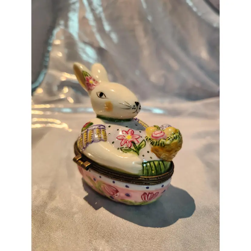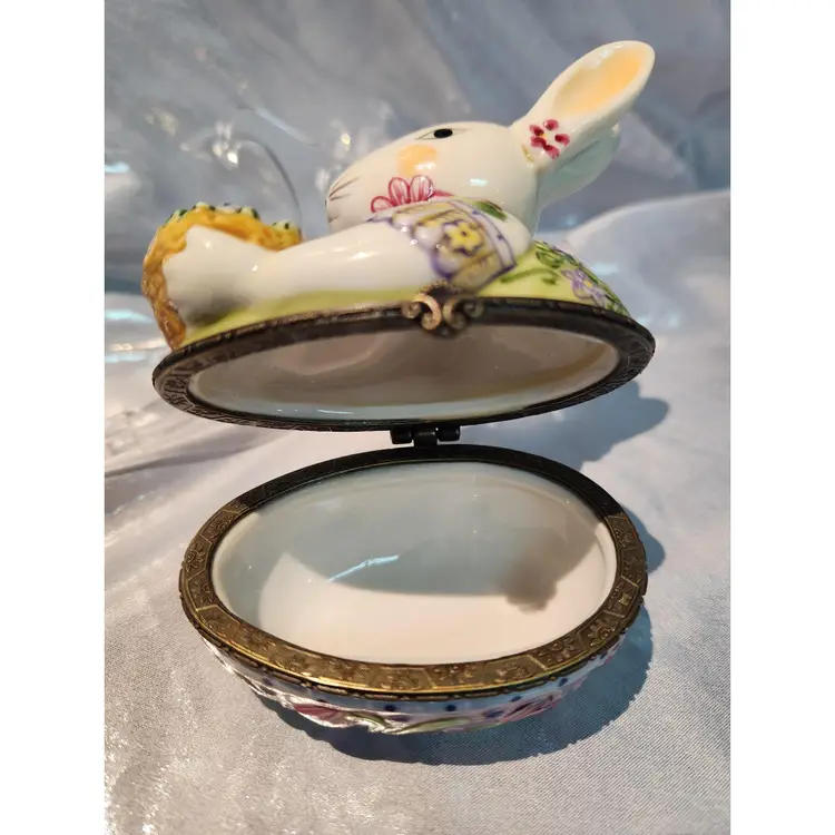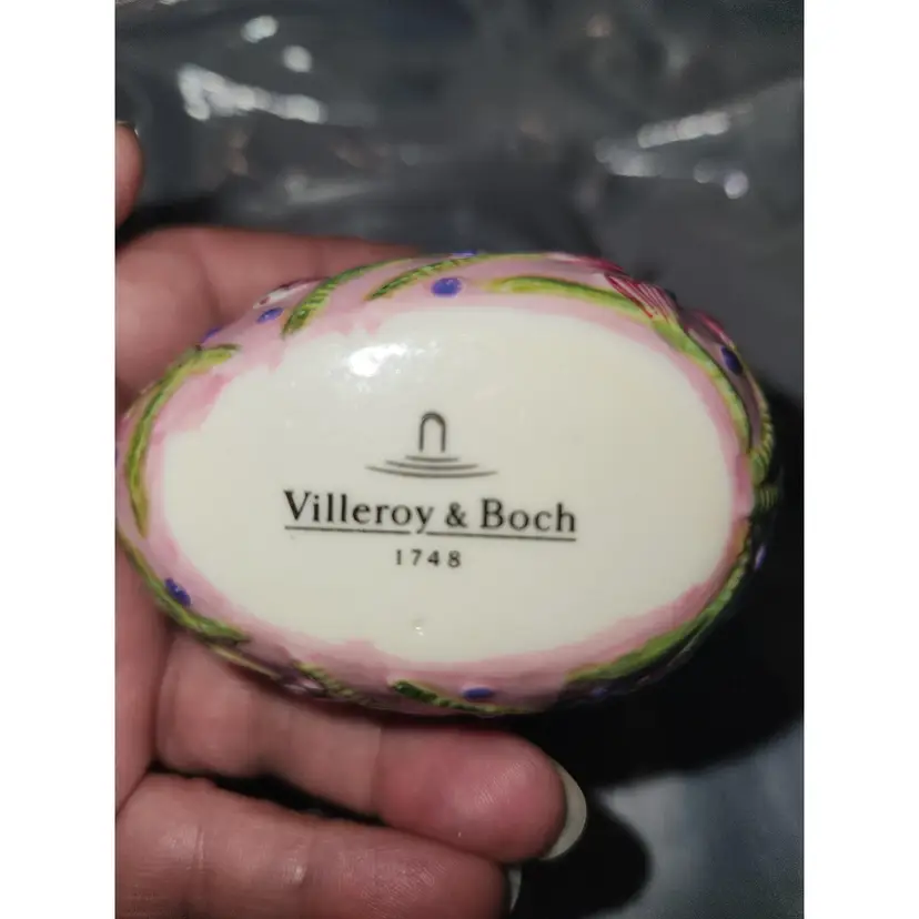 Villeroy & Boch Trinket Box Featuring Bunny Rabbit with flower in egg shaped design Also marked 1748 Measures approximately 3 inches by 3 inches at longest points by 2 inches wide Hinged trinket box whose clasp closes firmly No chips or cracks