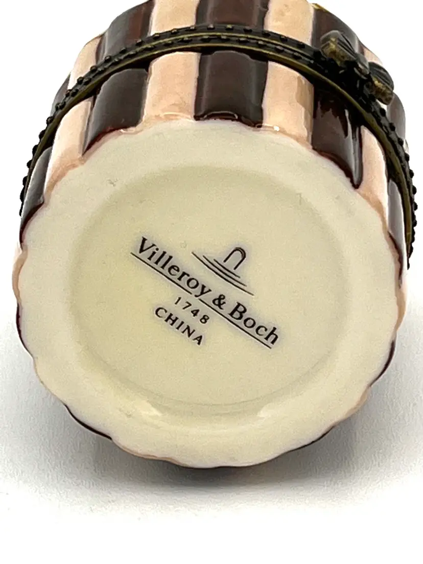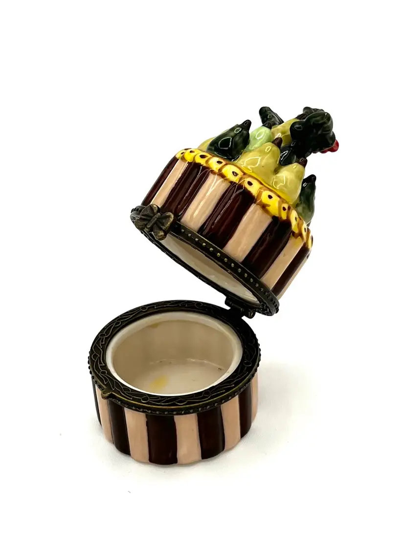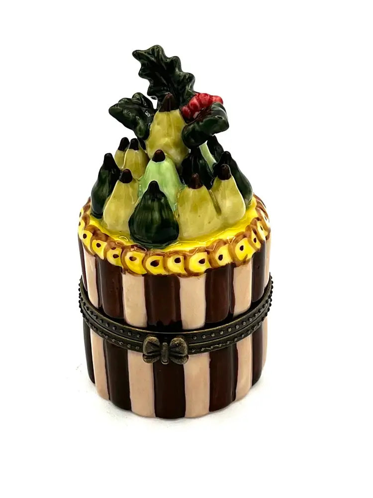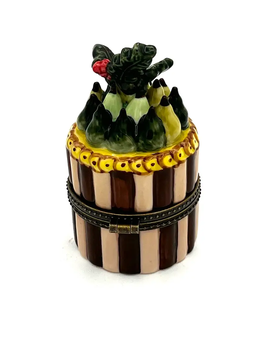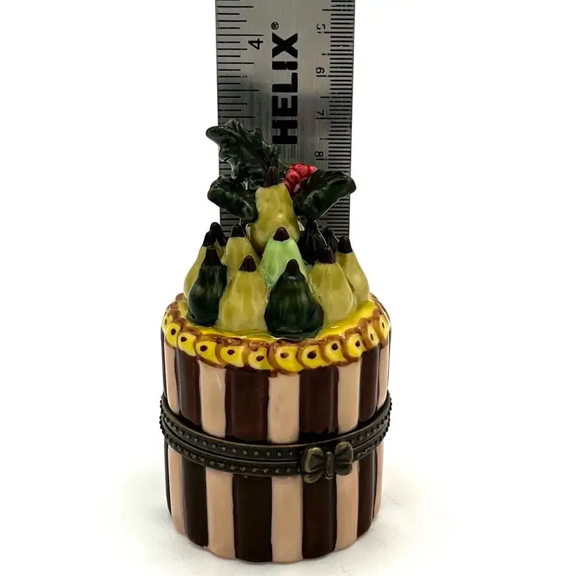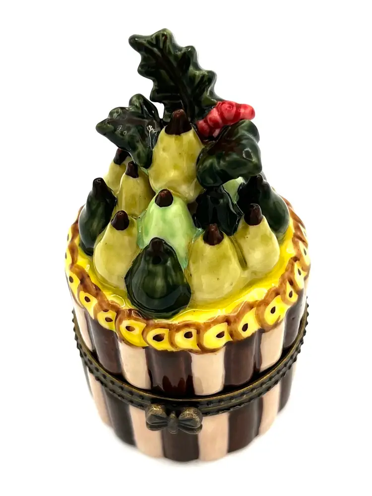 Add a touch of whimsy to your Christmas décor with this Villeroy & Boch bone china trinket box in the shape of a cake topped with pears. This trinket box is suitable for decorative purposes, making it a great gift for adults who appreciate unique collectibles. • Excellent pre-owned vintage condition. • Measures approximately 3.25” tall.