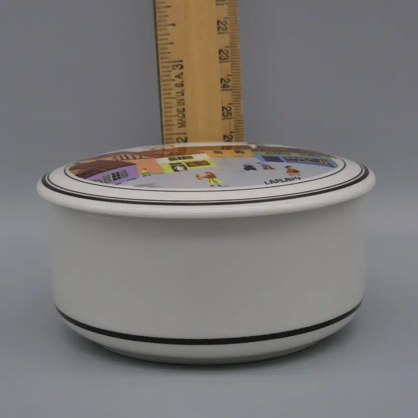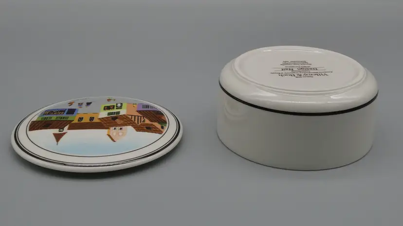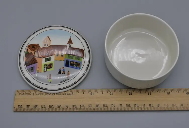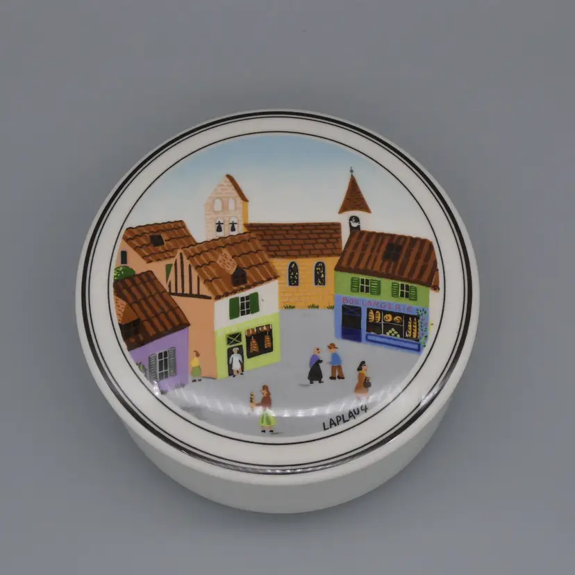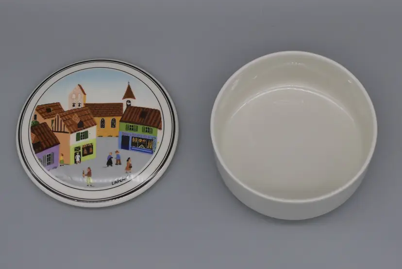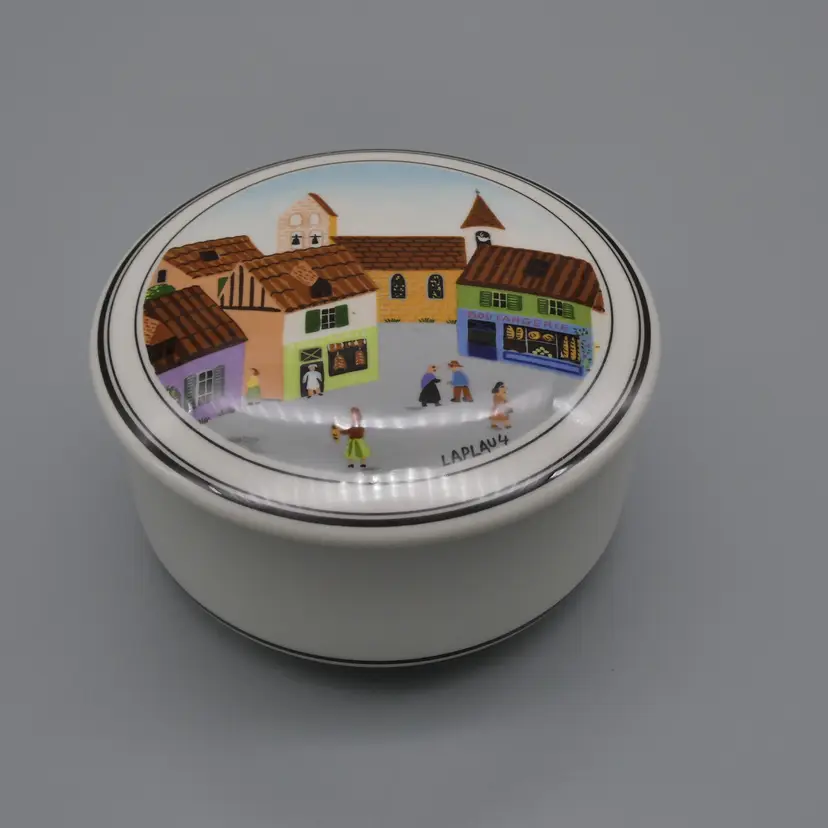 Featuring a colorful Village Square with people milling about on the lid White porcelain with black banding Artwork colors include browns, greens, blues, purples, peach and black Lid is slightly domed and signed: Laplau 4 Marked on bottom: Villeroy & Boch, Luxembourg, Design Naif, Porcelain, Dishwasher Safe The number 3 is embossed on the bottom Measures overall about 4" across x 2" tall Inside storage space measures about 3-5/8" wide x 1-1/2" deep Weighs about 9 ounces before being packaged to ship