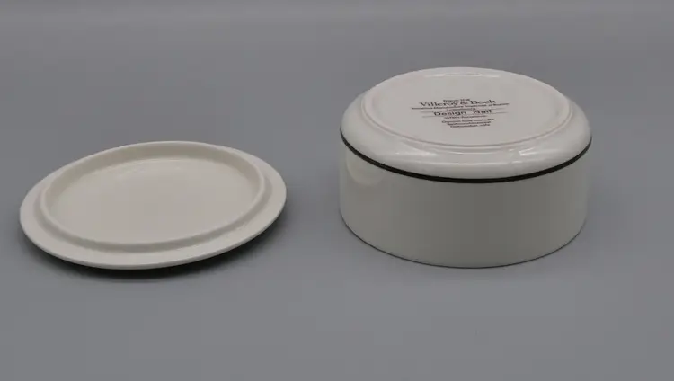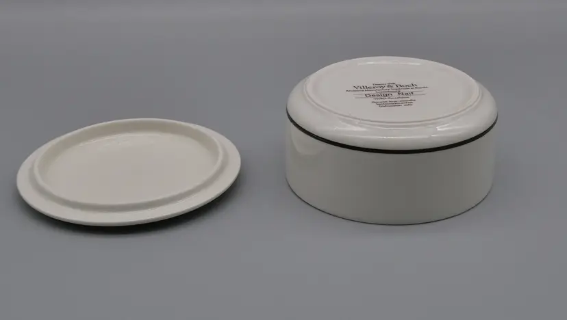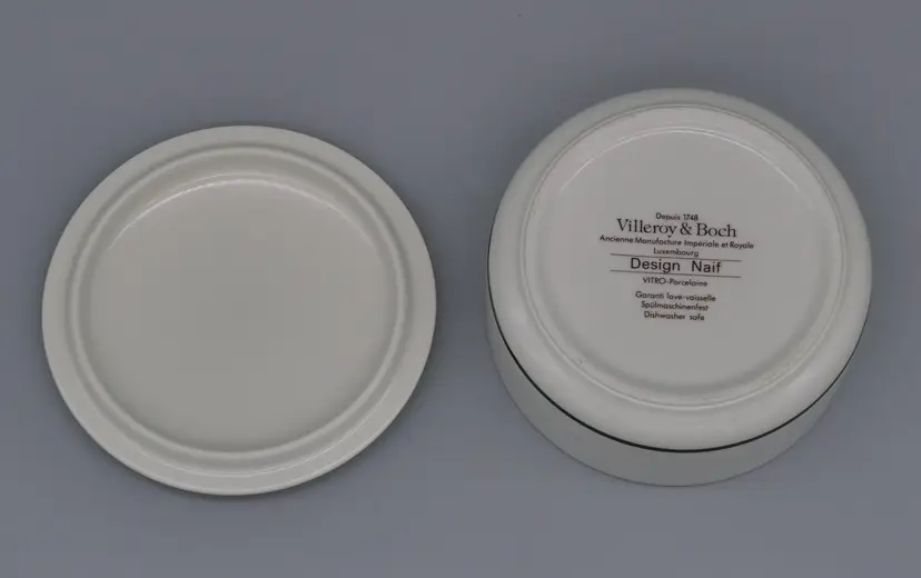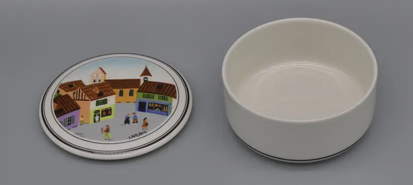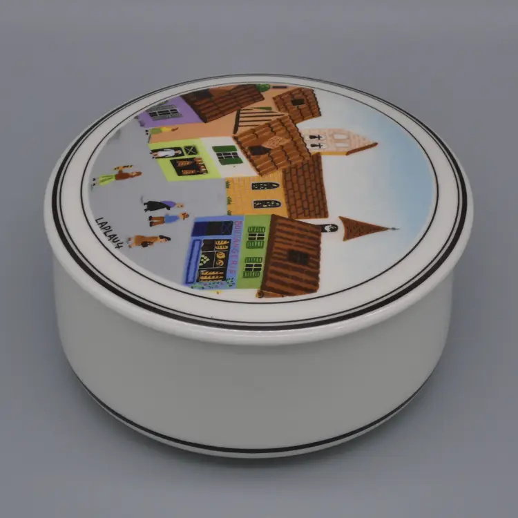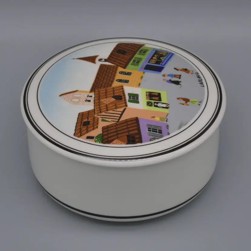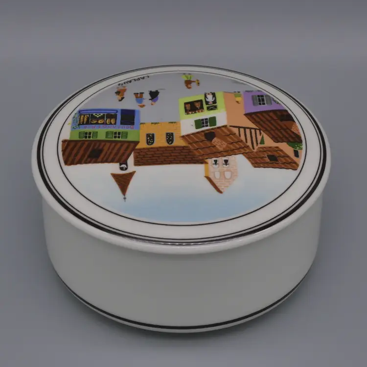 Featuring a colorful Village Square with people milling about on the lid White porcelain with black banding Artwork colors include browns, greens, blues, purples, peach and black Lid is slightly domed and signed: Laplau 4 Marked on bottom: Villeroy & Boch, Luxembourg, Design Naif, Porcelain, Dishwasher Safe The number 3 is embossed on the bottom Measures overall about 4" across x 2" tall Inside storage space measures about 3-5/8" wide x 1-1/2" deep Weighs about 9 ounces before being packaged to ship