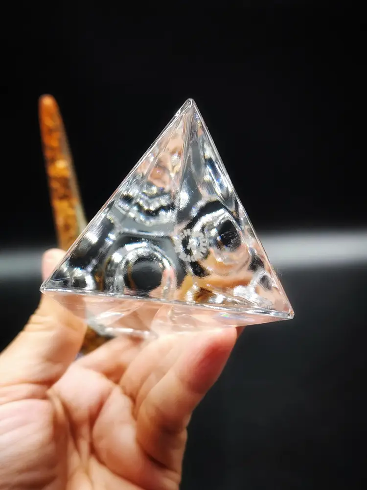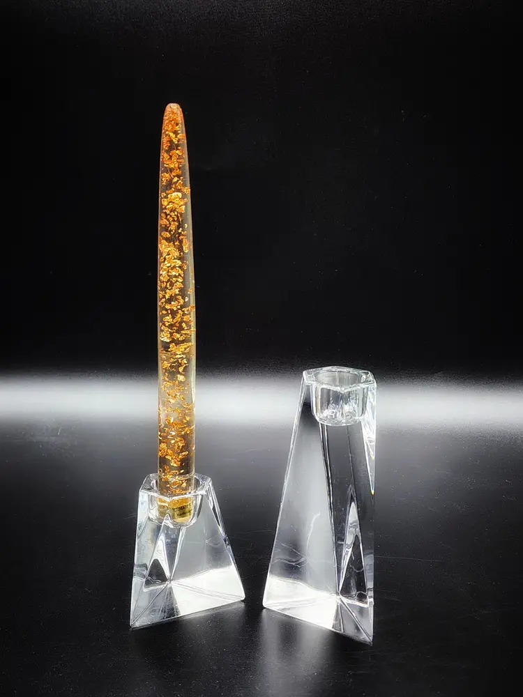 Marked, 5" and 2 1/2" tall, triangular faceted crystal. Condition: one tiny chip on one corner of the small one, one scratch on the big one. Candle is not included, it's for demo only.