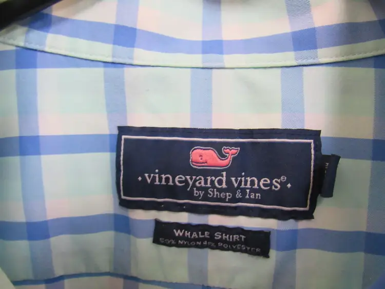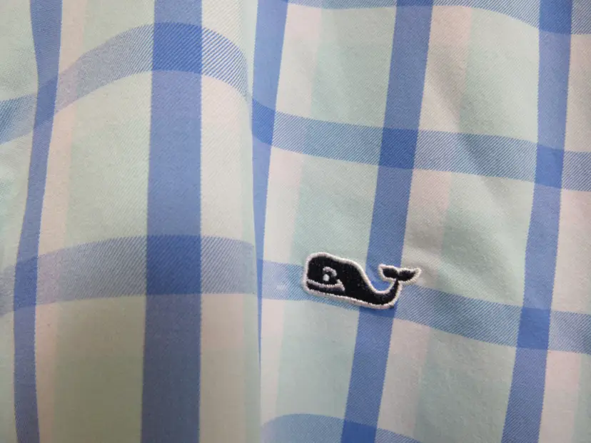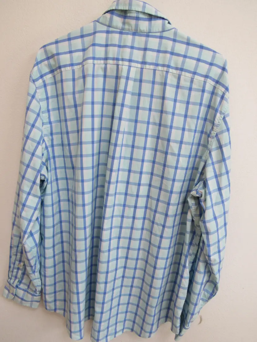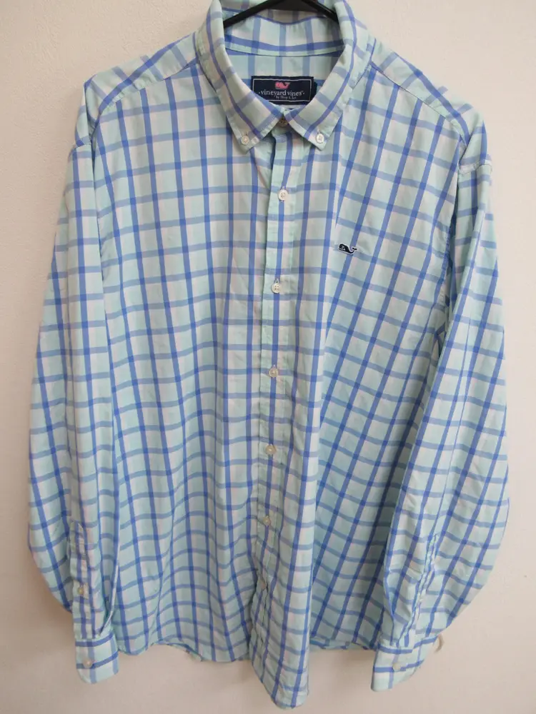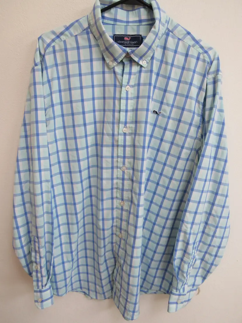 Vineyard Vines Whale blue/green check long sleeve button down shirt. Size 2XL. 27" armpit to armpit and 32.5" top of collar to bottom of hem. Nice condition. 4193