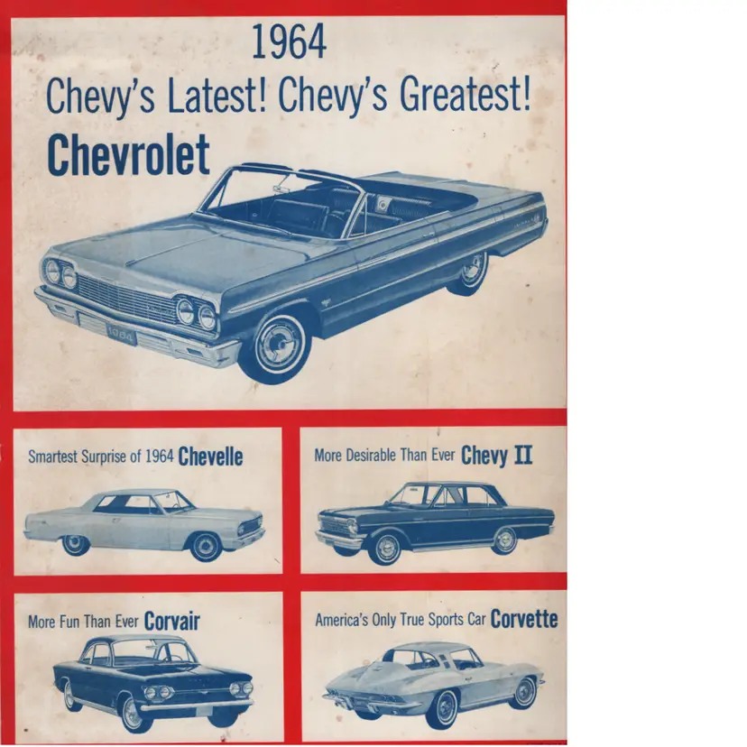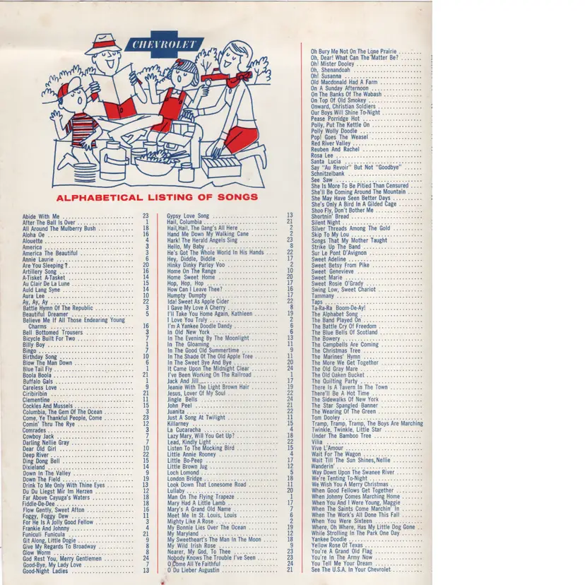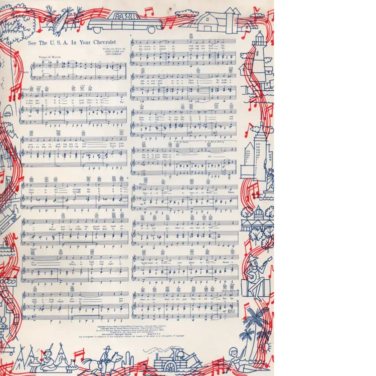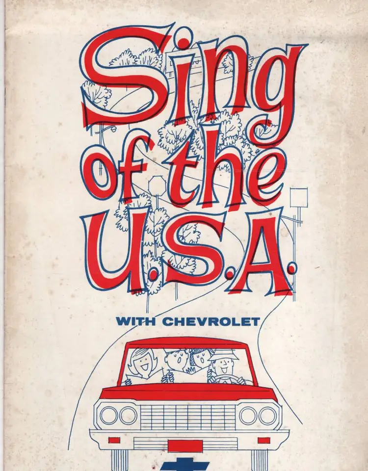 This song book has no date but the cars on the back cover are 1964 so will assume book is from that time. Contains the song See The Usa In Your Chevrolet. This was their jingle from 1949 and in use until around end of 1960s. Dinah Shore began singing it on The Dinah Shore Show, which Chevrolet sponsored. Her warm delivery made it a signature tune and deeply associated with the brand.