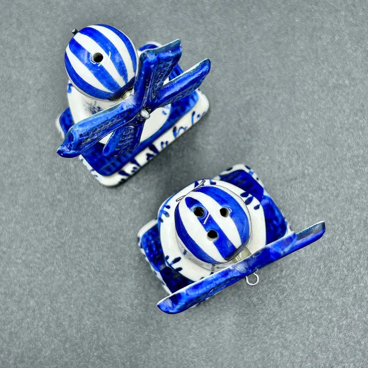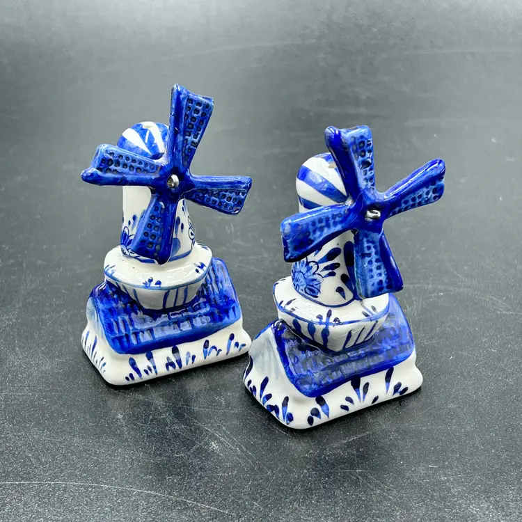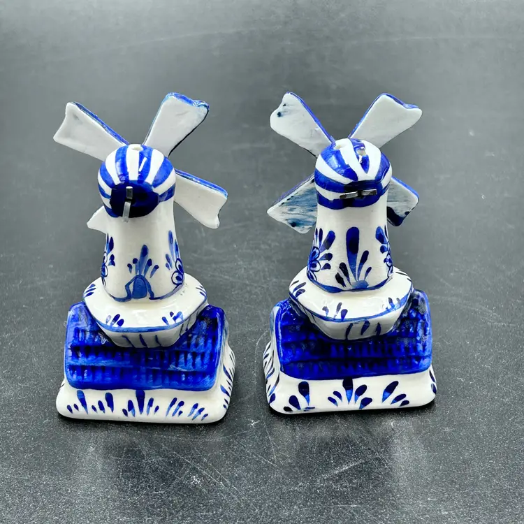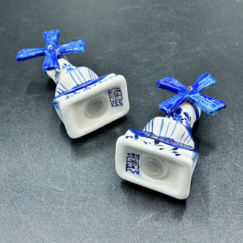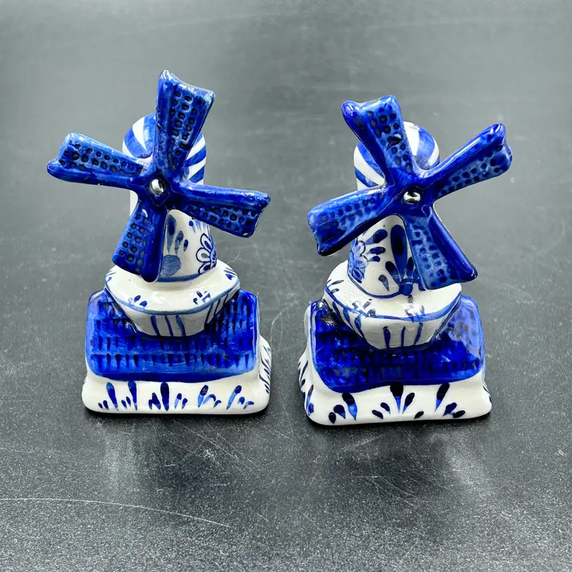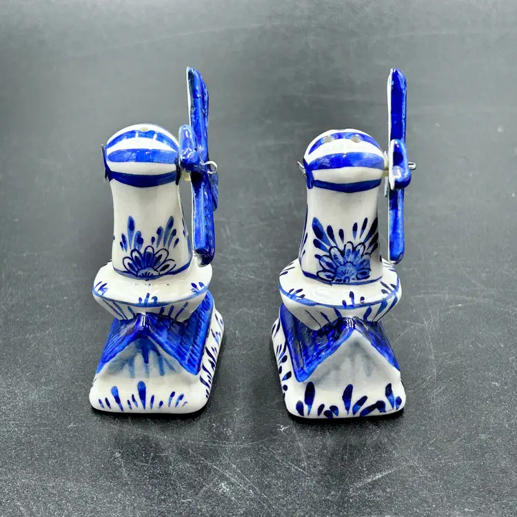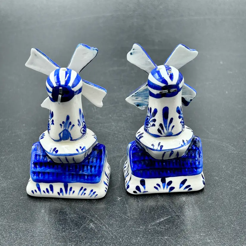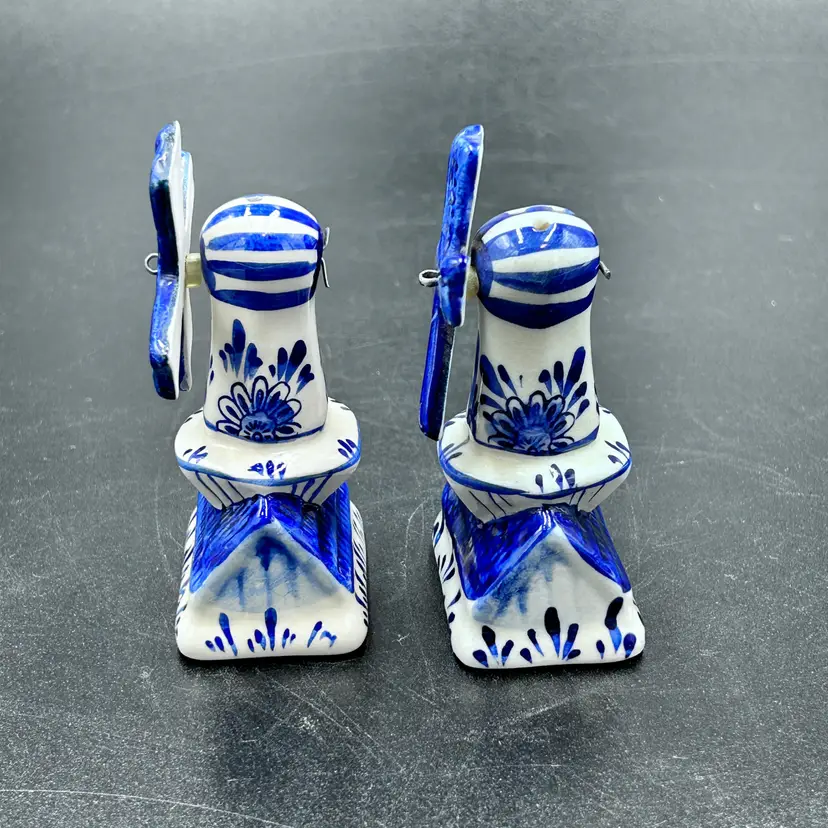 Cute Delft windmill hand painted ceramic salt and pepper shakers. Windmills twirl! Approximate size: 1 7/8" long x 1 3/8" wide x 3 1/2" high. Excellent condition.
