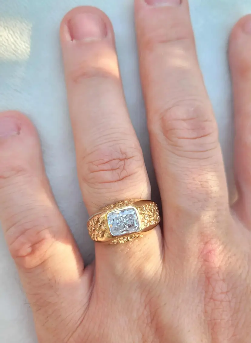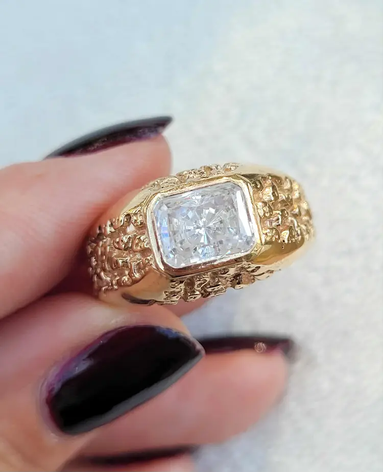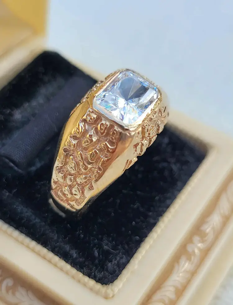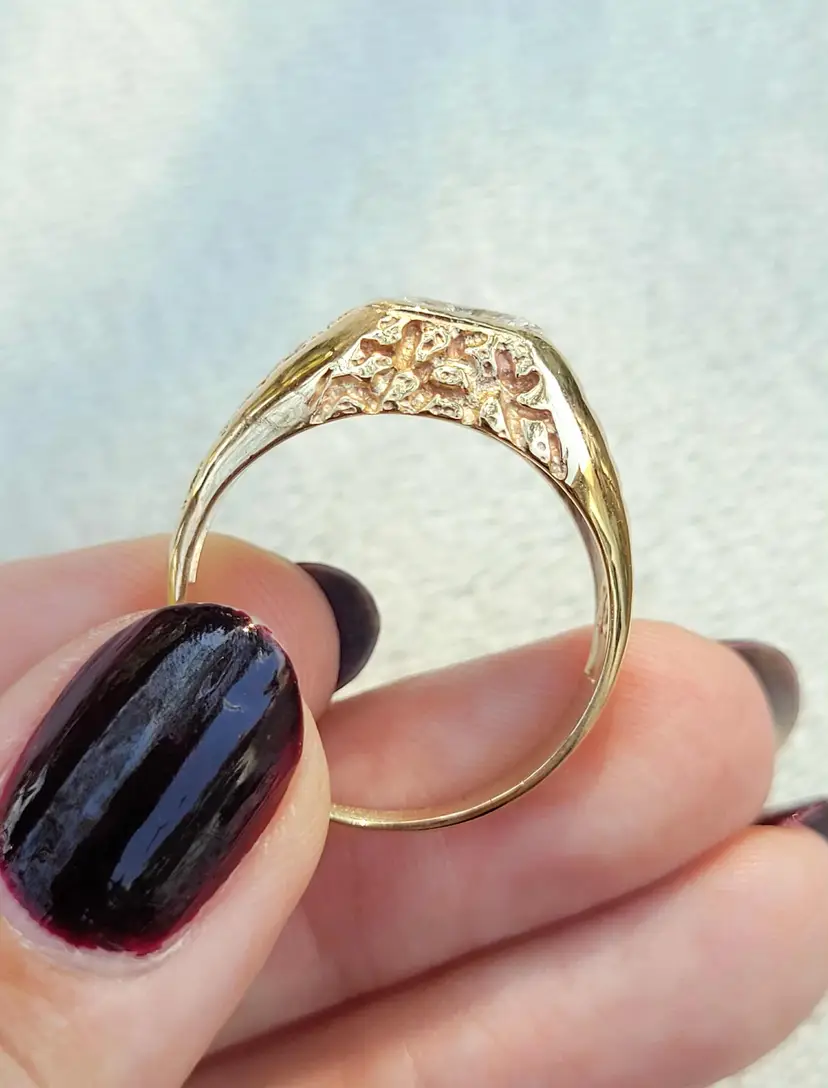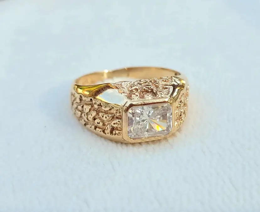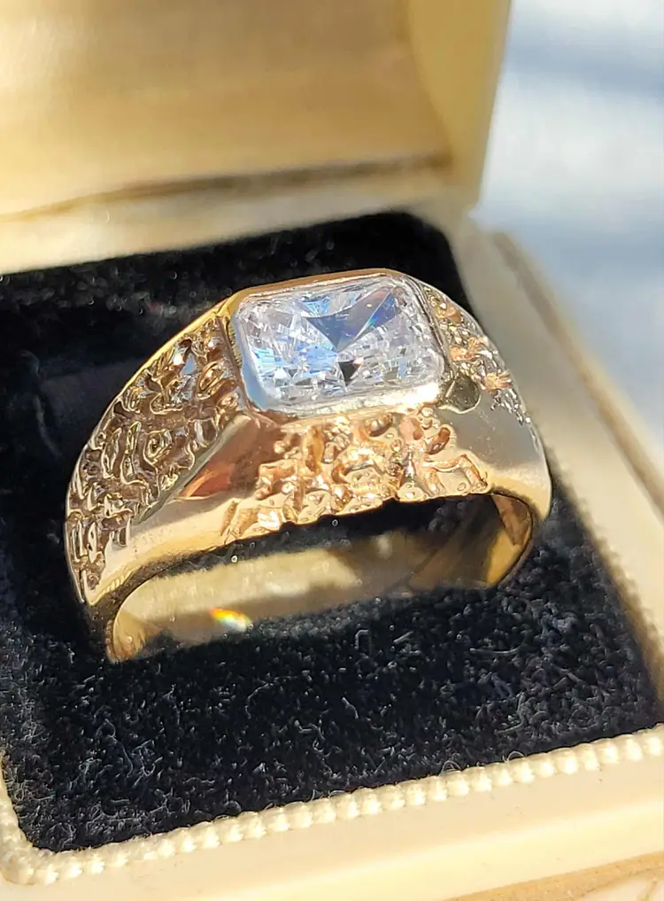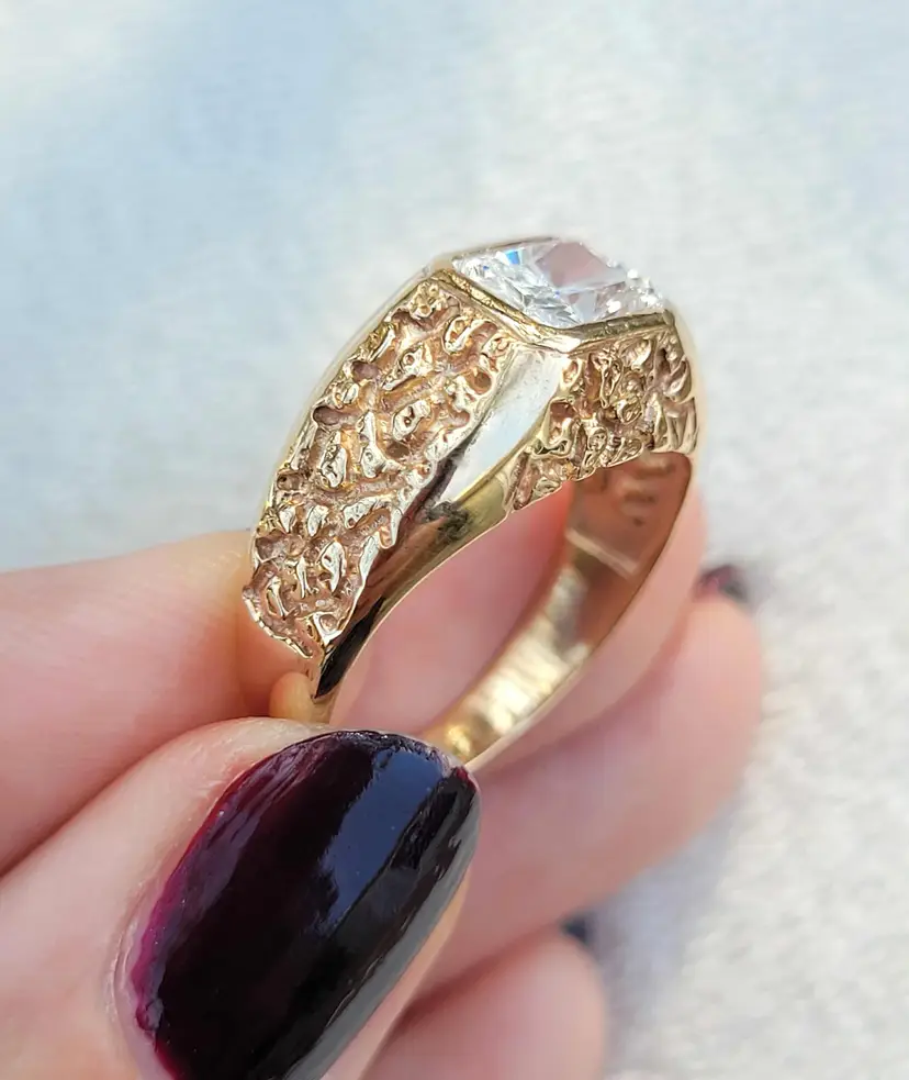Very handsome 1970s gold nugget ring with a massive, sparkling cubic zirconia! It's large and makes quite the statement, weighing in at 5.4 grams. The gold content has been verified via Auracle tester. It's in good condition, please see pictures for details and measurements. Does not include my ring box.
