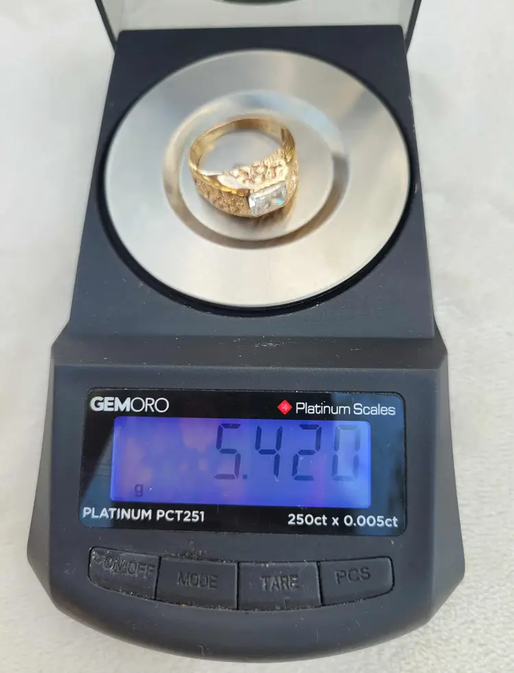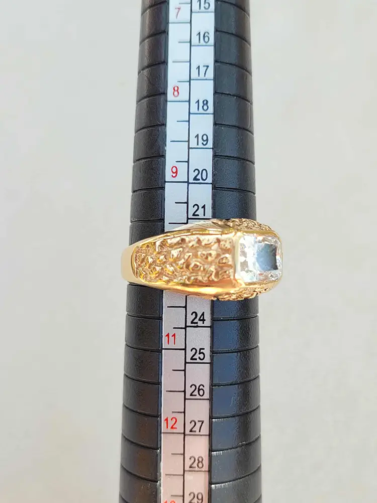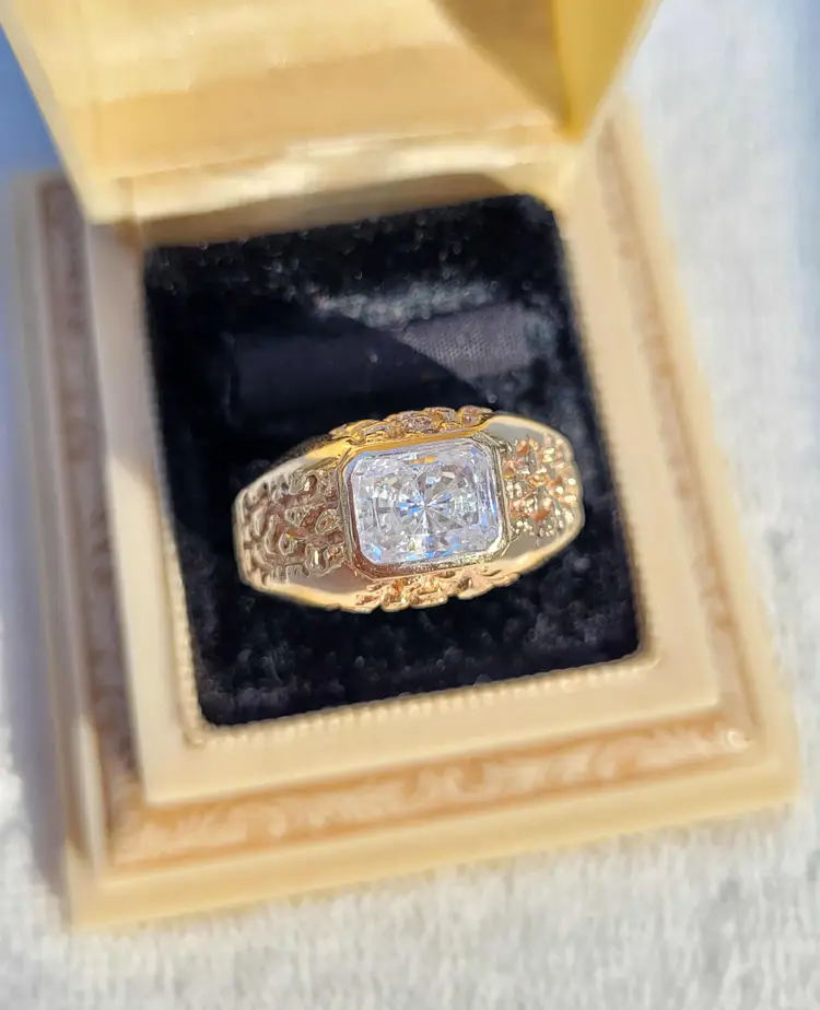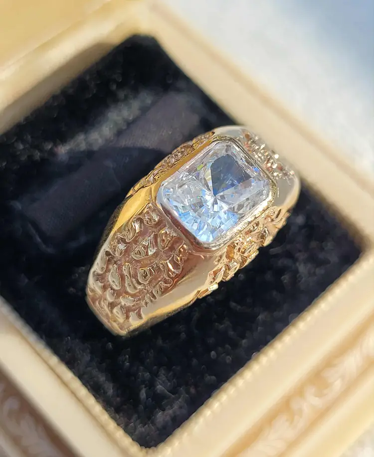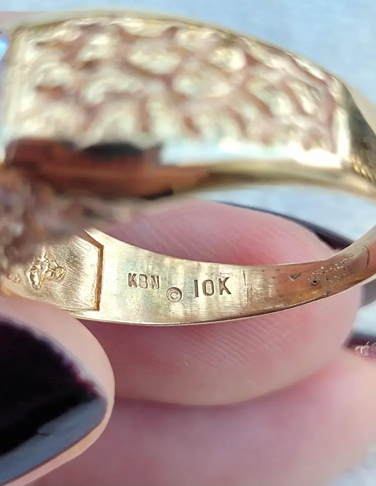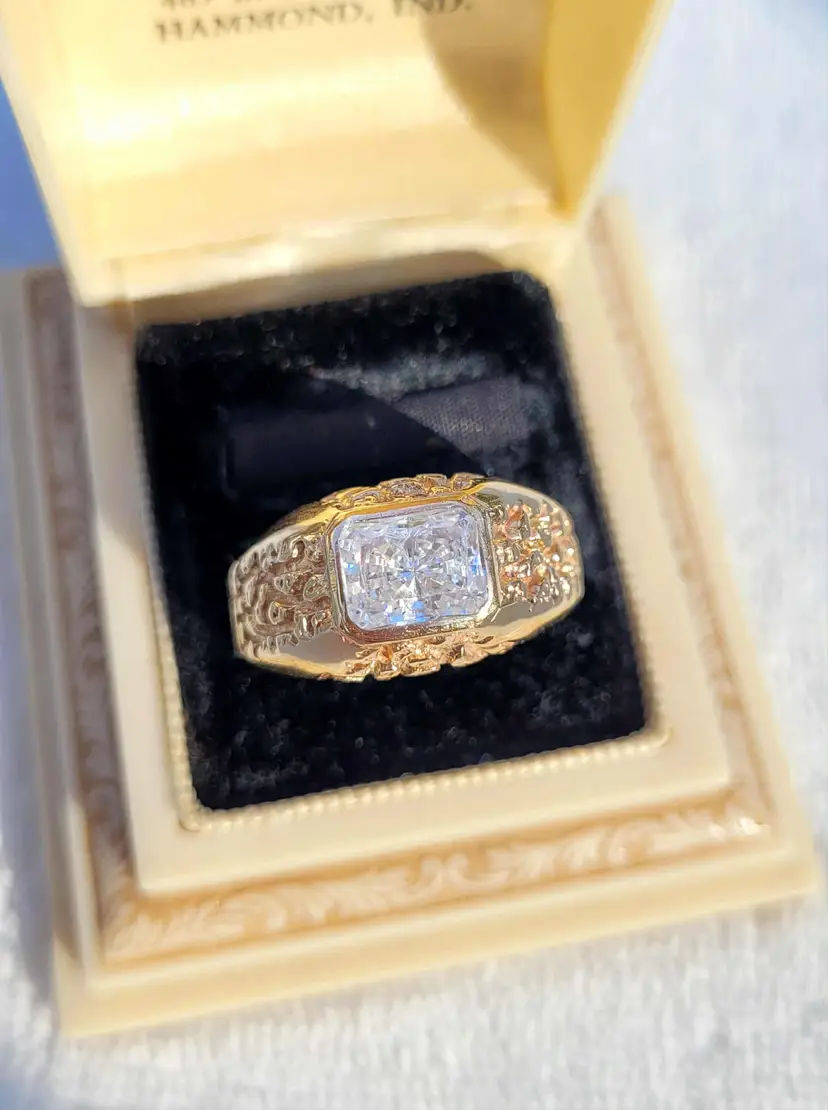 Very handsome 1970s gold nugget ring with a massive, sparkling cubic zirconia! It's large and makes quite the statement, weighing in at 5.4 grams. The gold content has been verified via Auracle tester. It's in good condition, please see pictures for details and measurements. Does not include my ring box.