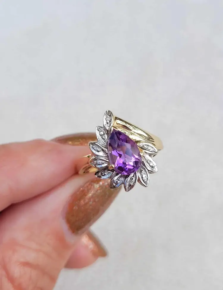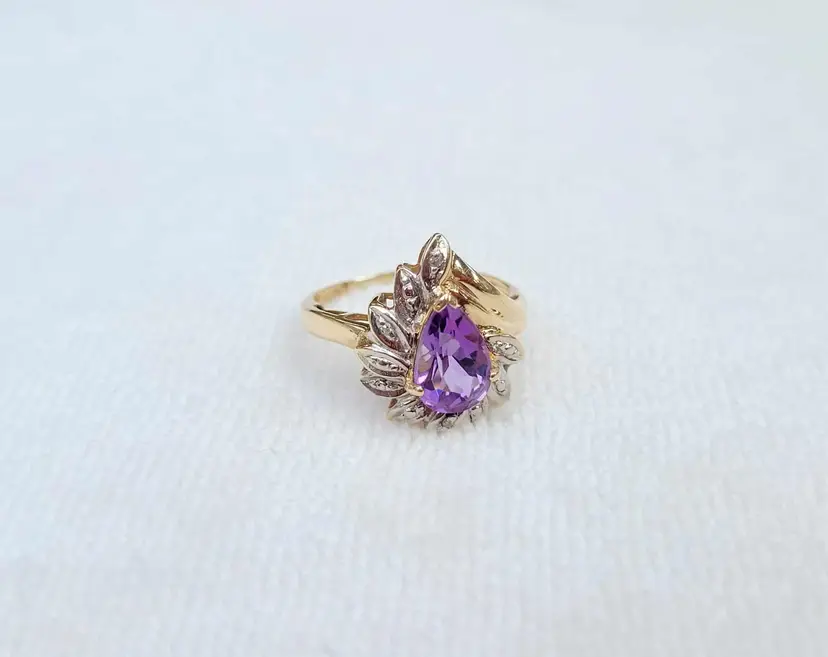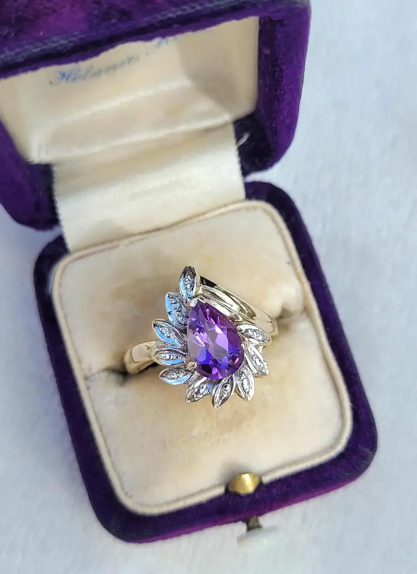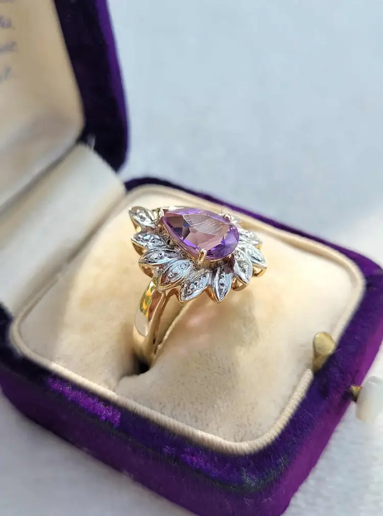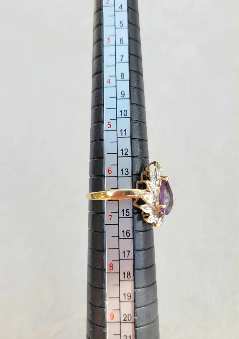 Beautiful solid 10k yellow gold ring with a pear-shaped purple amethyst center stone surrounded by petals with a sparkling genuine diamond in the center of each. The gemstones are verified via Presidium tester; it is marked 10k with the gold content verified via Auracle tester. This ring is from an estate and was purchased in the 1970s, in good condition. Please see pictures for details and measurements, does not include my ring box.