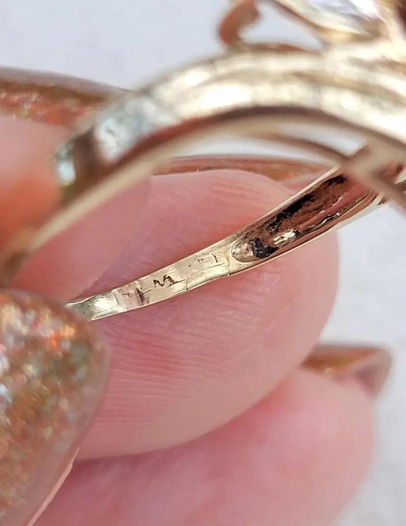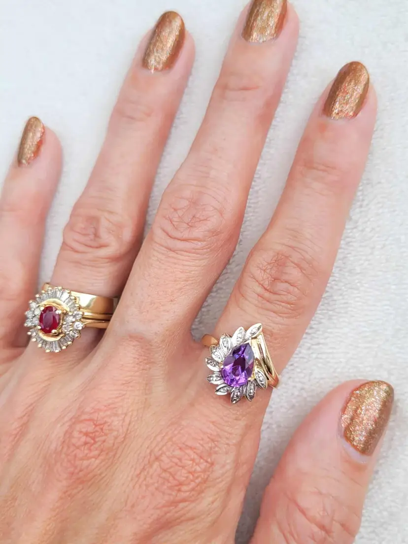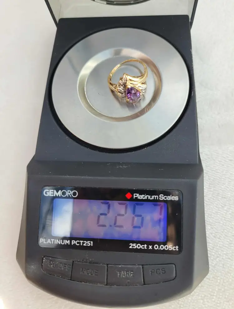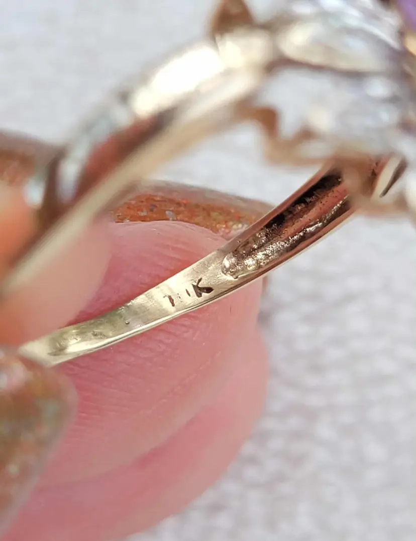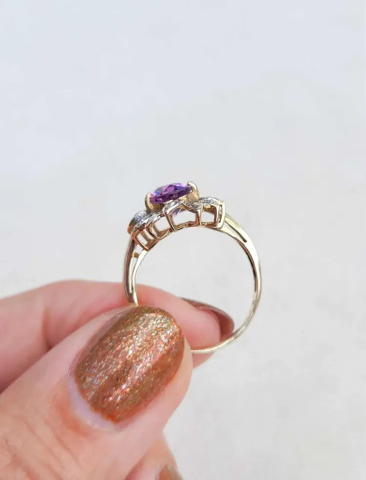 Beautiful solid 10k yellow gold ring with a pear-shaped purple amethyst center stone surrounded by petals with a sparkling genuine diamond in the center of each. The gemstones are verified via Presidium tester; it is marked 10k with the gold content verified via Auracle tester. This ring is from an estate and was purchased in the 1970s, in good condition. Please see pictures for details and measurements, does not include my ring box.
