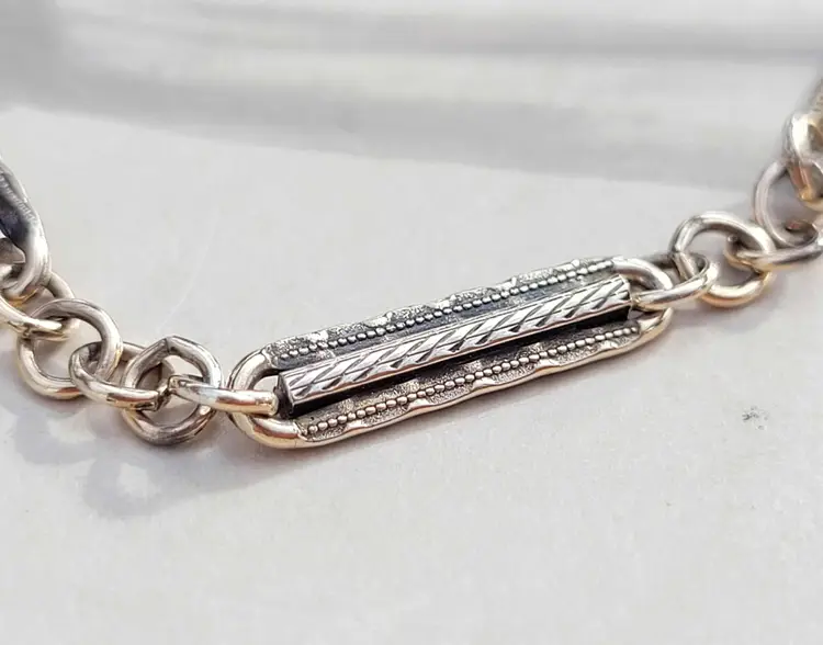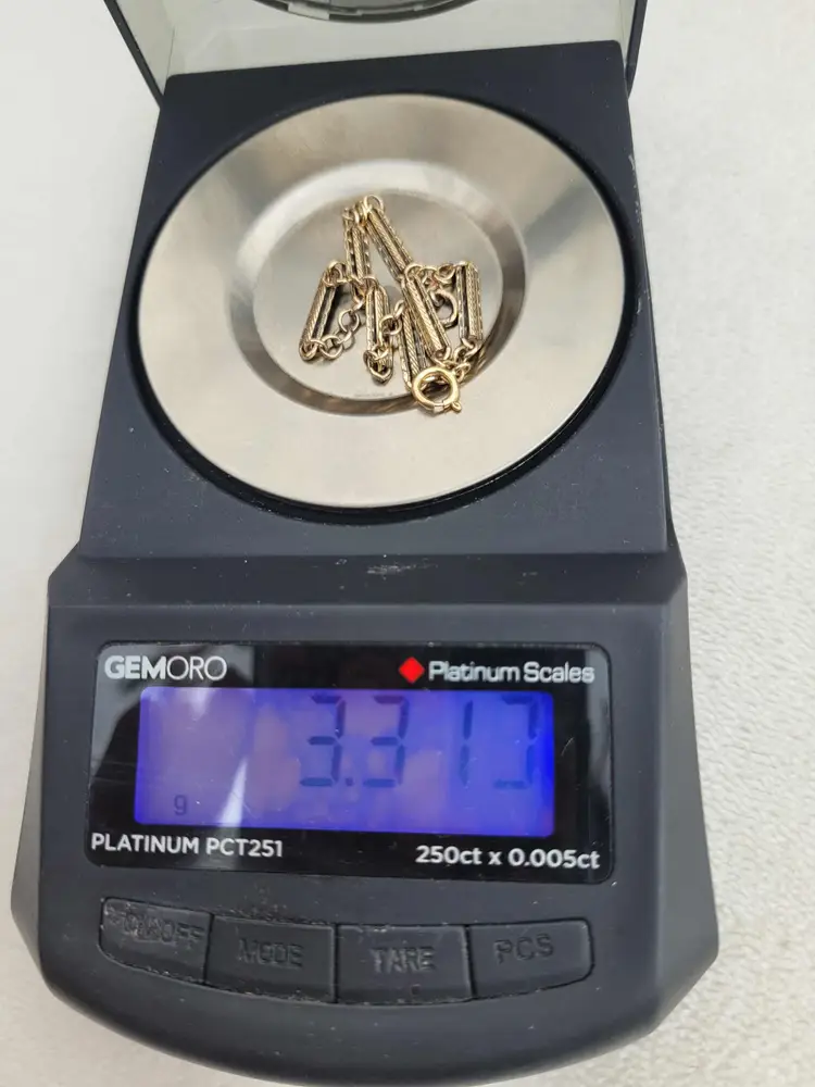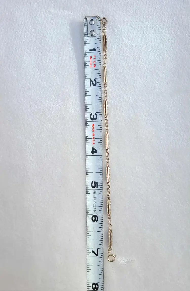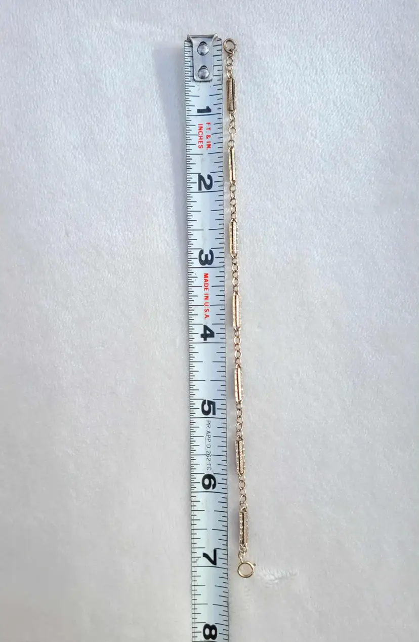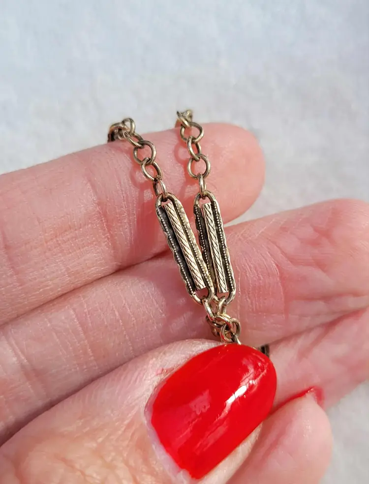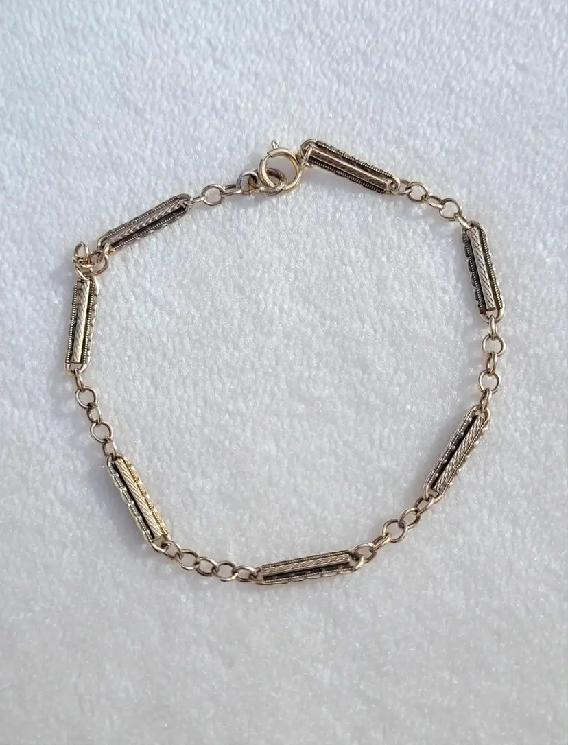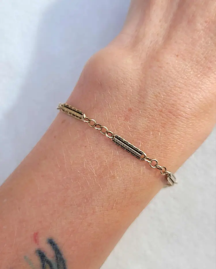 Elegant solid 10k yellow gold bracelet made from the pure gold etched bar links of an antique pocket watch chain! It is marked 10k, with all parts having the gold content verified via Auracle tester and acid testing. It is in good condition, weighing in at 3.3 grams. Please see pictures for details and measurements.