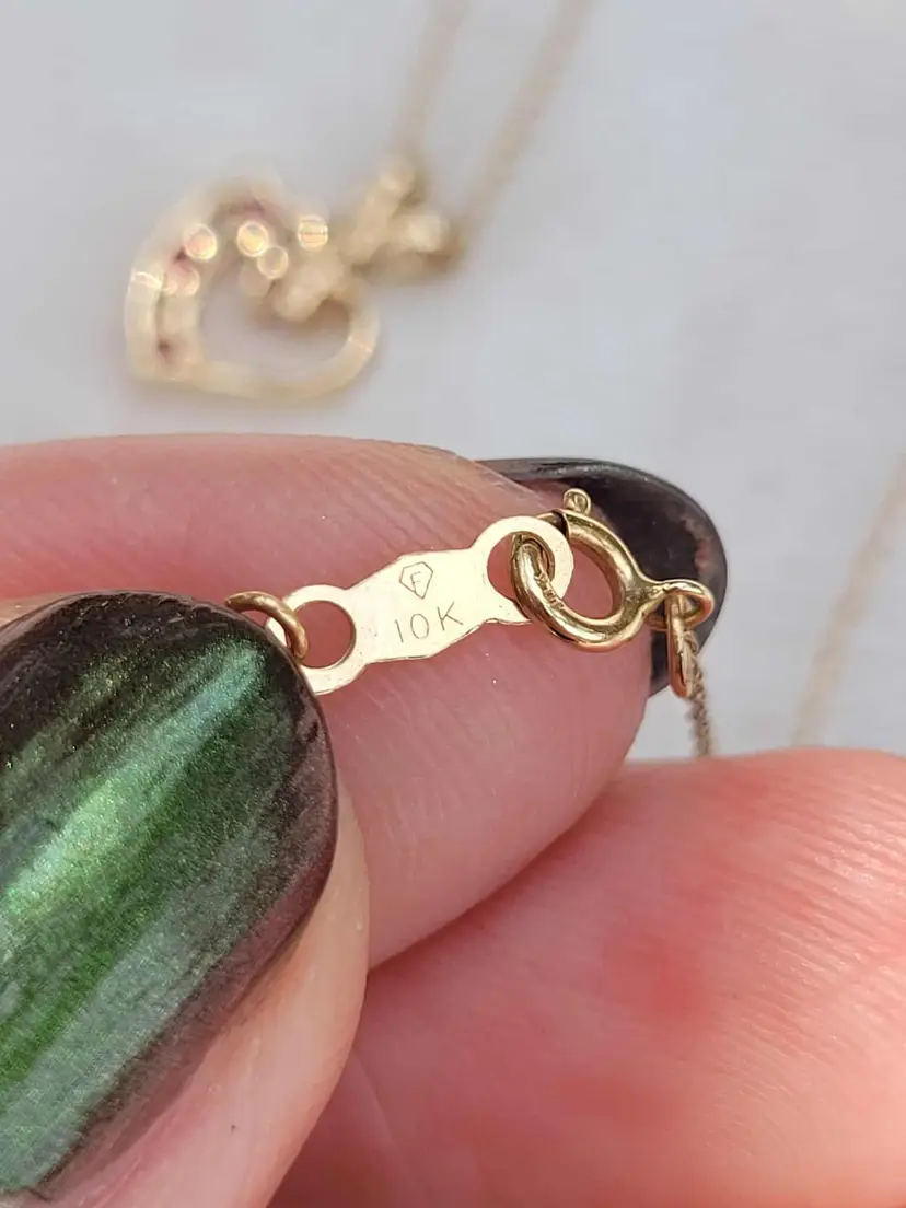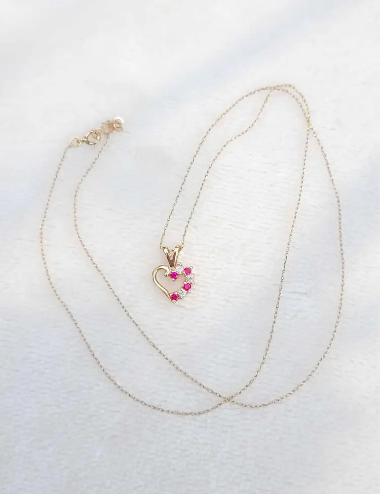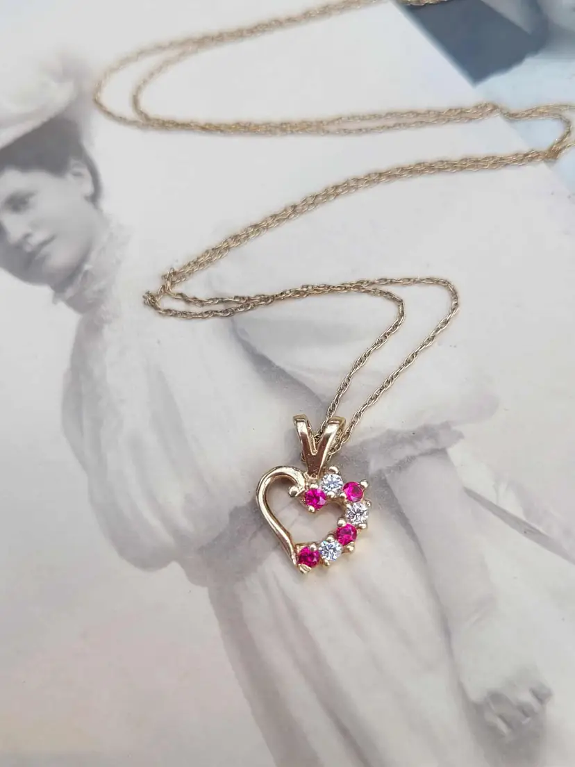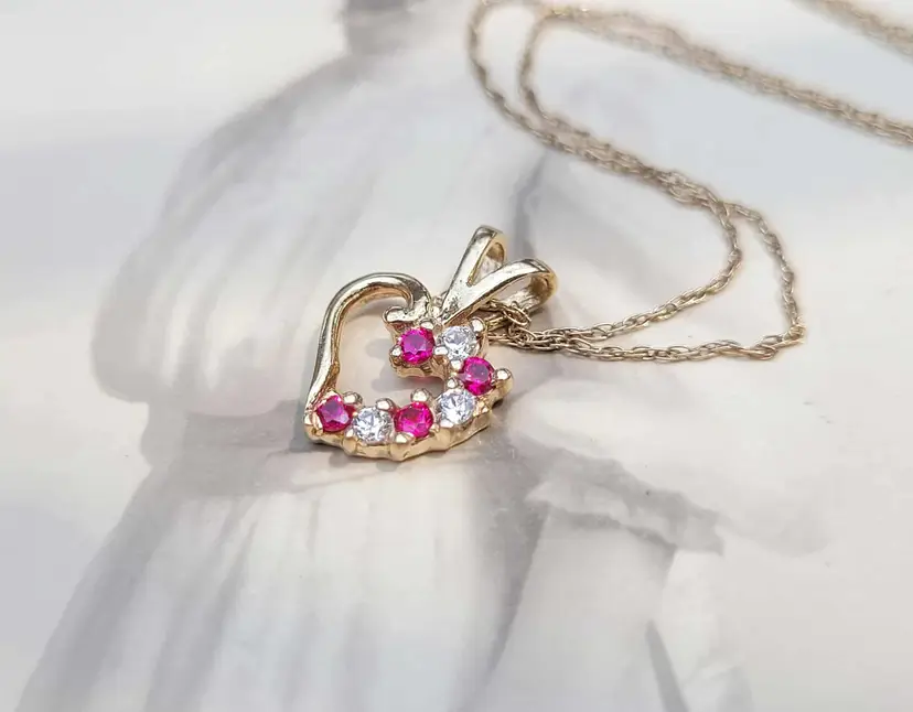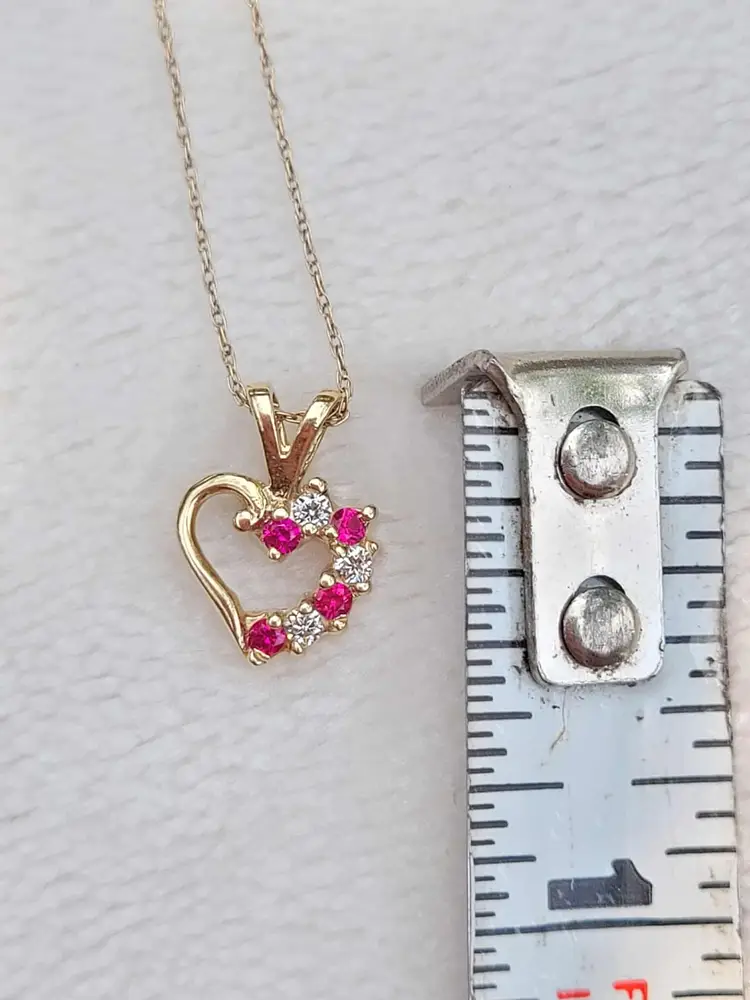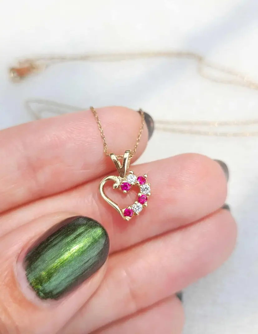 Romantic ruby heart necklace, in solid 10k yellow gold with little cz accents. The gold content has been verified via Auracle tester and the rubies verified via Presidium tester. This is circa 1990s and in good condition. Please see pictures for details and measurements.
