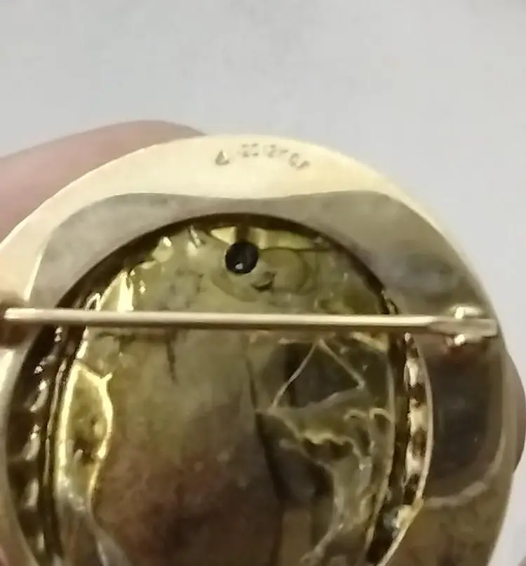 Item is pre-owned and in good condition with no broken pieces. There are a few very slight surface scratches, but nothing deep. I'm not sure if there is supposed to be a back on, because you can see the glue where it was used, but does not go over on the gold nor does it affect the use.