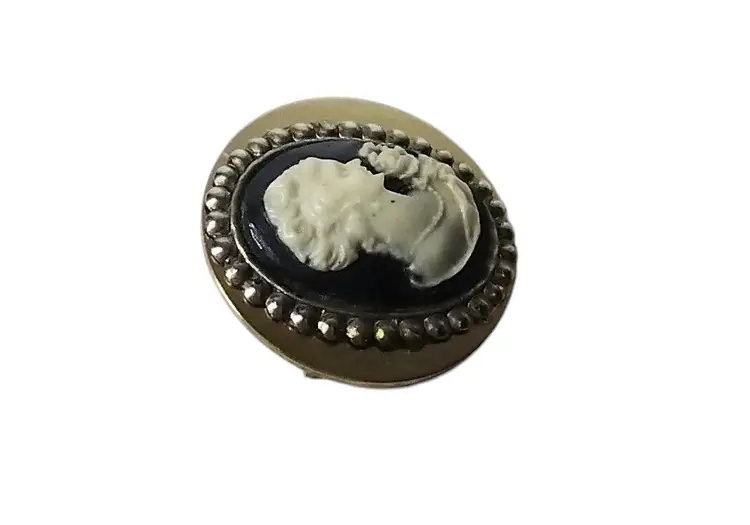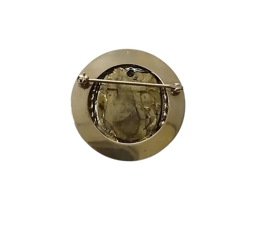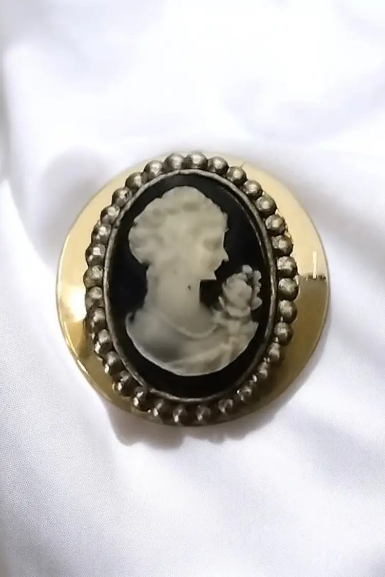 This is a beautiful antique? Piece with a black Cameo lady with flowers with an oval in a round Gold filled piece. Brooch measures 1.25" tall x 1.25" wide.
