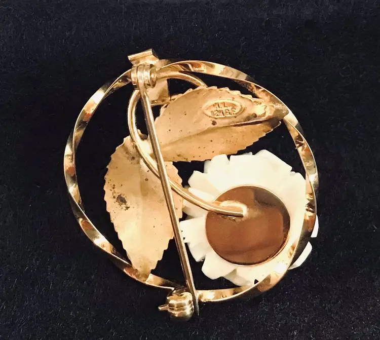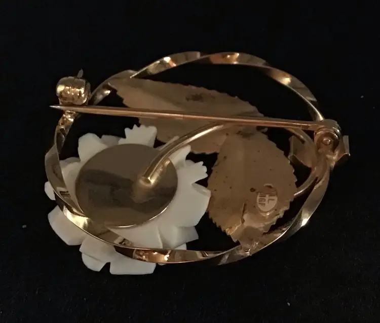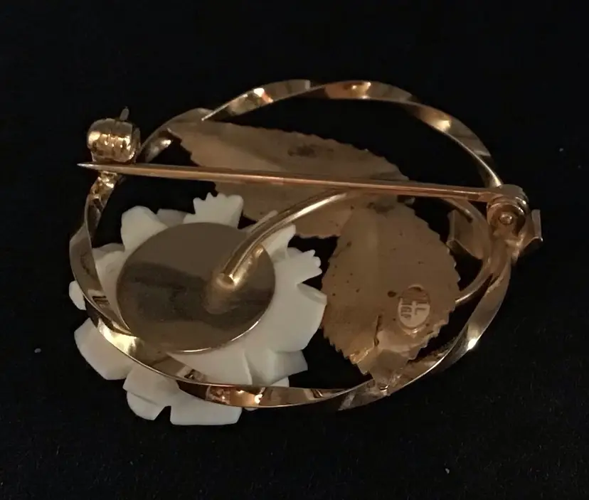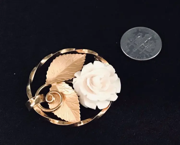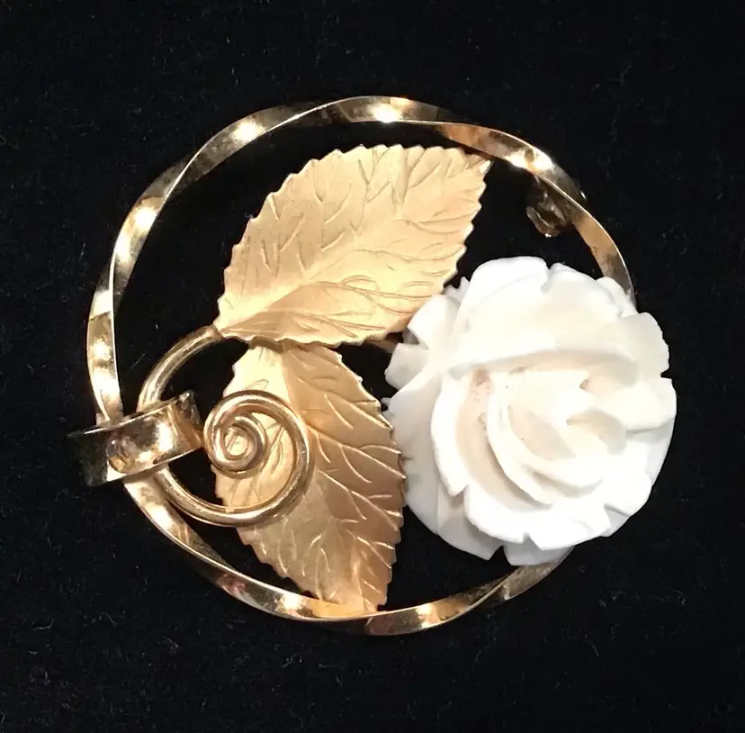 Signed K.L. (Karen Lynne) carved white celluloid rose, 12k gold filled twisted circular border with textured matte leaves. #203