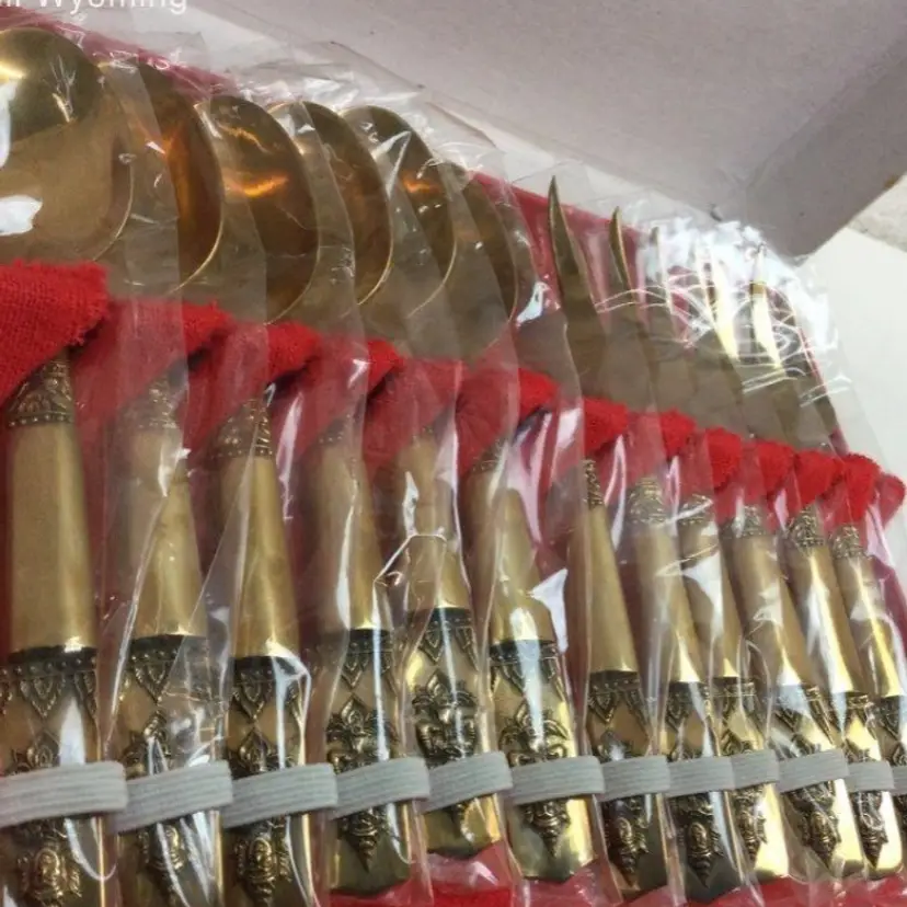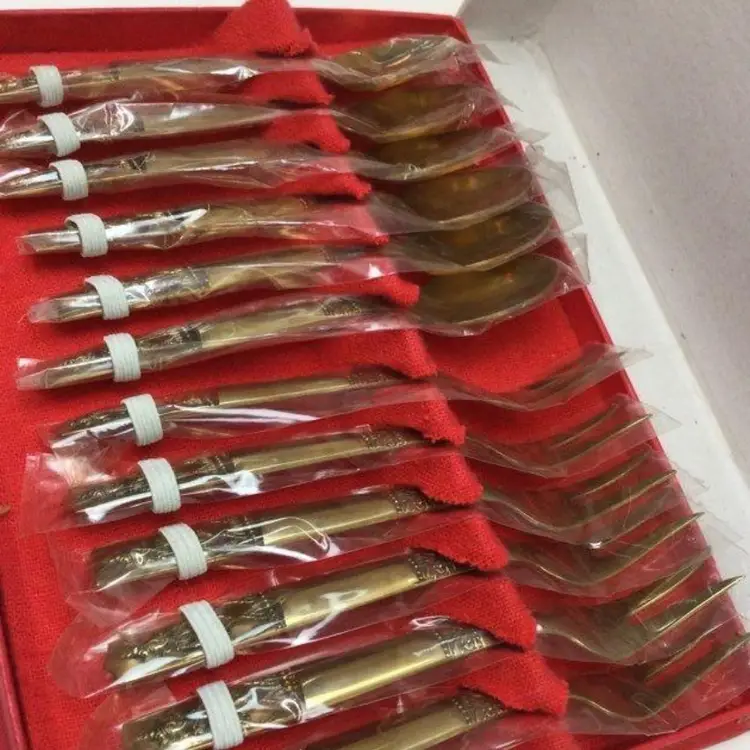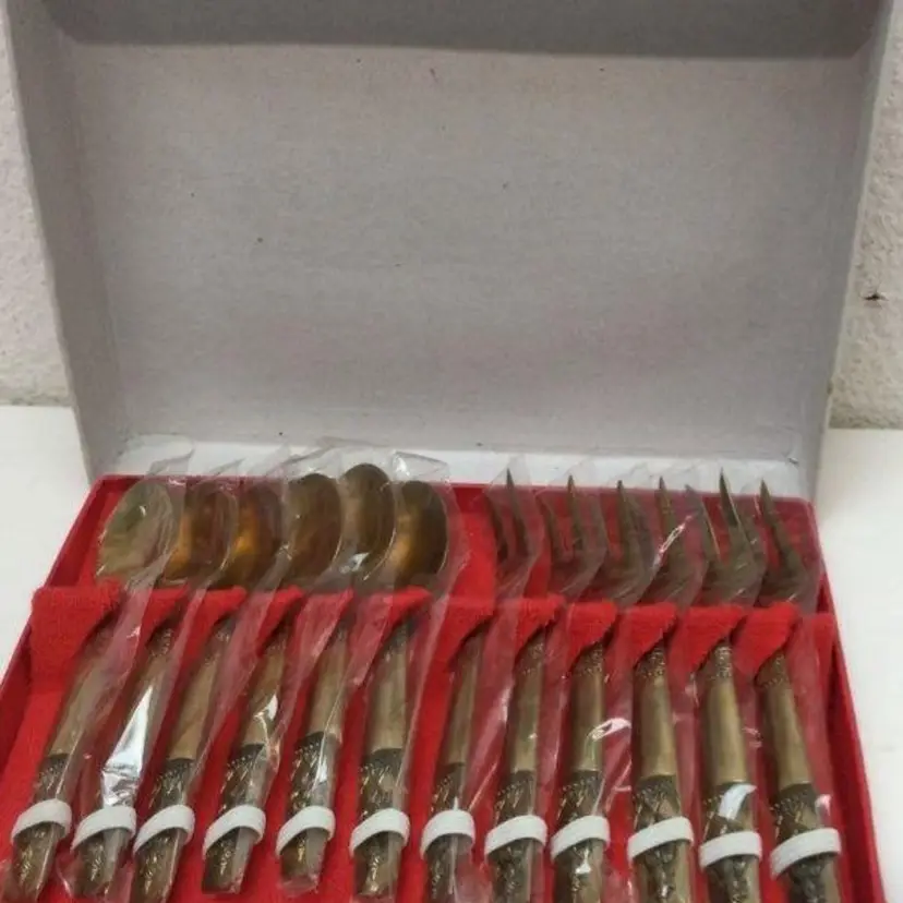 Features: • Quantity: 12 pieces (6 Dessert Spoons, 6 Dessert Forks). • Motif: Ornate embossed deity/goddess finials on the handles. • Material: Solid Nickel Bronze/Brass with a high-shine gold-tone finish. • Dimensions: Approximately 5 to 5.5 inches in length (refer to images for scale). • Condition: Excellent vintage condition; many pieces remain in their original protective plastic sleeves. • Packaging: Comes in the original red-lined presentation box. Ideal For: • Mid-Century Modern (MCM) collectors. • Bohemian or eclectic table settings. • Serving desserts, appetizers, or tea/coffee.