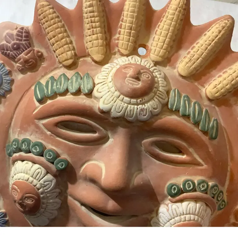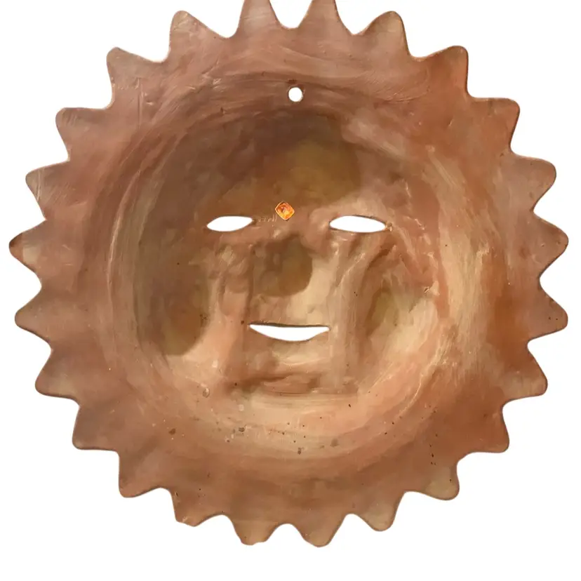 This item is a vintage Mexican terracotta folk art clay sun wall plaque.