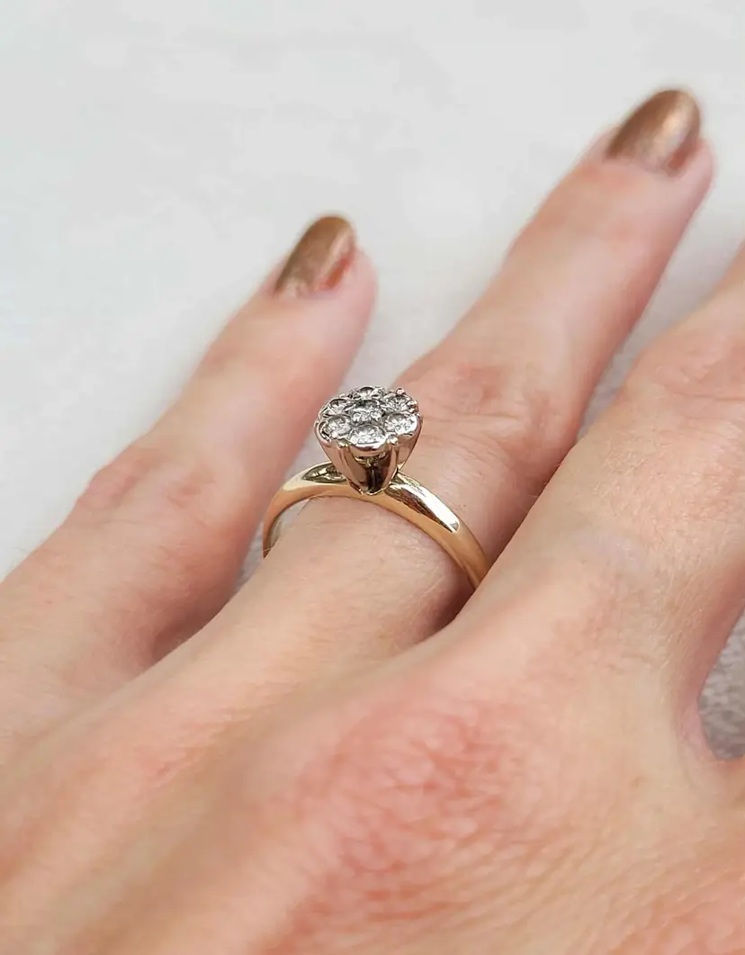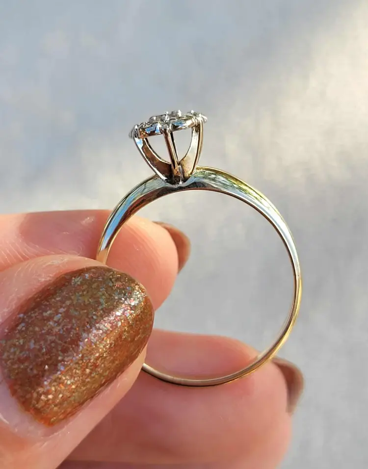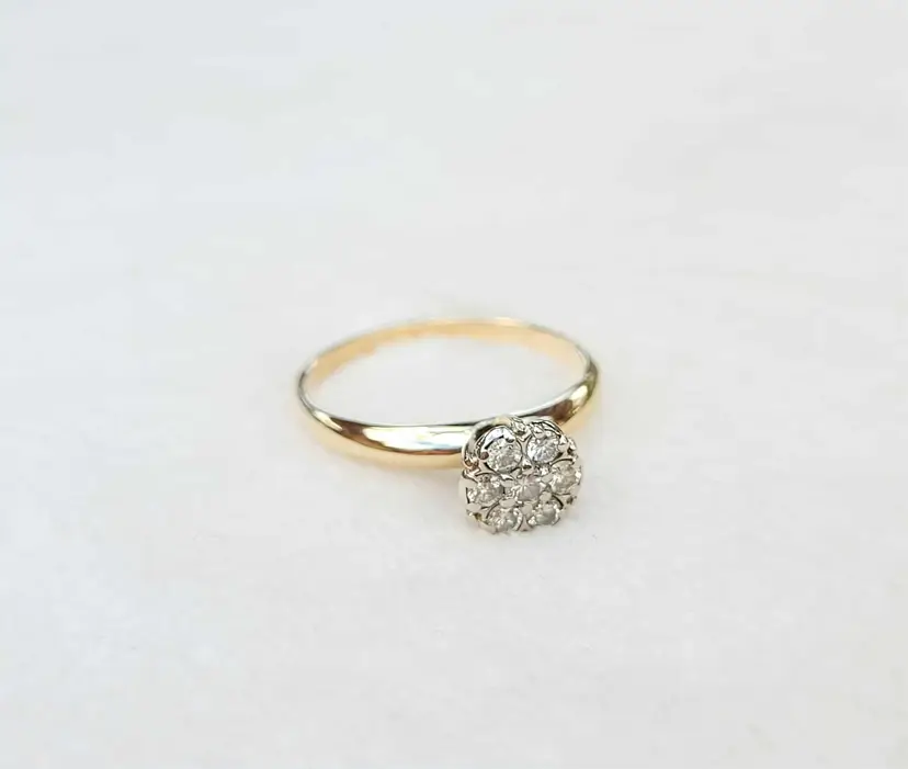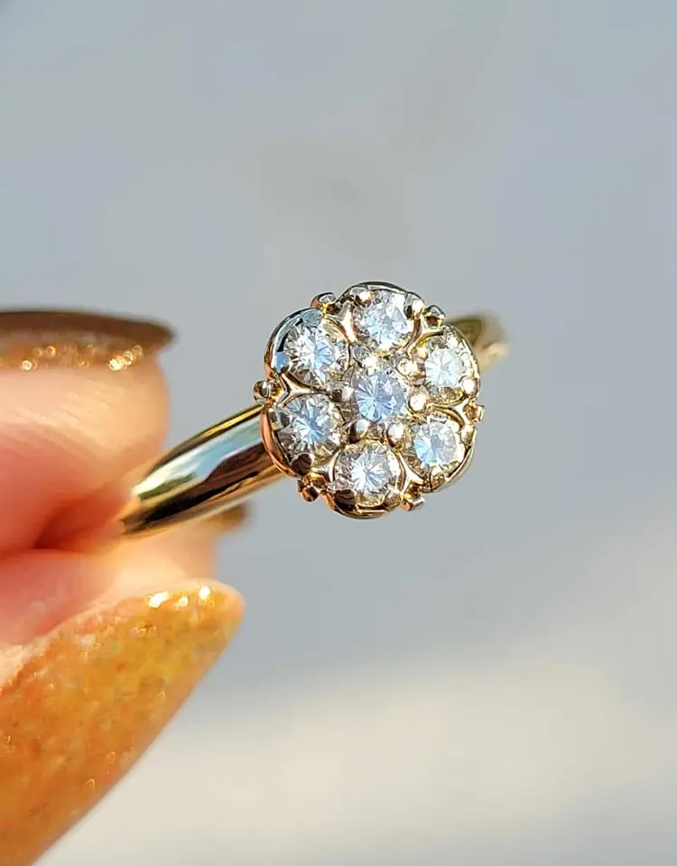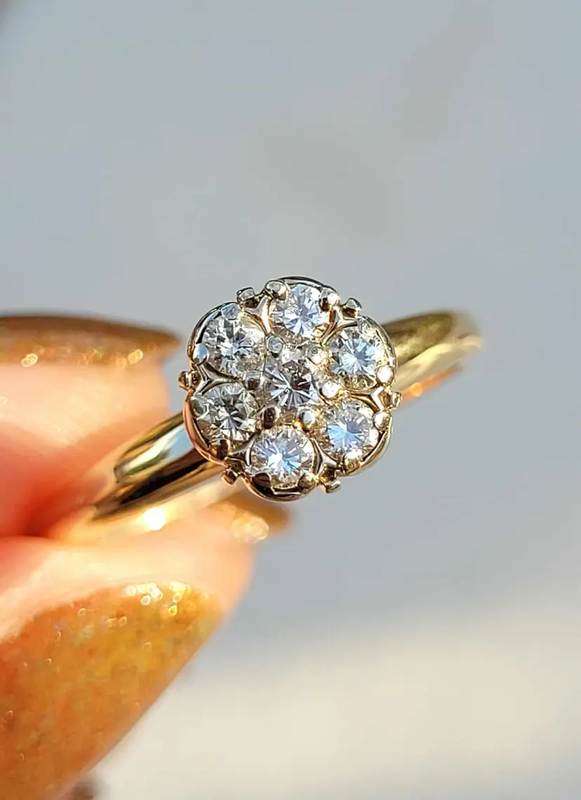 Absolutely stunning solid 14k yellow gold ring with seven sparkling genuine diamonds in a floral-shaped cluster! This would make a wonderful classic wedding ring, and the diamonds really are an exceptional cut and clarity that's hard to pick up in photos. The diamonds are natural and are each 2mm in width, verified via Presidium tester and microscopy. Due to the setting we're unable to get a depth measurement on them and therefore cannot get an accurate carat measurement. It is marked 14k with the gold content verified via Auracle tester and acid testing. This ring is from an estate and was purchased in the early 1970s, in very good condition. Please see pictures for details and measurements, does not include my ring box.