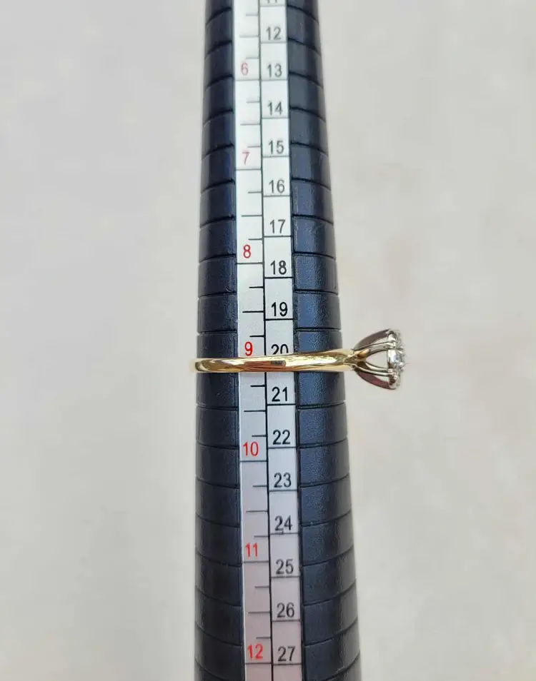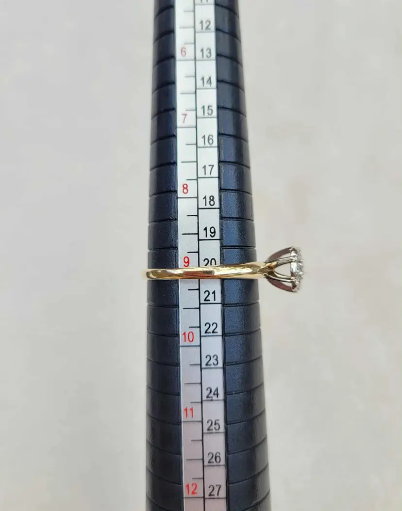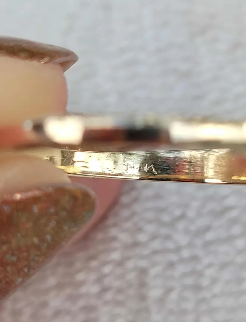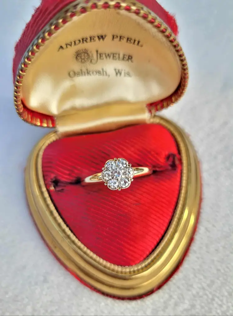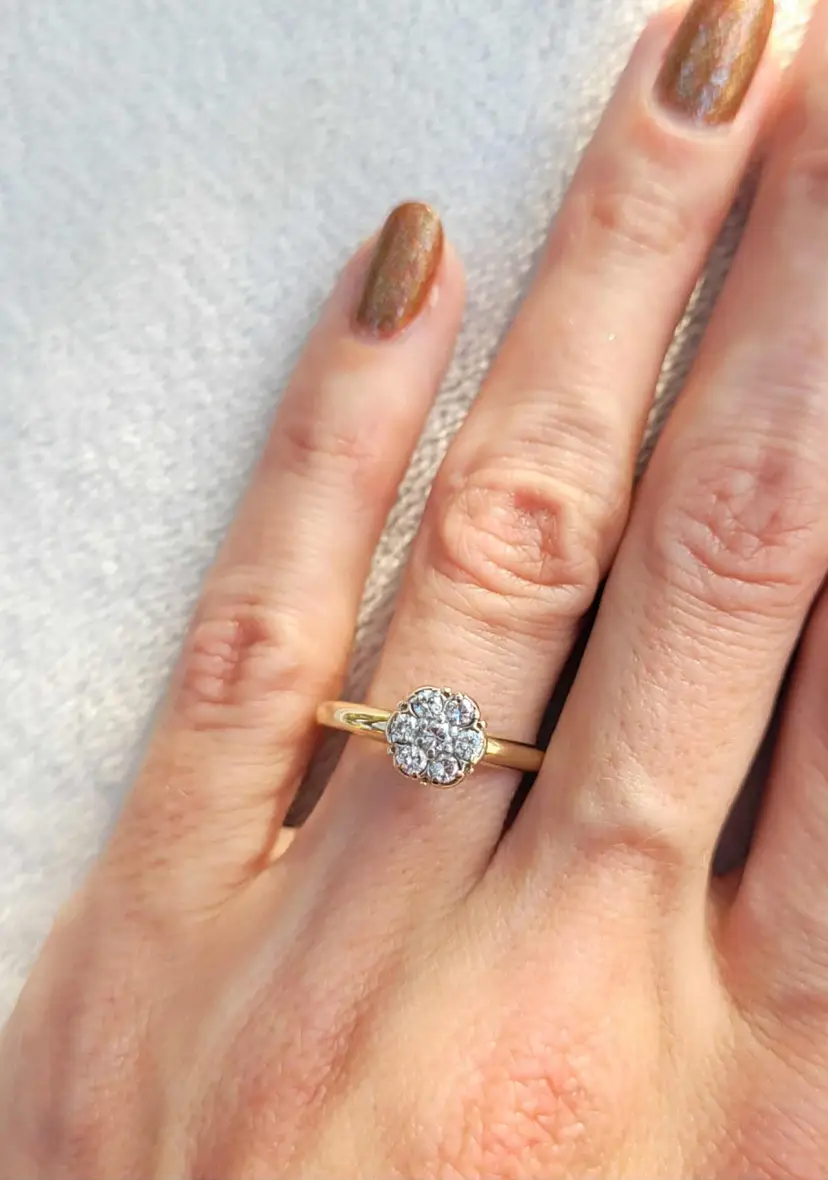 Absolutely stunning solid 14k yellow gold ring with seven sparkling genuine diamonds in a floral-shaped cluster! This would make a wonderful classic wedding ring, and the diamonds really are an exceptional cut and clarity that's hard to pick up in photos. The diamonds are natural and are each 2mm in width, verified via Presidium tester and microscopy. Due to the setting we're unable to get a depth measurement on them and therefore cannot get an accurate carat measurement. It is marked 14k with the gold content verified via Auracle tester and acid testing. This ring is from an estate and was purchased in the early 1970s, in very good condition. Please see pictures for details and measurements, does not include my ring box.