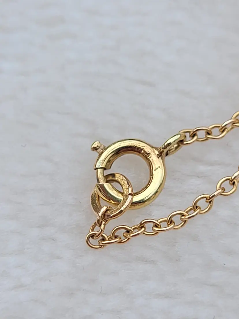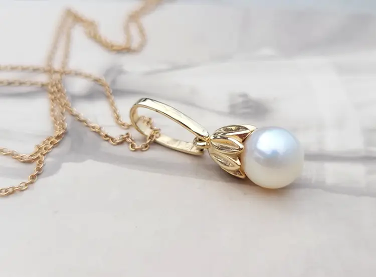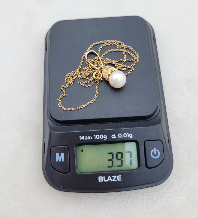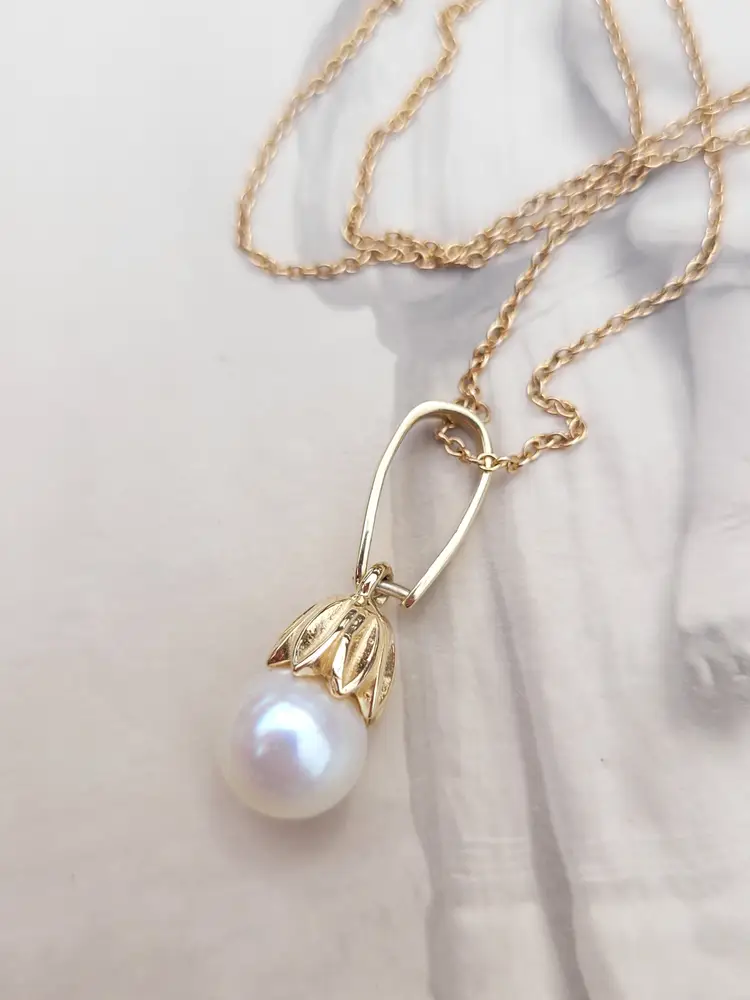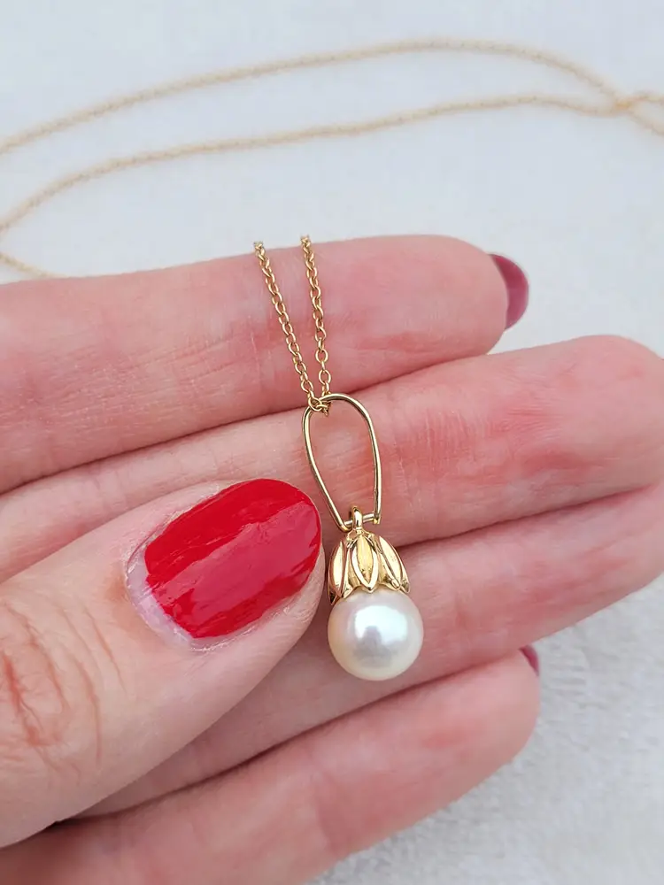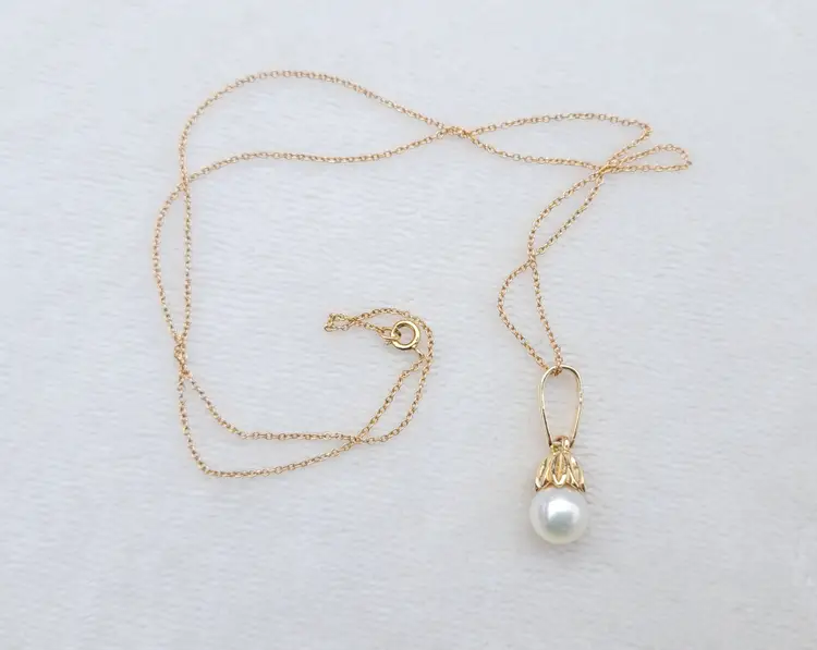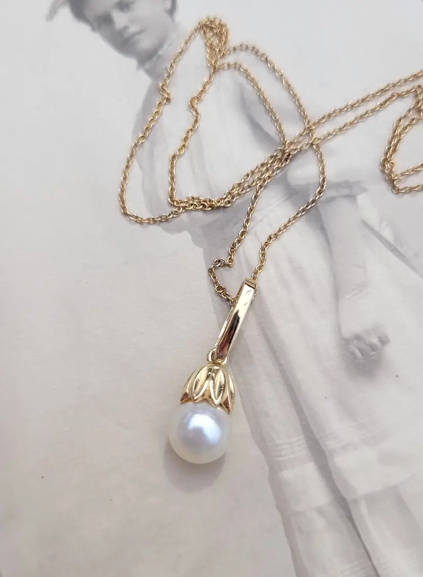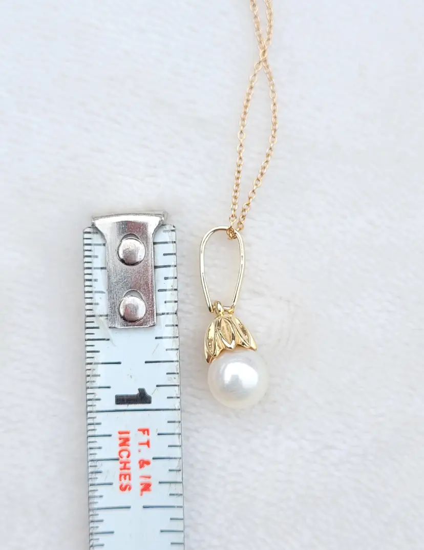 Elegant lustrous pearl crowned with a solid 14k gold cap and on a 14k gold 18" chain. This is from an estate and circa 1980s/90s, in good condition. The chain is marked as 14k and both pieces test appropriately. Please see pictures for details and measurements.
