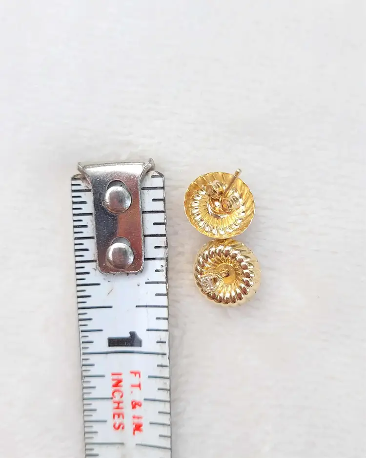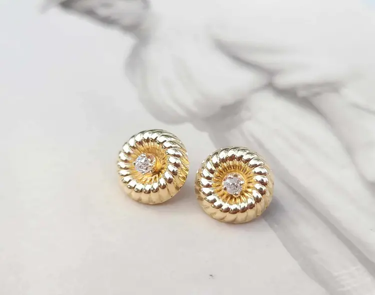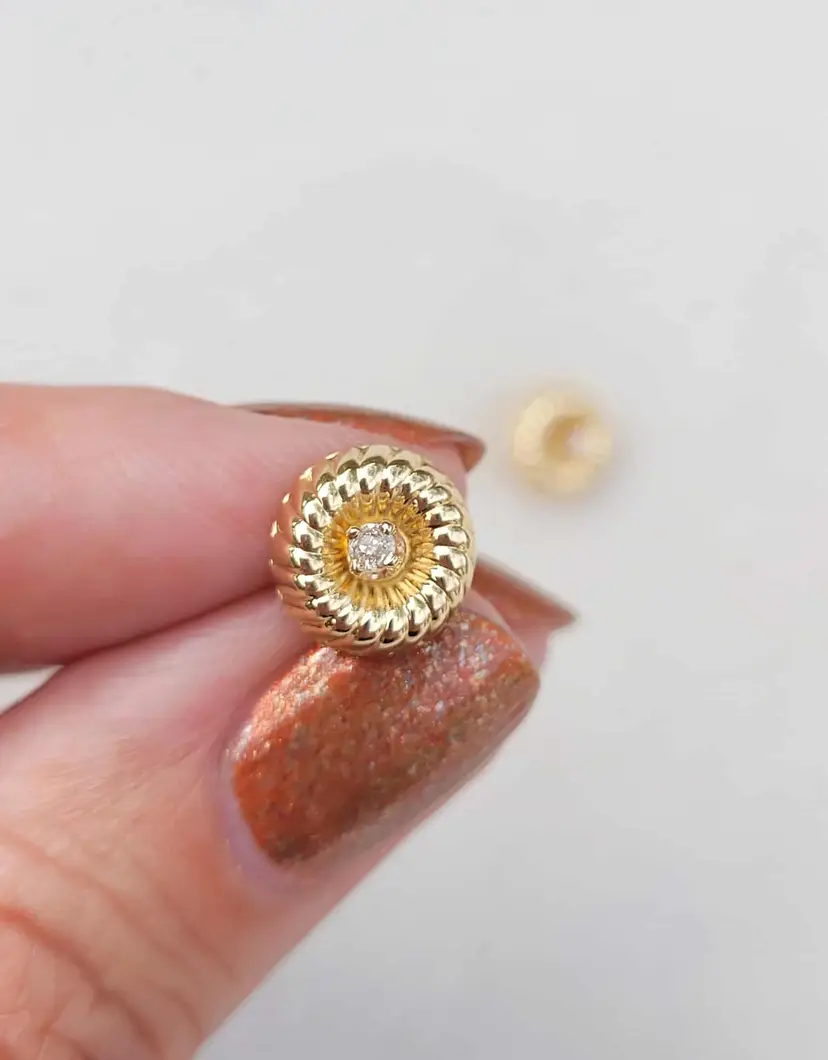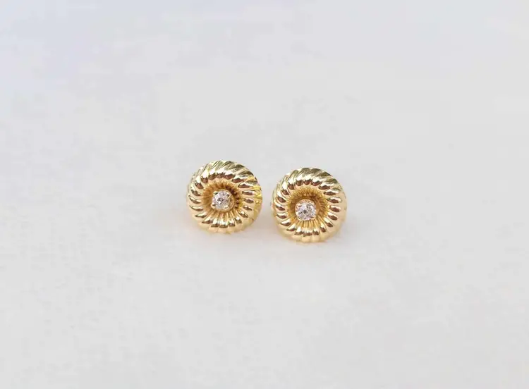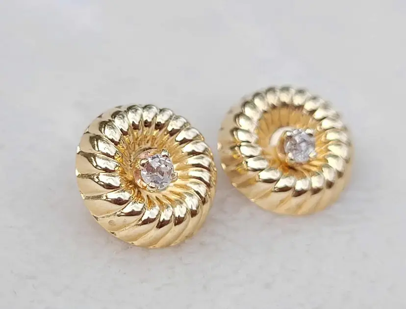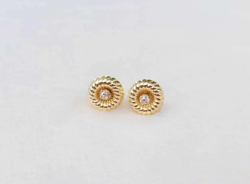 This is a really unique set of solid 14k stud earrings with a swirling design plate that can be inserted with the stud for a more flashy mod look, or left off to be converted to simple diamond studs. This 1970s/80s set is in good condition with the metal content verified via Auracle tester and the diamonds verified via Presidium tester. They are natural diamonds as verified via microscopy and UV. Please see pictures for details and measurements.
