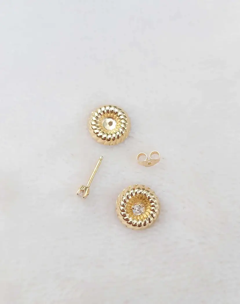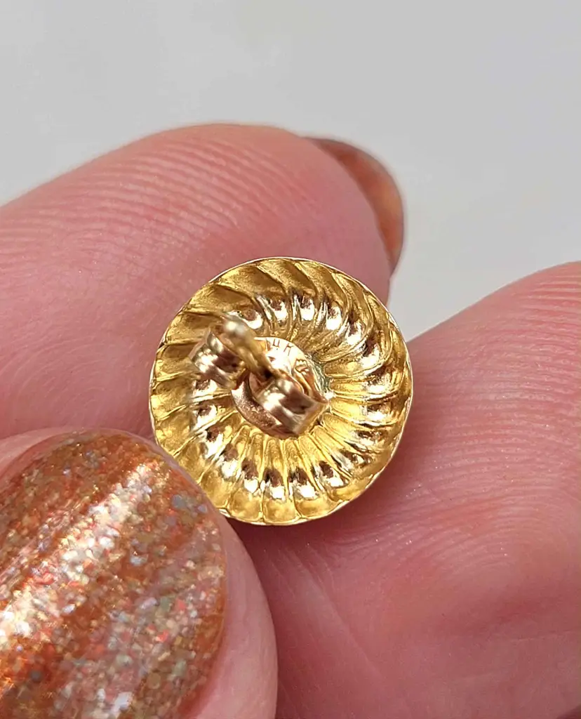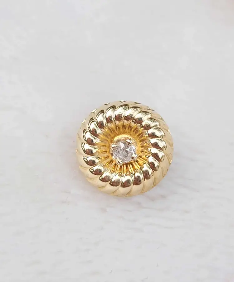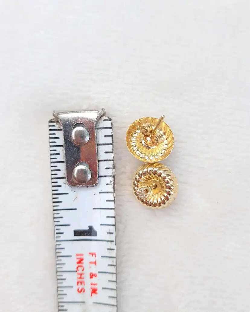 This is a really unique set of solid 14k stud earrings with a swirling design plate that can be inserted with the stud for a more flashy mod look, or left off to be converted to simple diamond studs. This 1970s/80s set is in good condition with the metal content verified via Auracle tester and the diamonds verified via Presidium tester. They are natural diamonds as verified via microscopy and UV. Please see pictures for details and measurements.