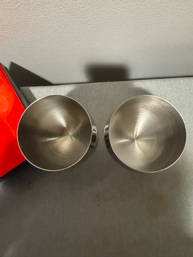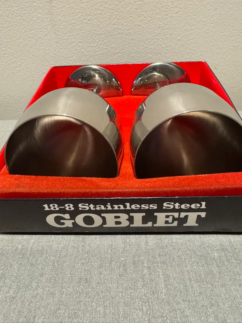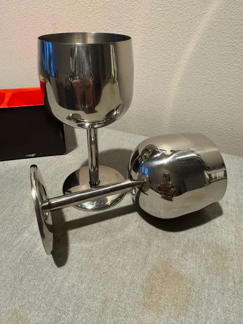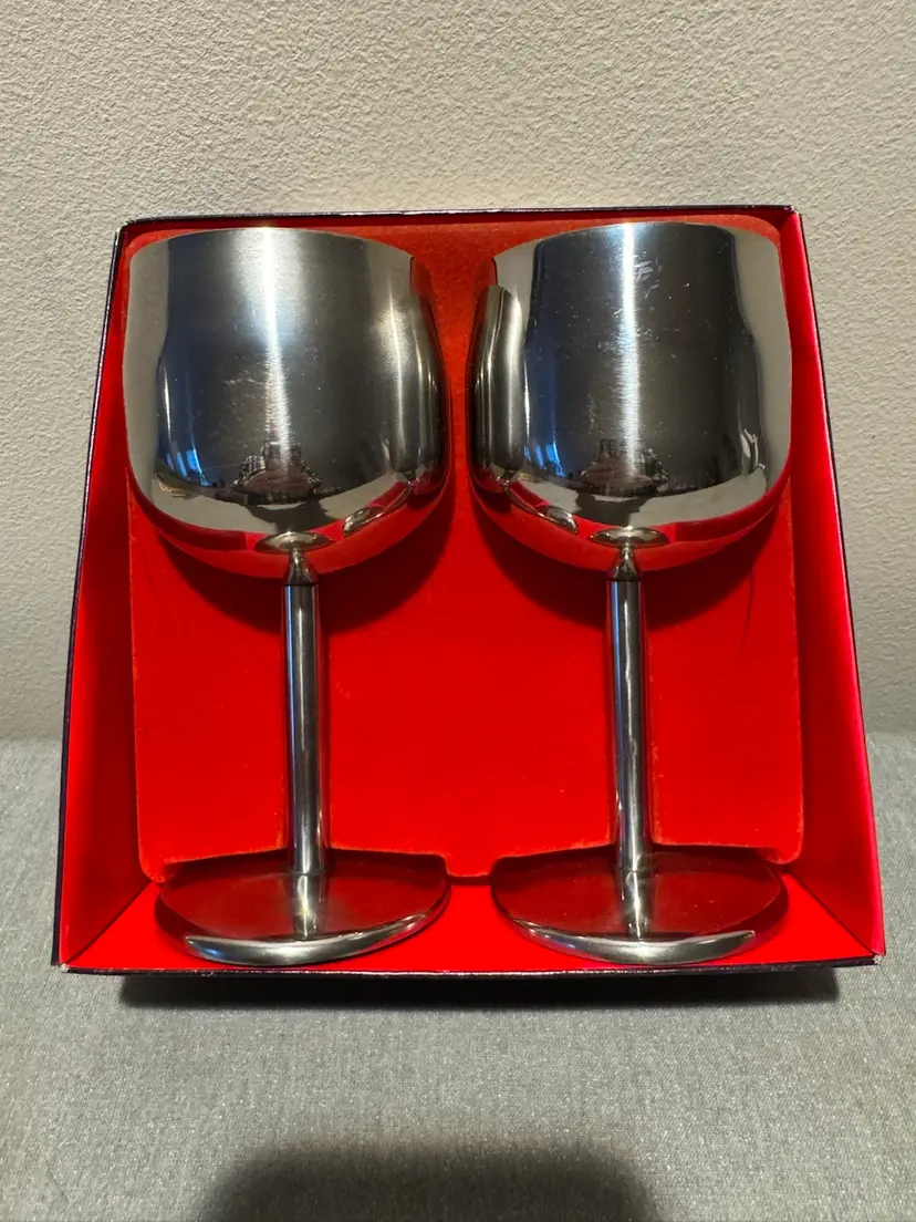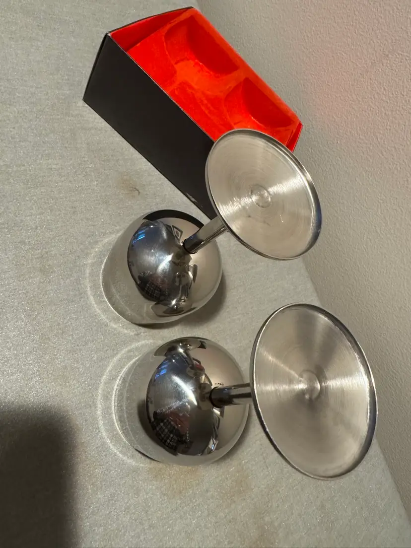 Elegant Vintage 18-8 Stainless Steel Wine glasses set of 2 With box and cover Made in Hong Kong In excellent condition 5.5 tall x 2.5 round