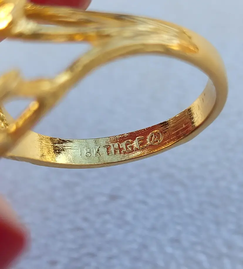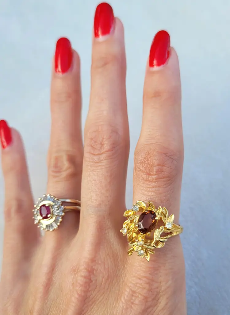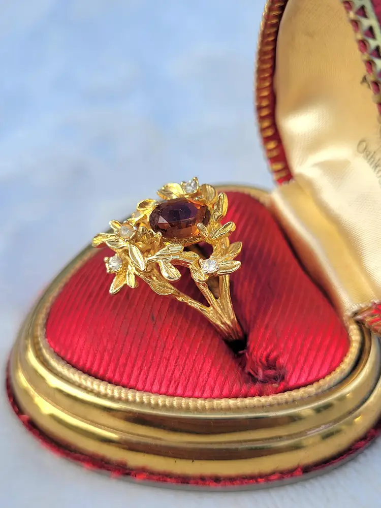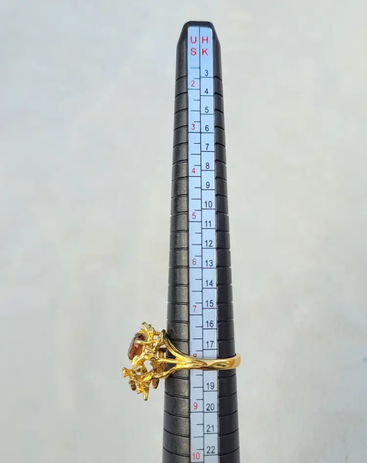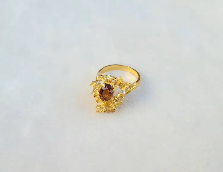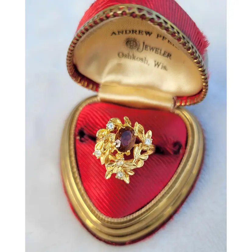 Earthy fall-hued pecan brown center stone with little clear accent crystals in 18k heavy gold electroplated metal. This is from an estate and circa 1970s. It's in good condition, please see pictures for details. Does not include my ring box.