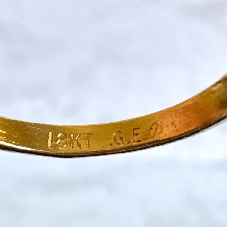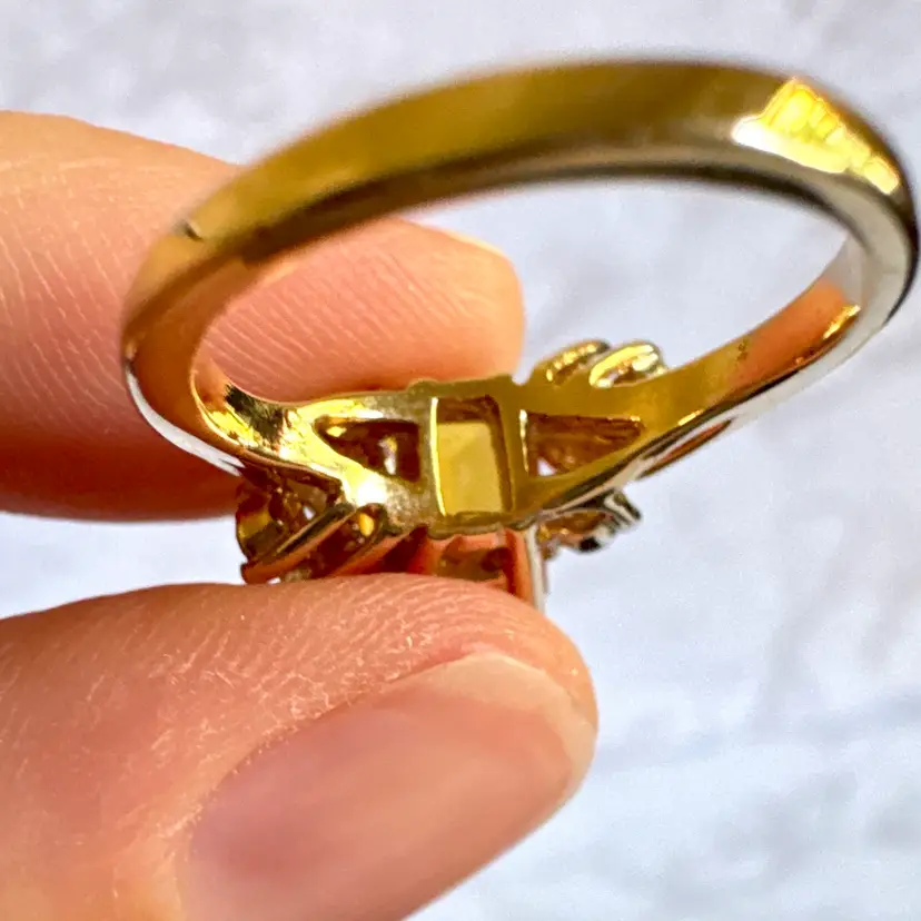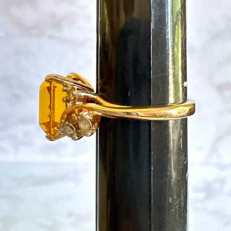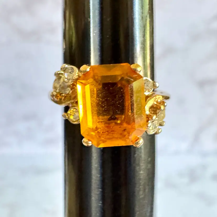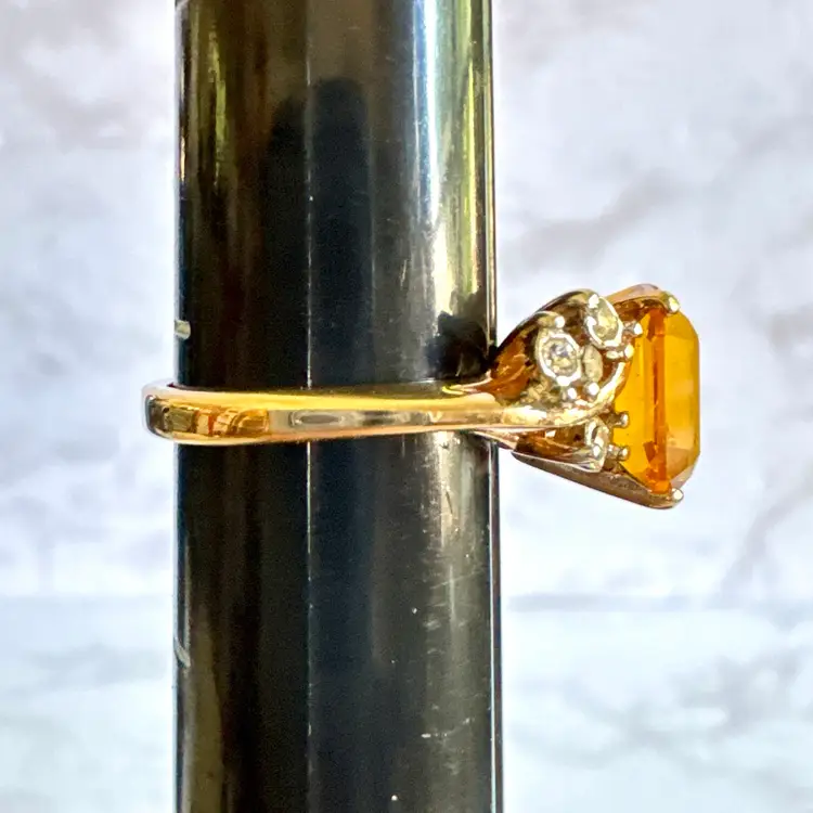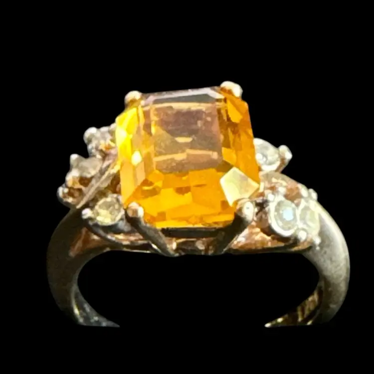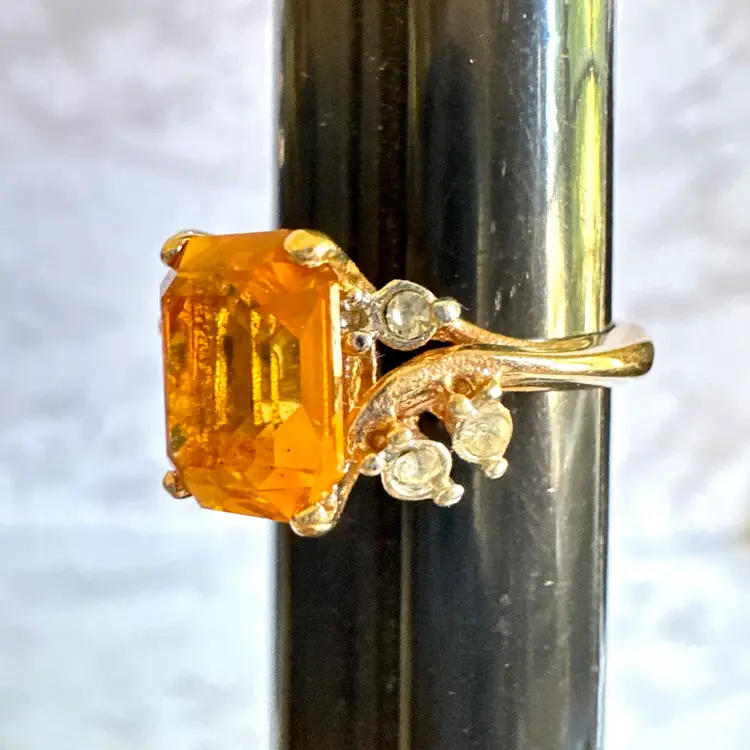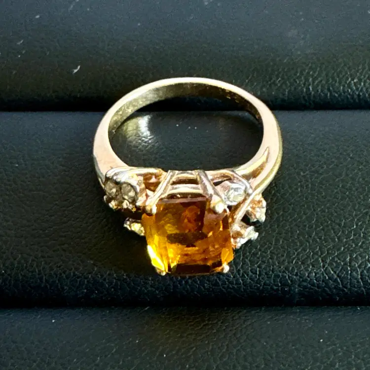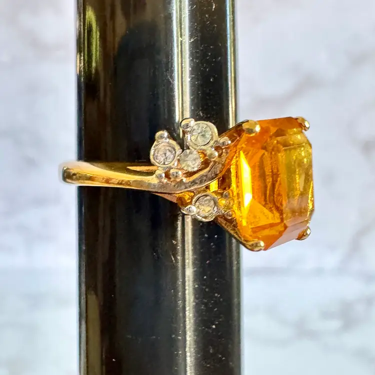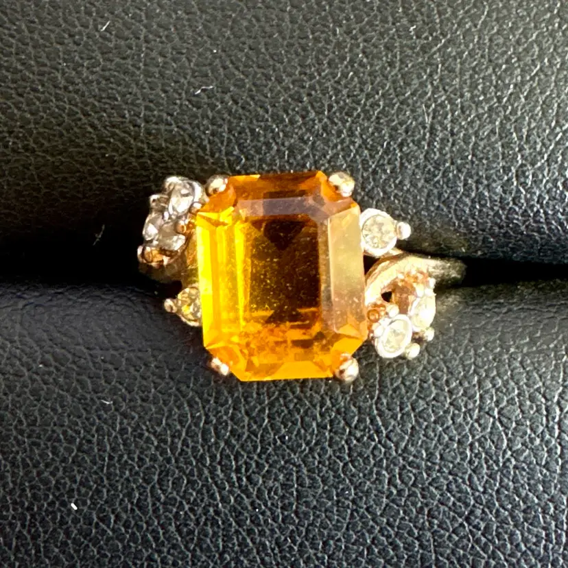 Vintage ring marked 18KGE with citrine and clear stones. Size 6.25—perfect for vintage jewelry enthusiasts.