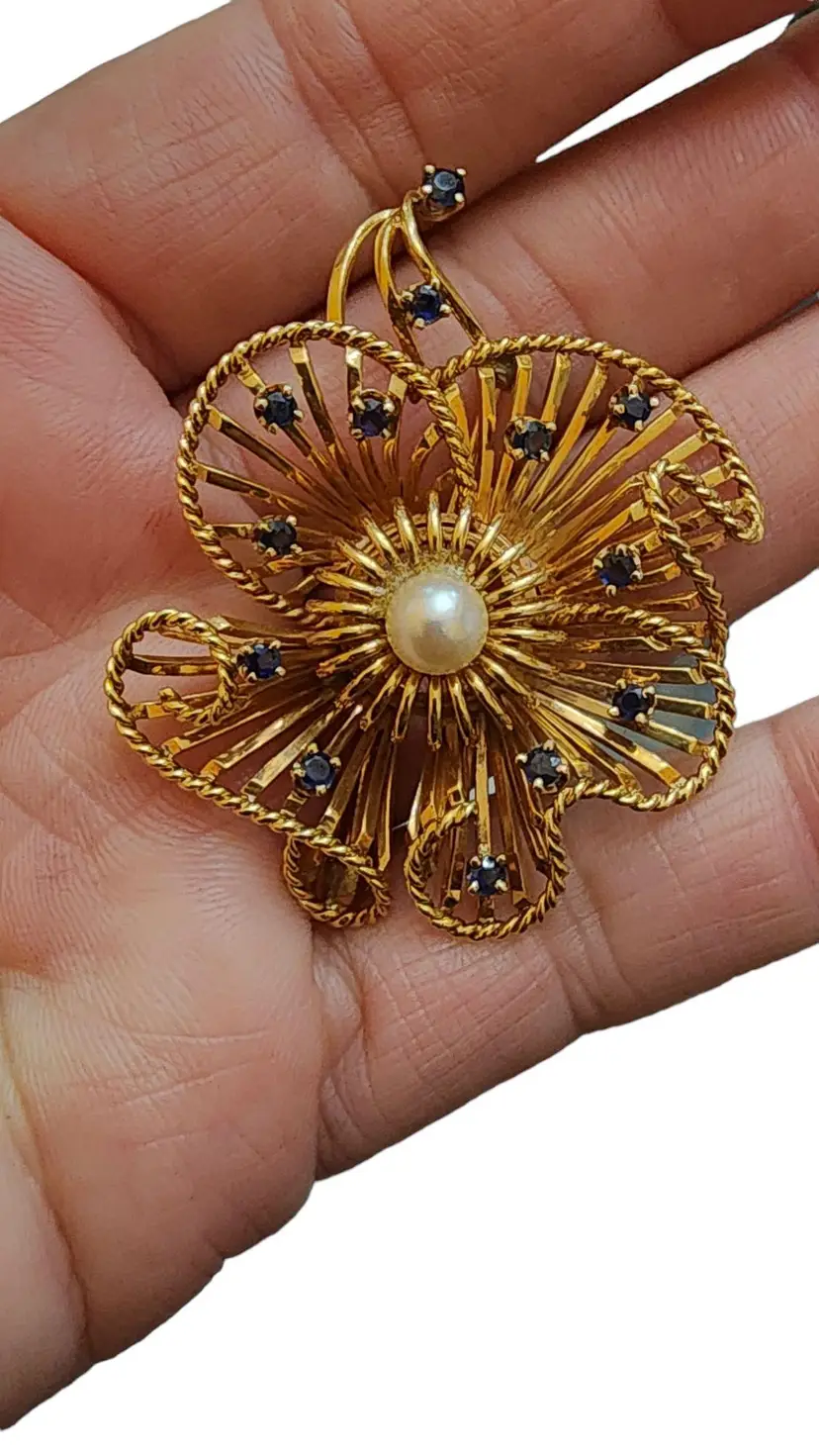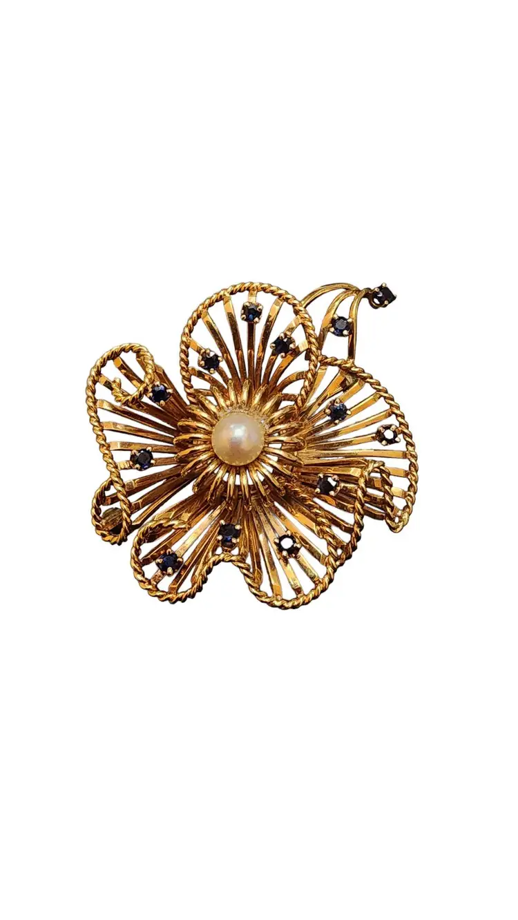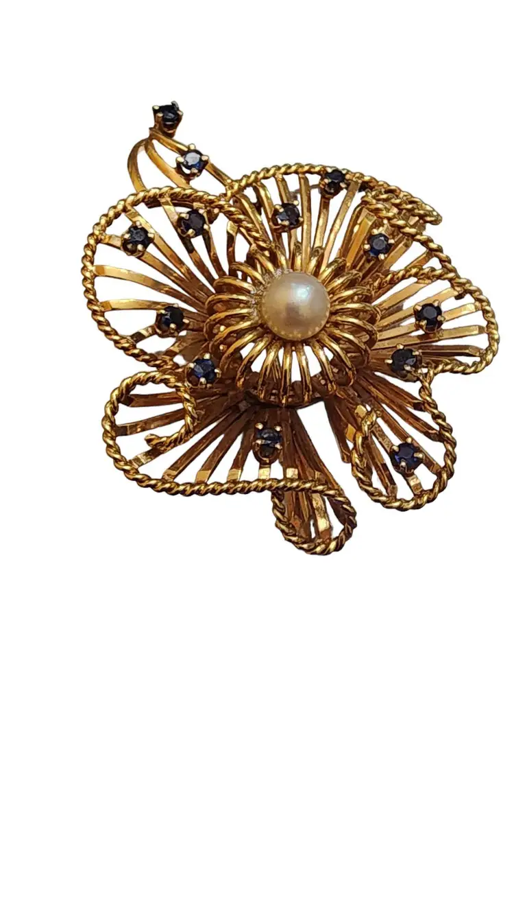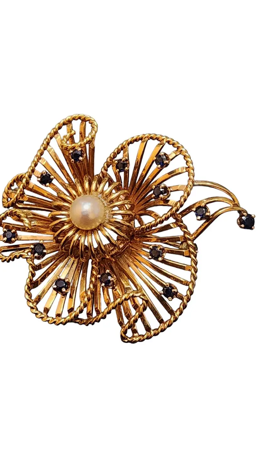 Vintage 18kt Gold Sapphire & Pearl Dimensional Brooch (A2560)