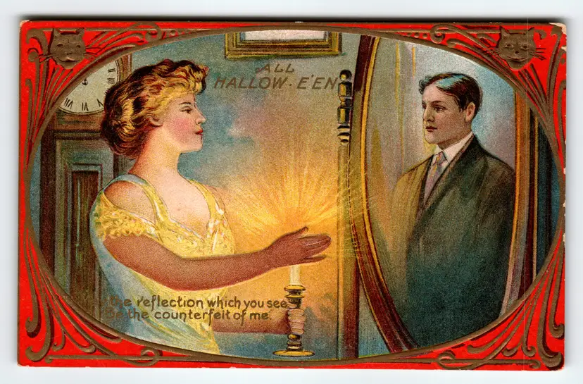 This original vintage Halloween postcard from the Divided Back era (1907-1915) features a captivating lithograph print of a young woman holding a candle, gazing into a mirror that reflects a man in a suit. The scene is framed with a striking red border embellished with embossed black cat faces, adding to its holiday charm and collectible appeal. The card is a standard size (approximately 5.5 x 3.5 inches) and exhibits embossed detailing around the edges, enhancing its tactile and visual appeal.